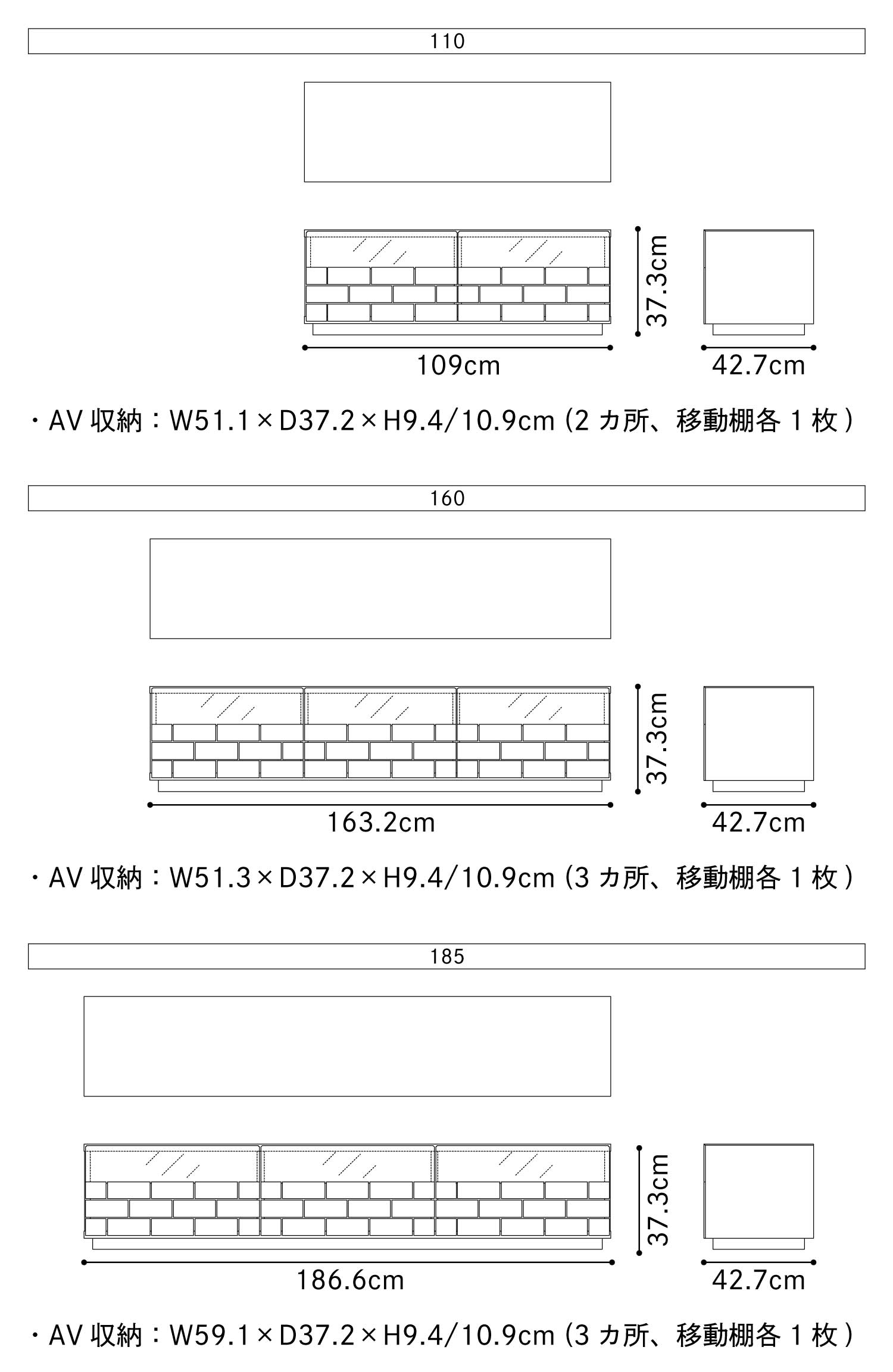 | サイズ | 110 : W109×D42.7×H37.3cm 160 : W163.2×D42.7×H37.3cm 185 : W186.6×D42.7×H37.3cm 脚高さ : 4cm (どのサイズも共通です) |
