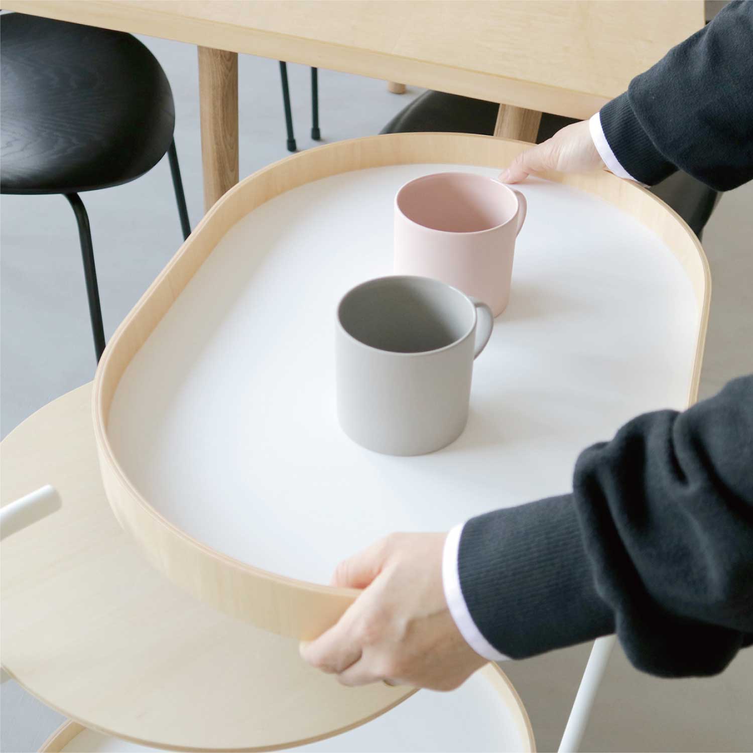 上下段とも取り外しができる木のトレーの機能性や、キッチンとダイニングルームをつなぐモビリティ、日本の居住空間になじみやすい少し小さめのサイズ。