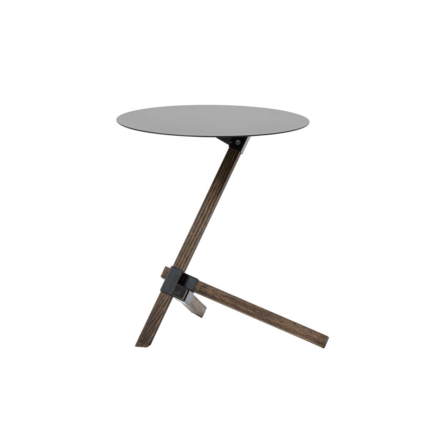 TRE SIDE TABLE(トレ サイド テーブル)は、スチール製の薄く丸い天板と、足部分の3本からなるオーク無垢材の組み合わせが特徴的。足のアシンメトリーな組みは見る角度によって全く違う表情を見せ、アーキテクトな構造でまさに小さな建築物のような世界が楽しめるサイドテーブルです。