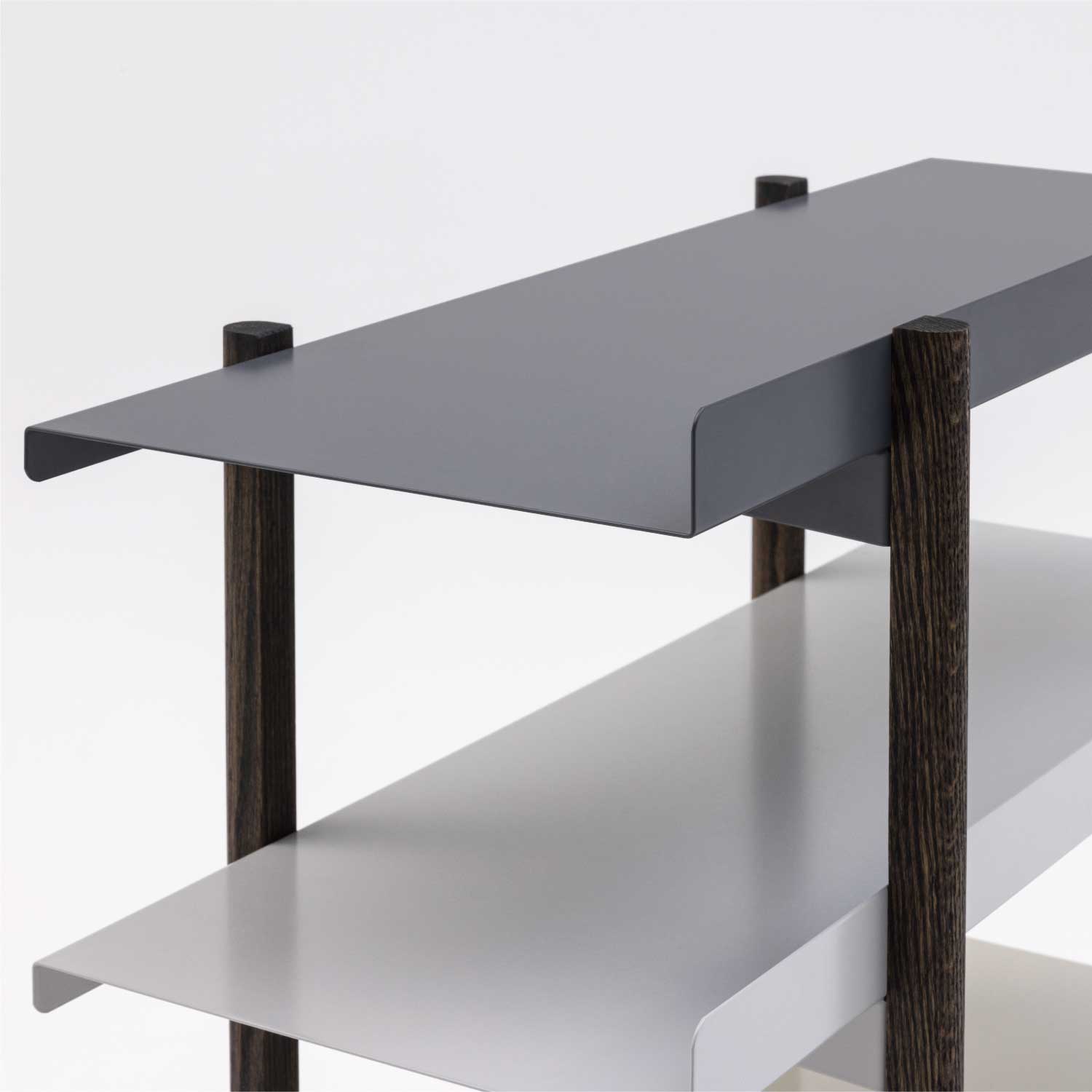 スチール素材は構造材として強度に優れているため、薄くても丈夫な特性があります。数段にデザインされたシェルフは、ものをある程度乗せて使用することからさらに強度を持たせるべく、2ヶ所を折り曲げることで補完しています。また、同じ向きに曲げずとも強度は同じように保つことができるので、デザイン性と機能面から前面は下方向に、背面は上方向に折り曲げ、オリジナリティのある表情を作り出しています。