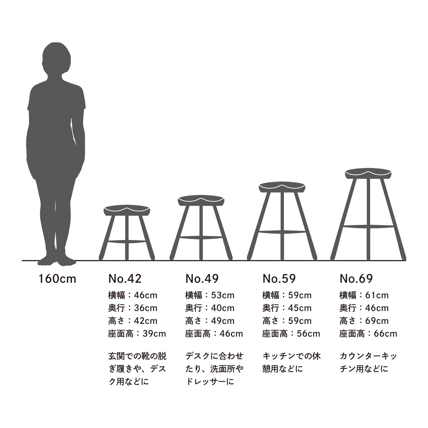 サイズ | No.49 : W53 × D40 × H49cm | SH46cm No.59 : W59 × D45 × H59cm | SH56cm No.69 : W61 × D46 × H69cm | SH66cm |