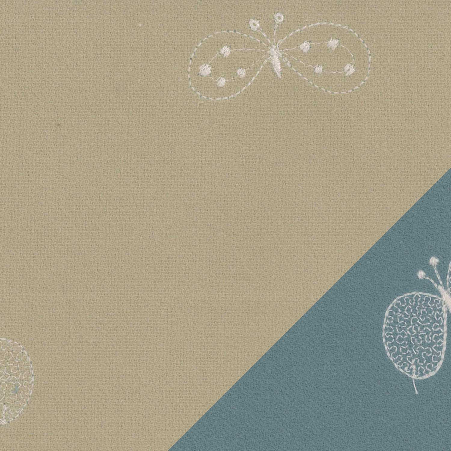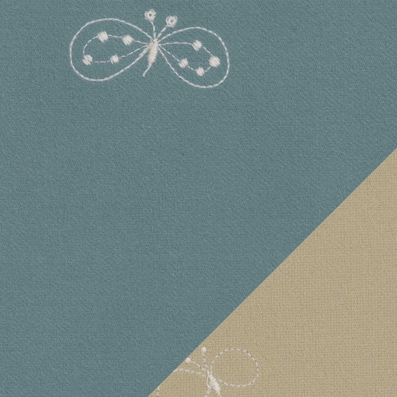 当店でお取り扱いするミナペルホネンの生地(タンバリン、チョウチョ、ライトベリー)は、すべて ダブルフェイス(両面使える構造) のテキスタイルです。これは、表と裏でカラーが異なる2面を持つ仕様となっており、どちらの面を「表(前面)」として使うかをお選びいただけます。左上に表面、右下に裏面の生地を表示しております。