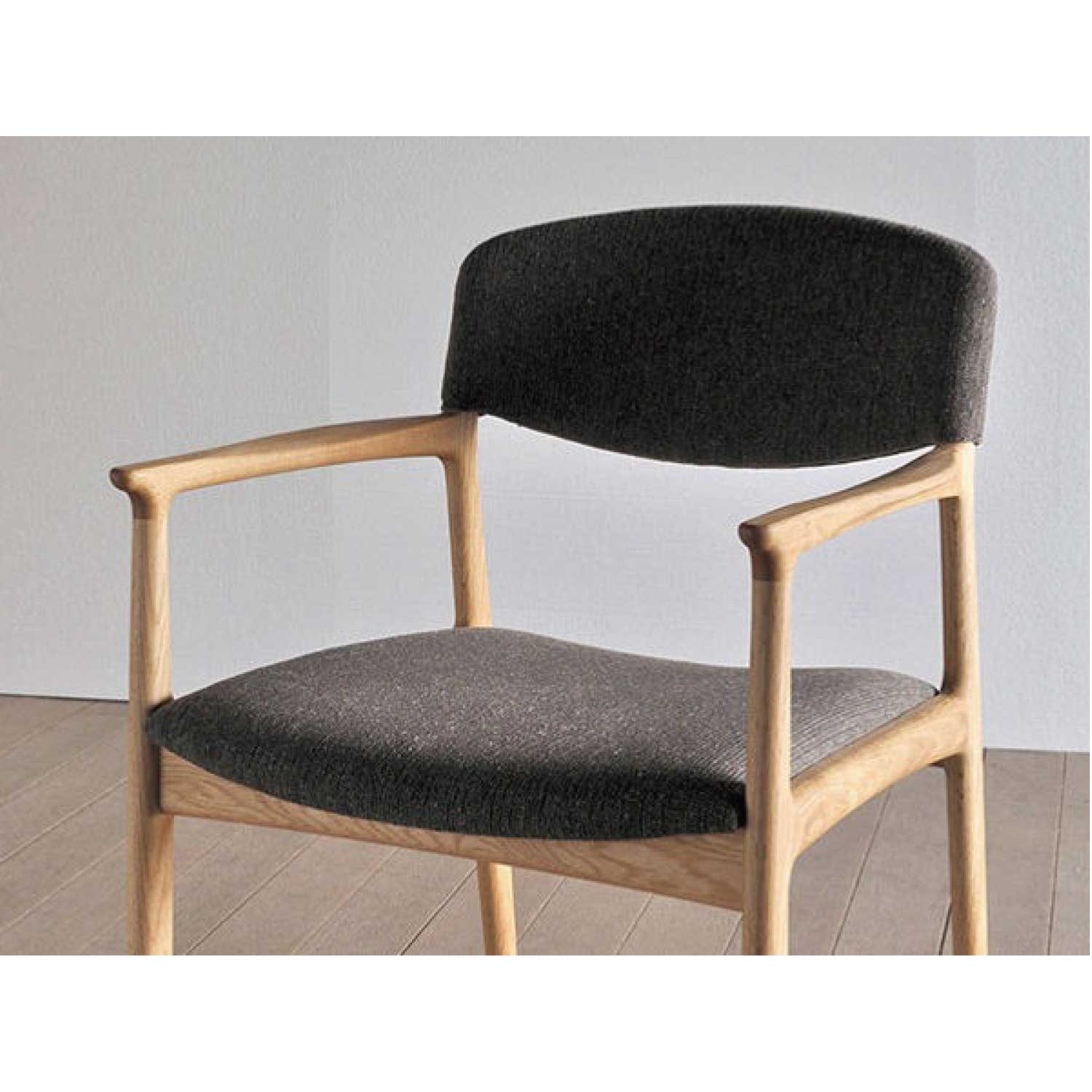 ムク材を削り出し、手仕事で仕上げた軽快なイメージのアームチェアです。柔らかな手触りと、ギリギリまで細身に仕上げたフォルムが特徴。貼り込まれた大きなカーブの背と座もゆったりと身体を受け止めてくれます。材は4種類より。張り地もいろいろと揃えられています。