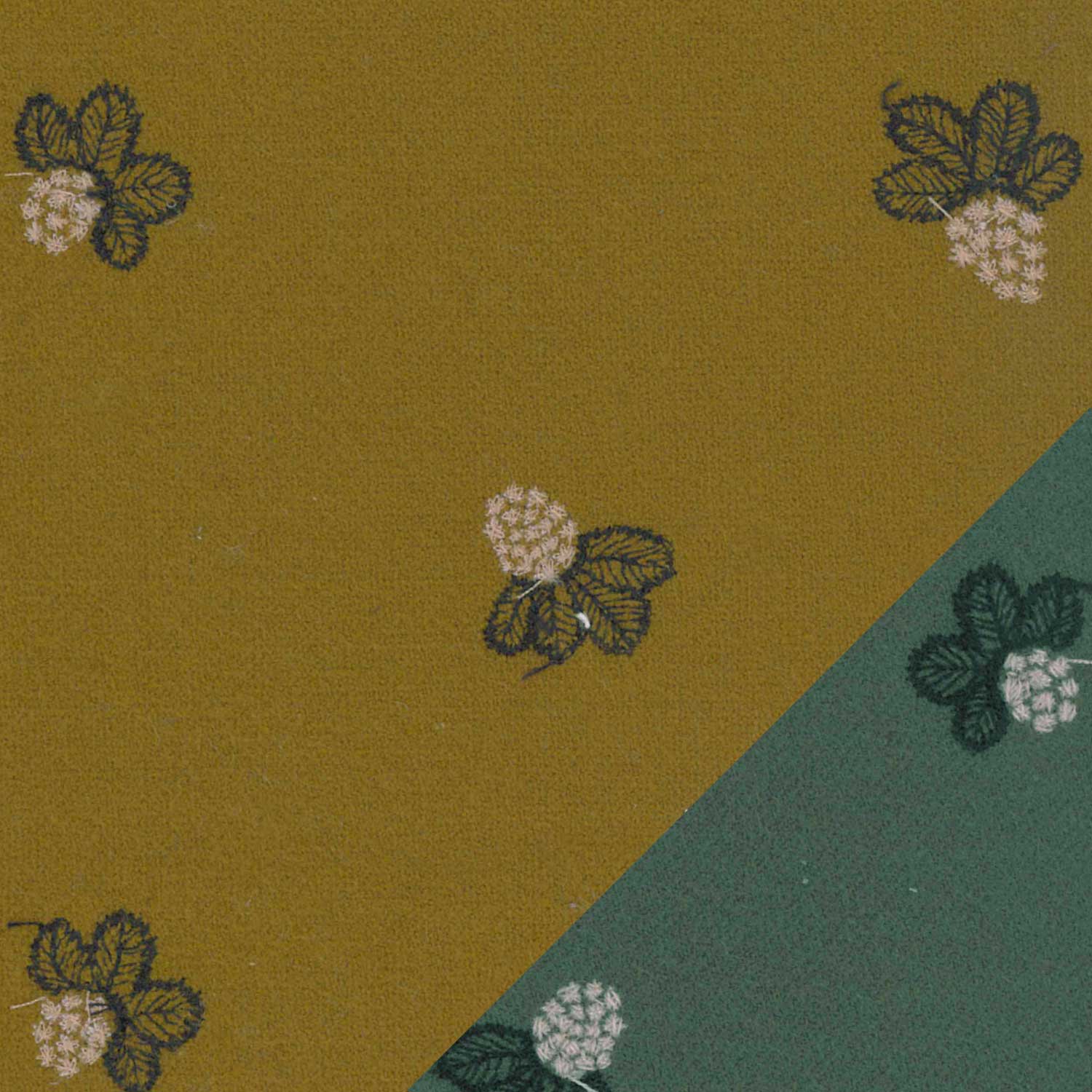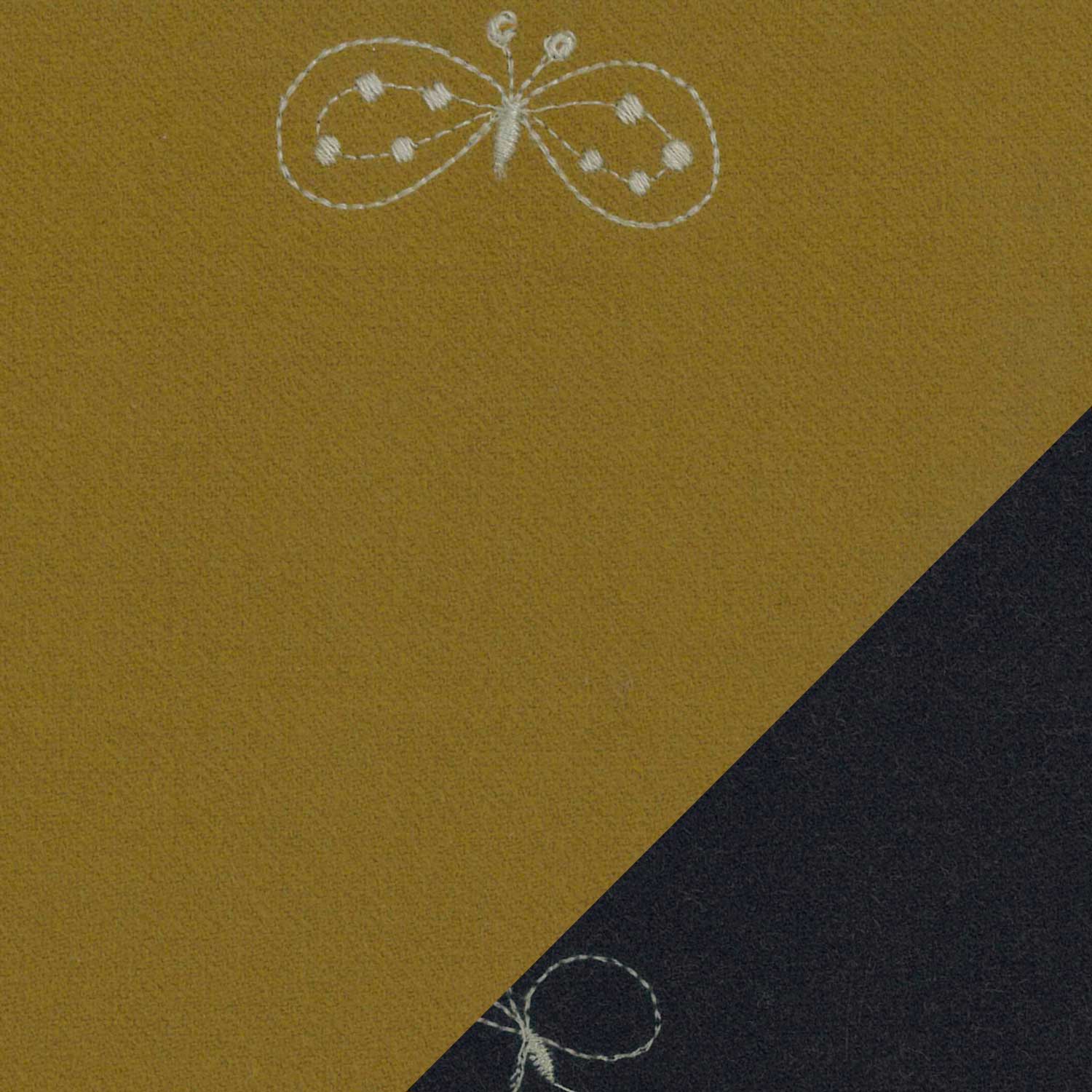当店でお取り扱いするミナペルホネンの生地(タンバリン、チョウチョ、ライトベリー)は、すべて ダブルフェイス(両面使える構造) のテキスタイルです。これは、表と裏でカラーが異なる2面を持つ仕様となっており、どちらの面を「表(前面)」として使うかをお選びいただけます。左上に表面、右下に裏面の生地を表示しております。