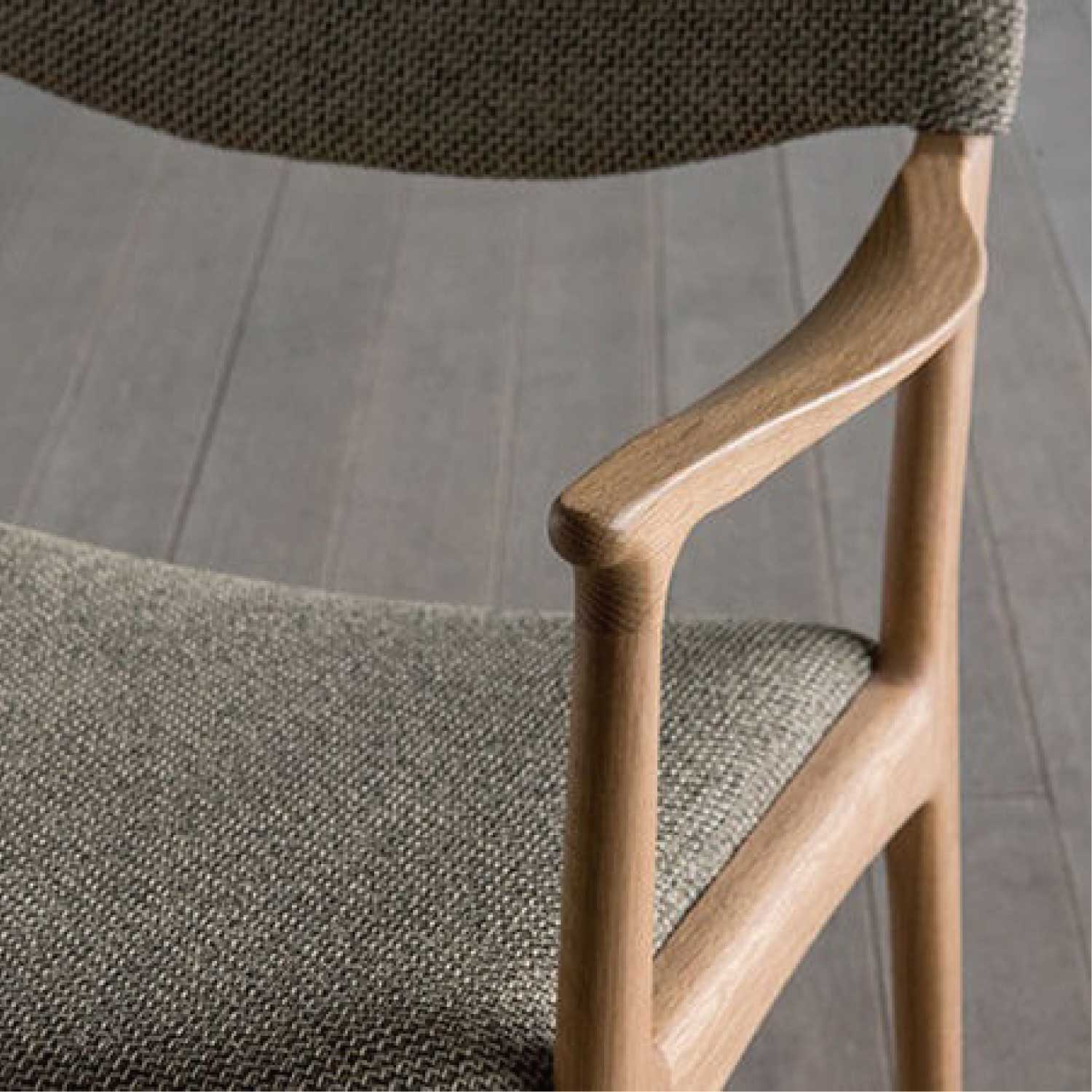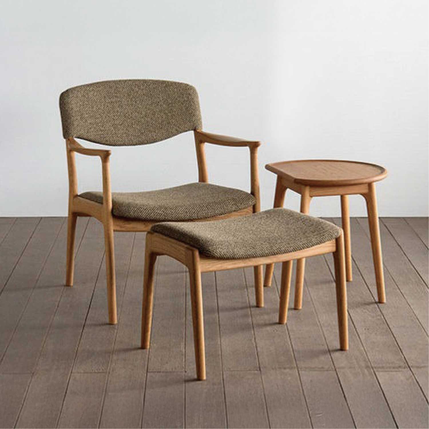 ノースダイニングチェアのラウンジタイプです。ムク材を削り込み細身に仕上げたフレームが軽快です。貼り込まれた大きなカーブの背と座もゆったりと身体を受け止めてくれます。オットマンや、小脇にモノがおけるサイドテーブルも用意されています。材は4種類から選べます。