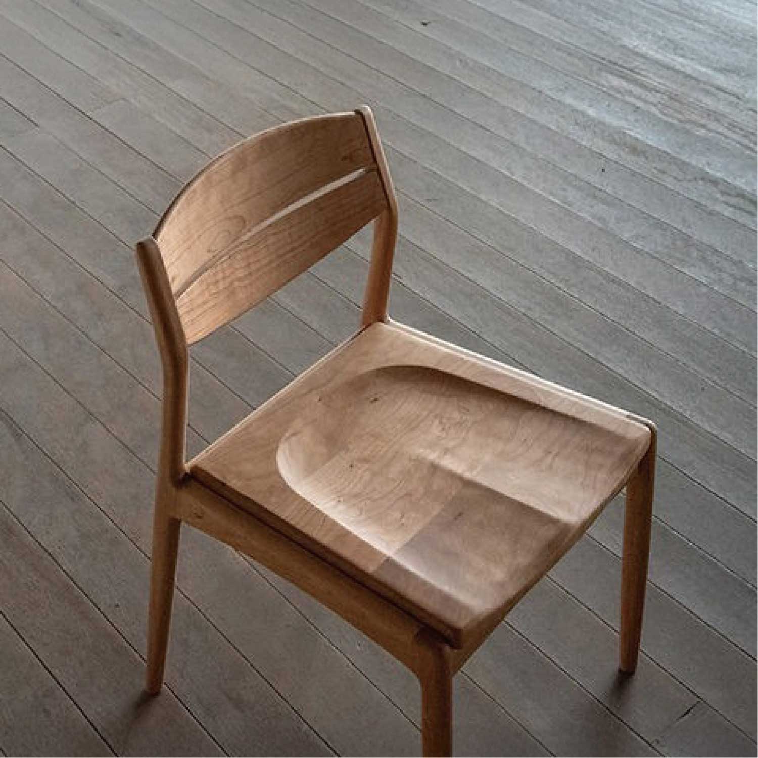 ユーロ・アームレスチェアの板座タイプ。柔らかな手触りと、ギリギリにまで細身に仕上げたフォルムが特徴。曲木の背板と座面のくり抜きが心地よく身体を受けとめてくれます。材は4種類が用意されています。