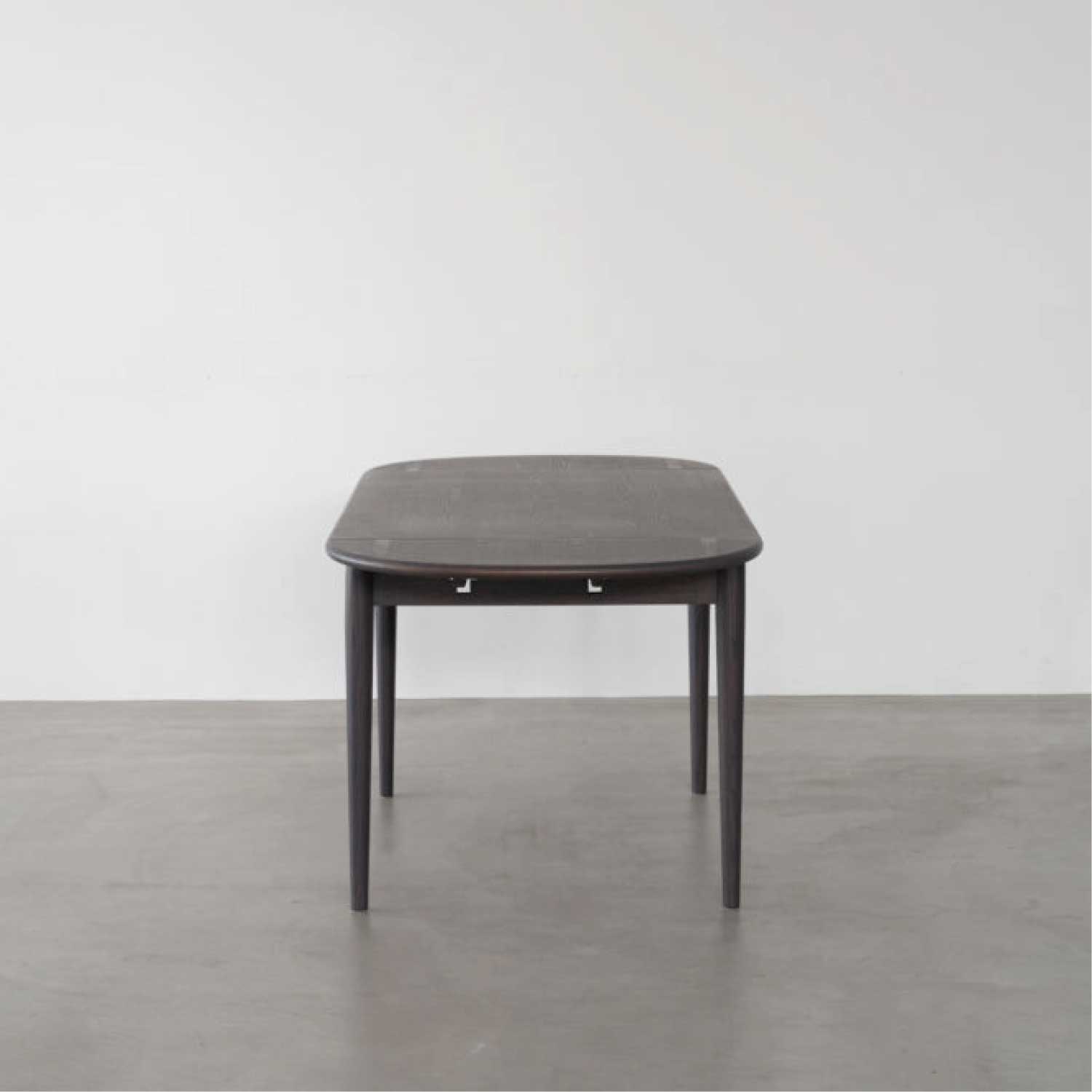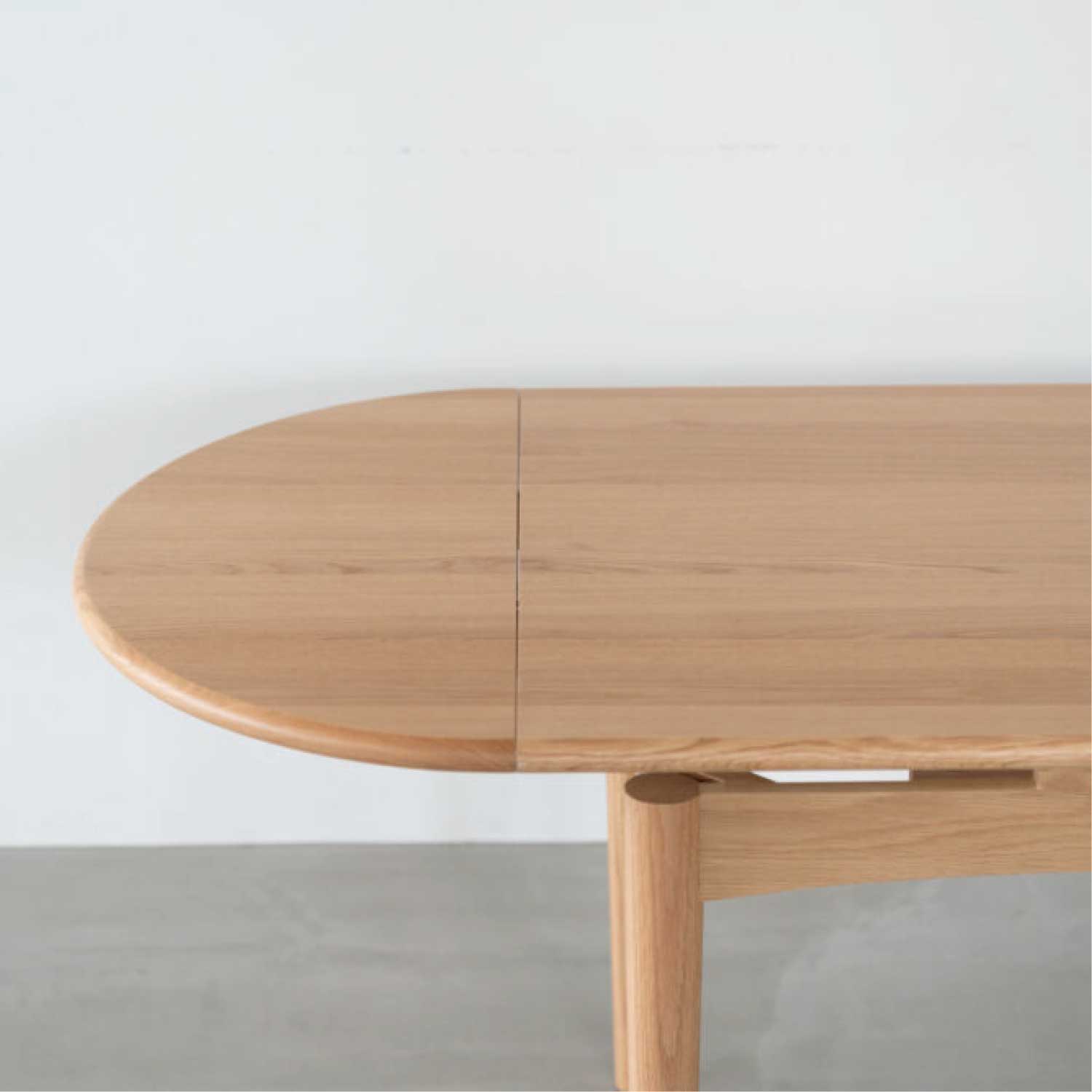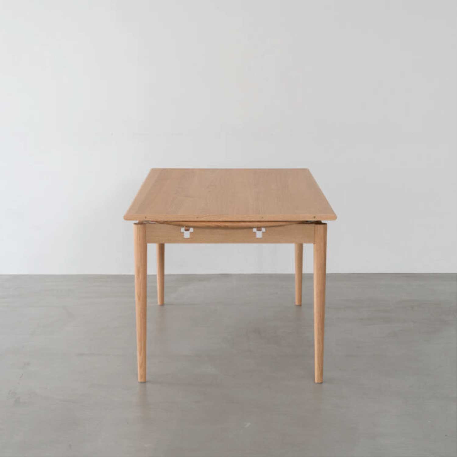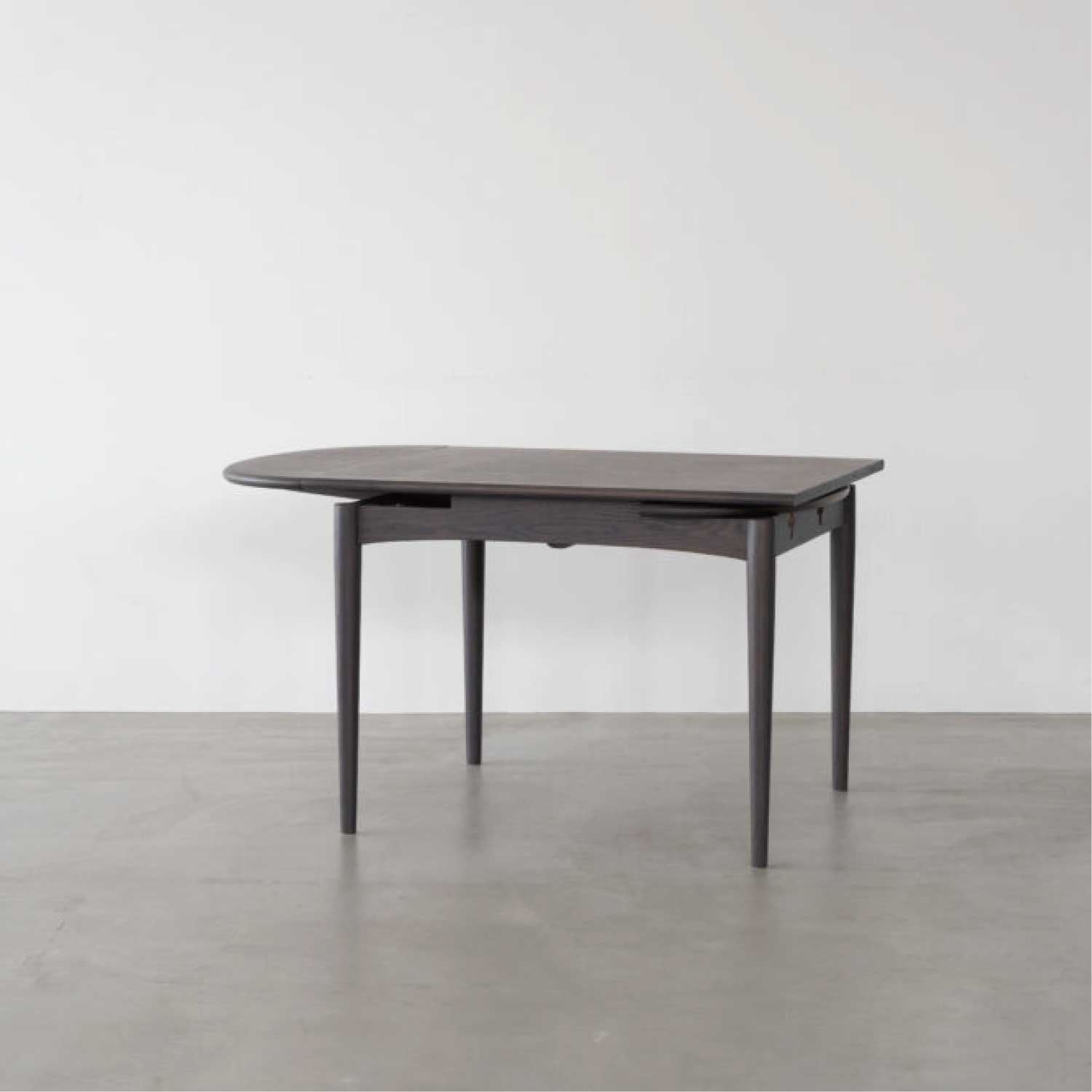 優しいフォルムが特徴の楕円形の伸長式テーブル。伸長天板を引き出して持ち上げるだけで、簡単にサイズを広げることができます。気軽に伸長できる仕様のため、来客時はもちろん、普段の食卓やちょっとした作業台としても活躍します。片側だけを伸長し、半円形スタイルとしてもお使いいただけます。