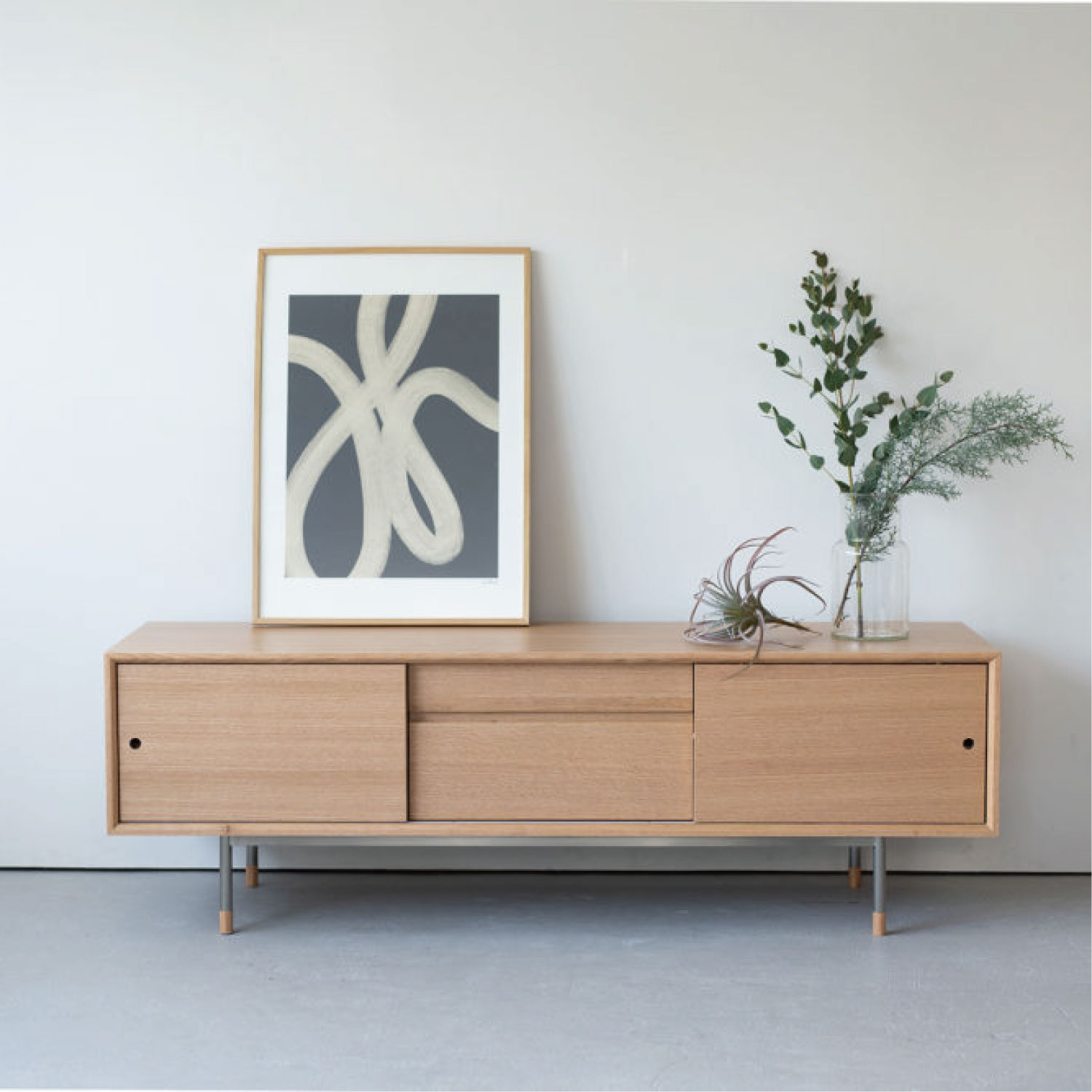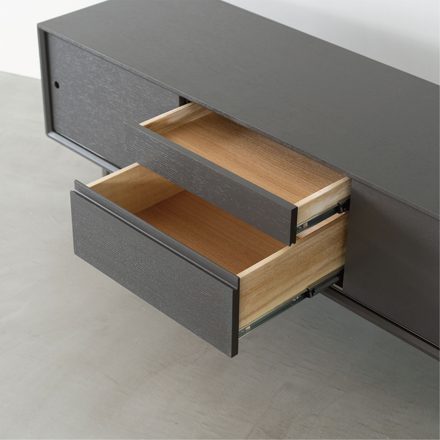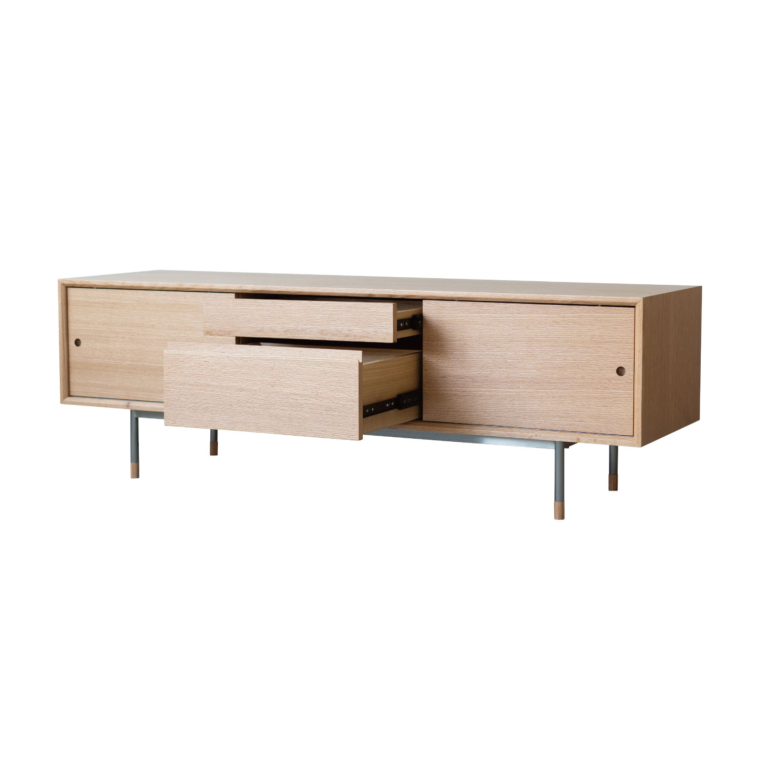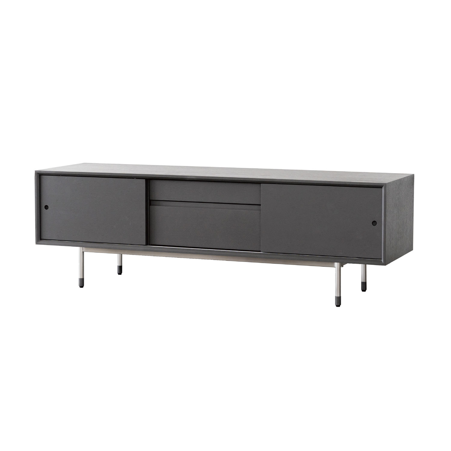 シンプルなオーク材の TV ボード。ステンレスとのコントラストが清潔感のある印象をもたらします。引き戸と引き出しで収納も充実しています。脚先の無垢材がアクセント。