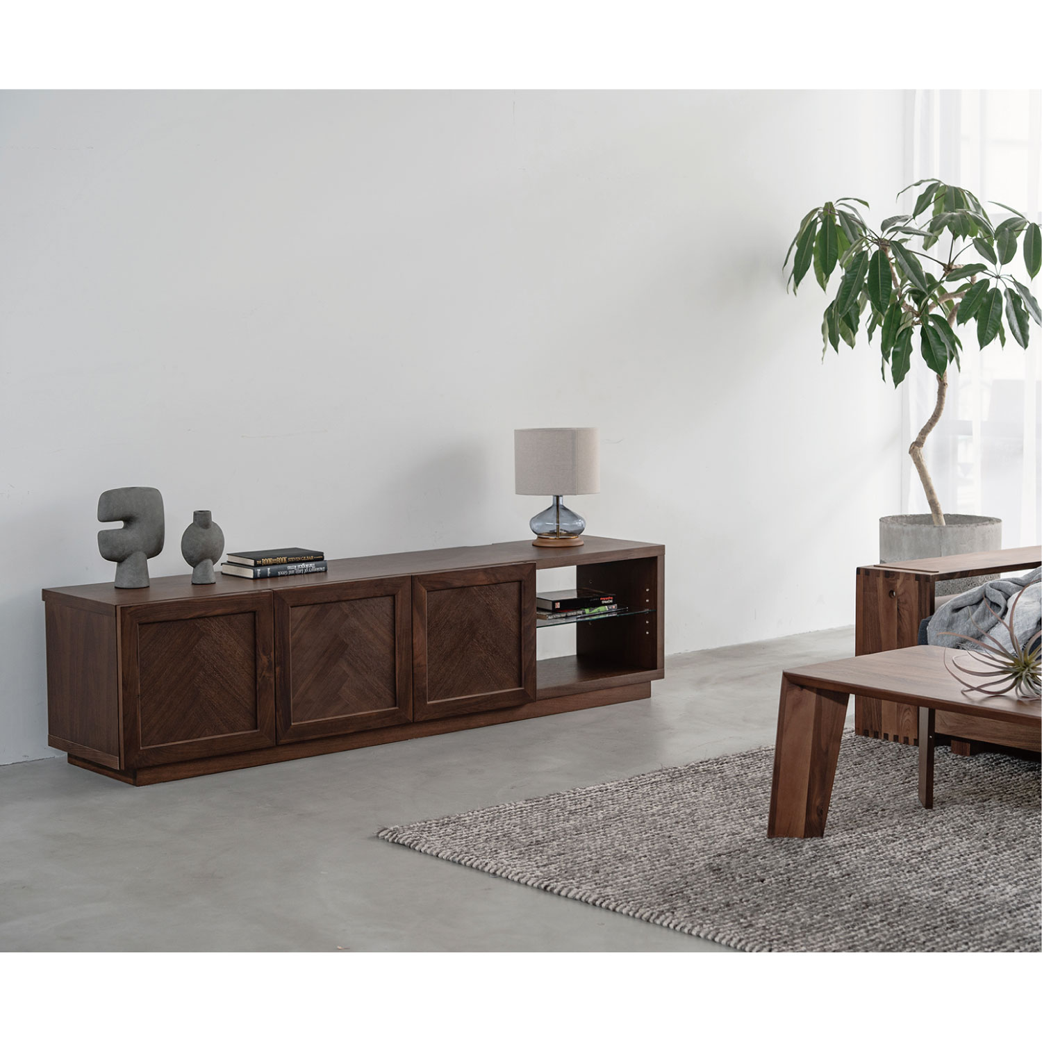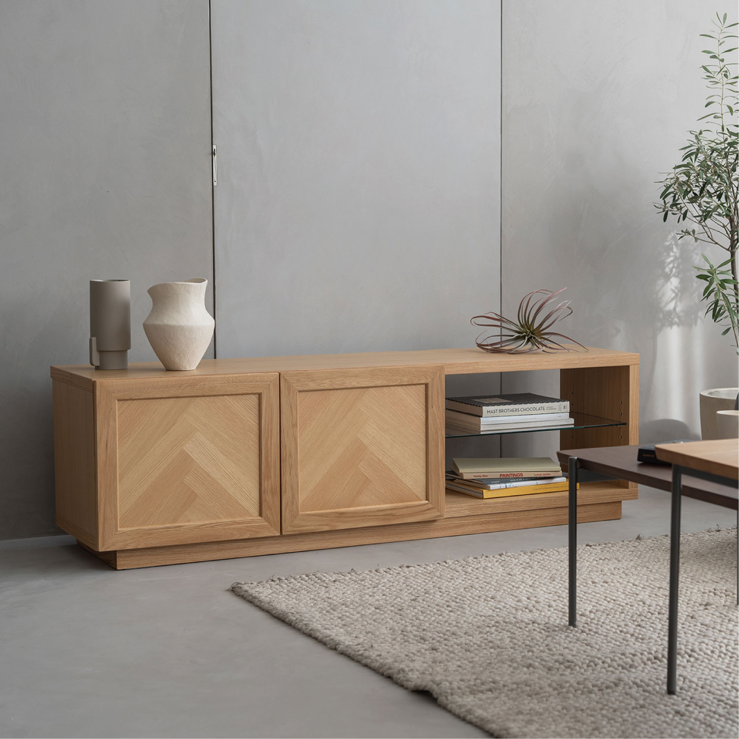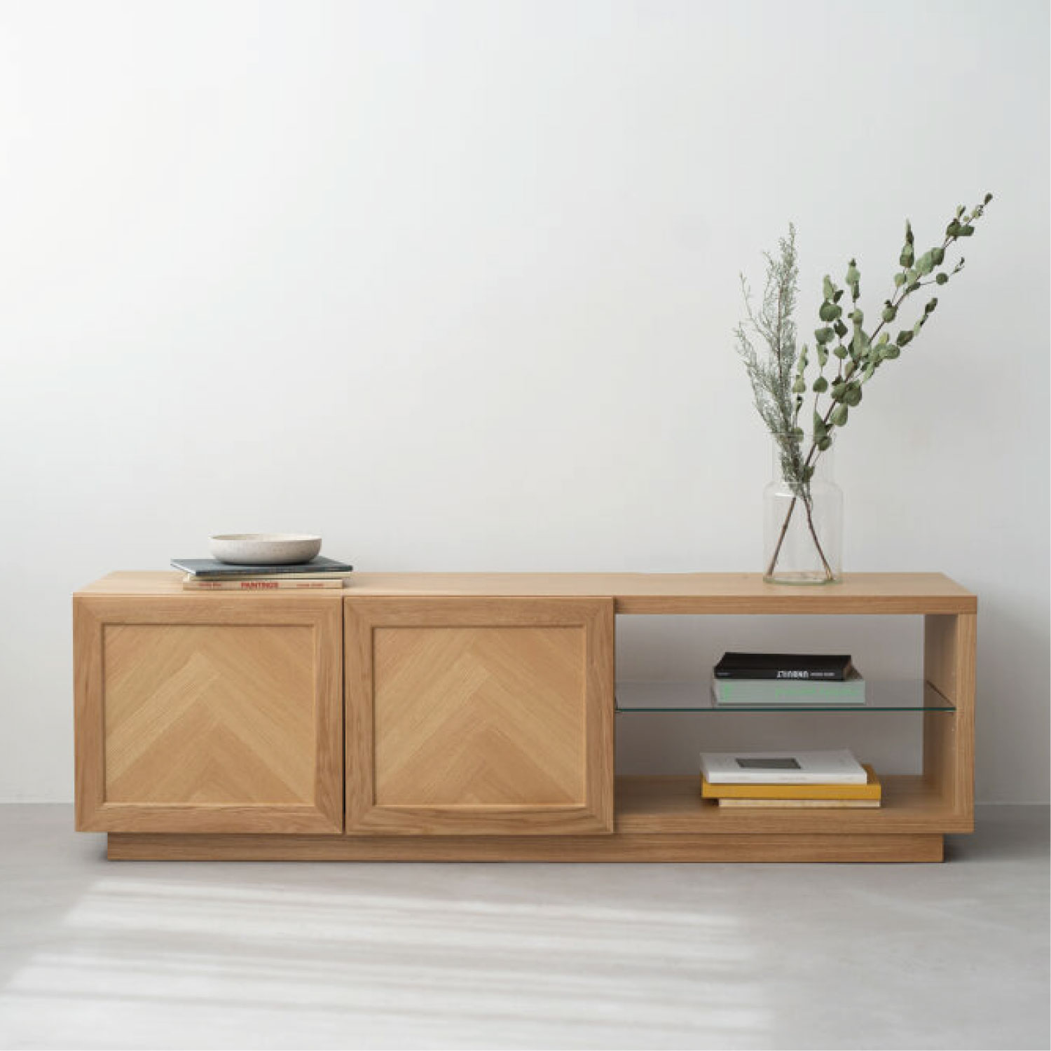 ヘリンボーン柄が特徴のTVボード。シンプルで木の温かみが感じられます。程よく存在感があり、北欧インテリアに合わせやすいデザインです。ヘリンボーン柄に貼り合わせたランダムな木目が単調になりがちな木製の収納家具に深みをあたえてくれます。オープン部にオーディオ機器を収納できます。
