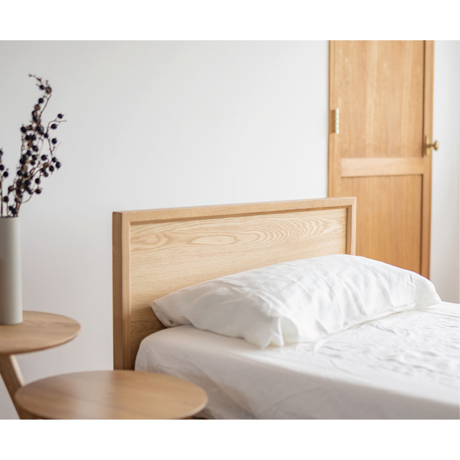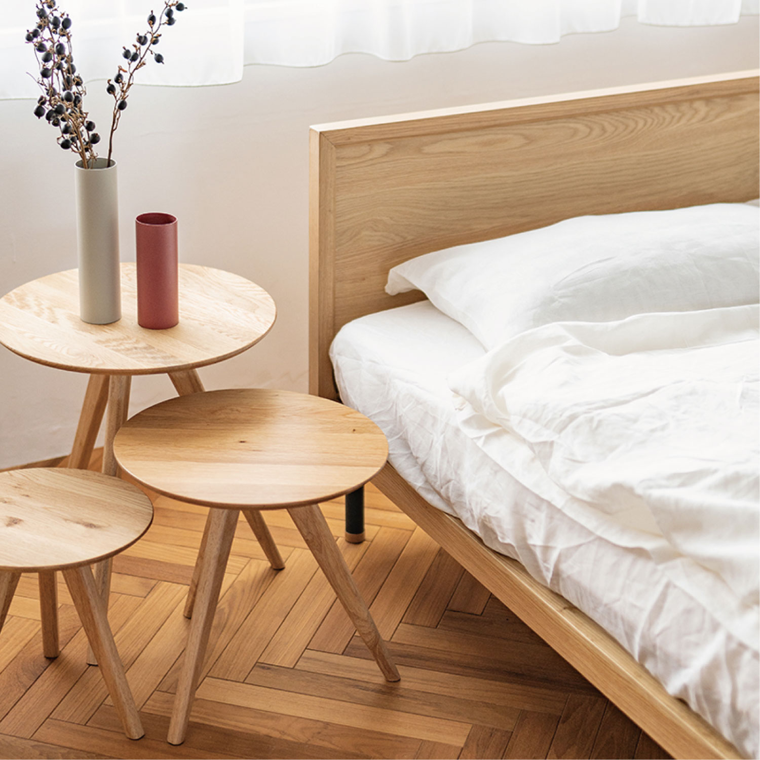 寝室はシンプルで落ち着く空間に。木製のベッドフレームを構造から見直し、よりシンプルで使いやすいベッドフレームを追求しました。フレーム部分は木でありながら、厚みを抑え、すっきりとした印象に。躯体にスチールパイプを採用し、強度面にも配慮し設計されています。スッと伸びた細身のスチール脚は、脚先の無垢がアクセント。ヘッドボードは好みに合わせて4種類の中からお選びいただけます。