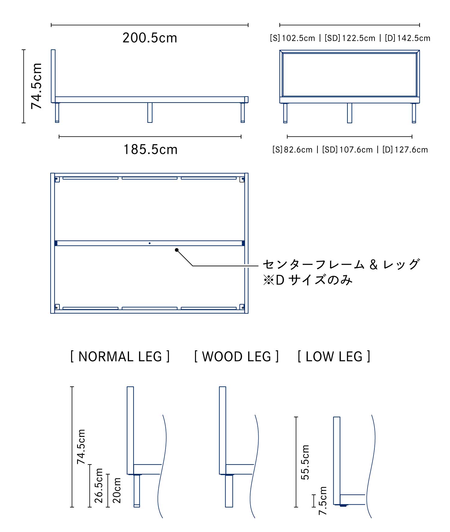 | サイズ | S(シングル):W102.5 × D200.5 × H74.5cm SD(セミダブル):W122.5 × D200.5 × H74.5cm D(ダブル):W142.5 × D200.5 × H74.5cm |
