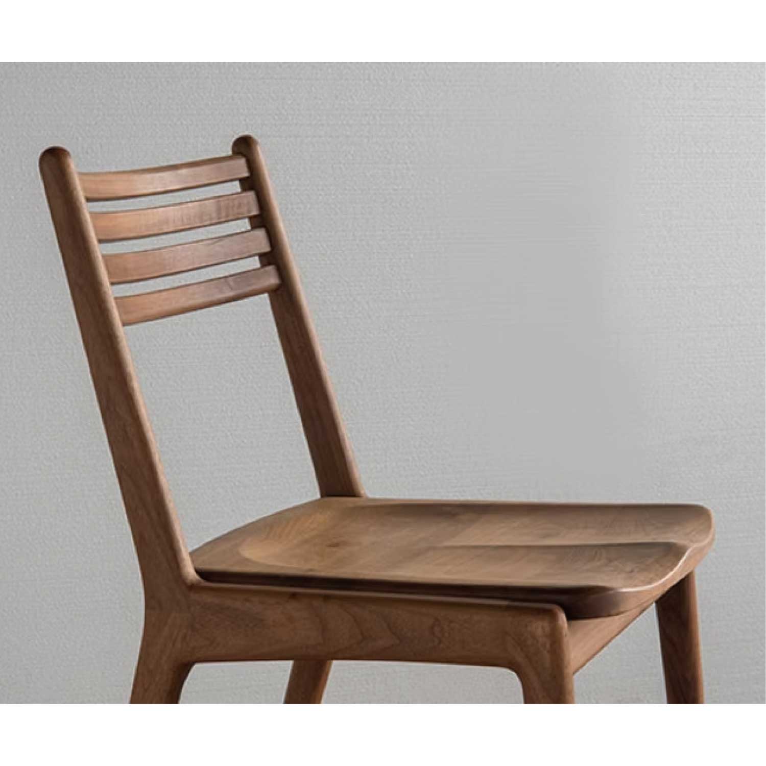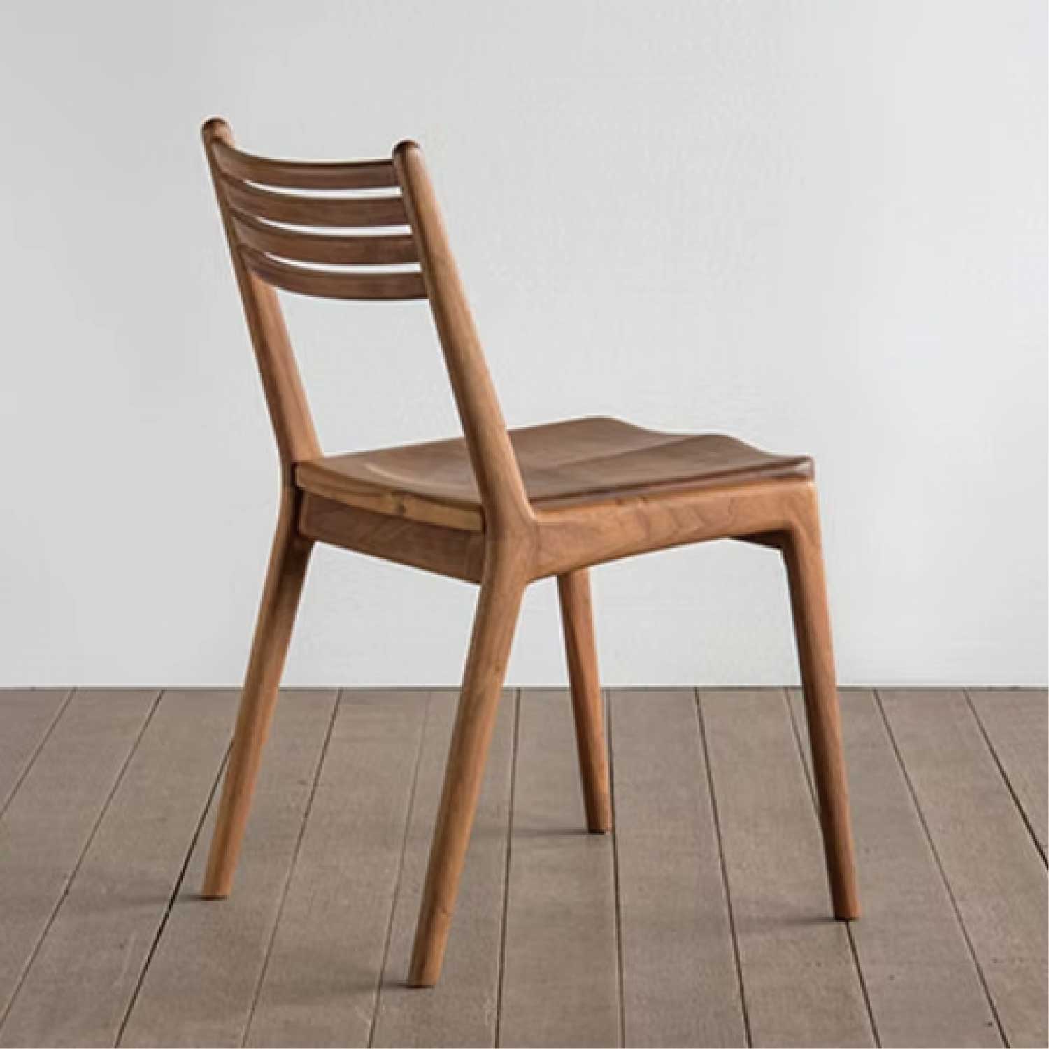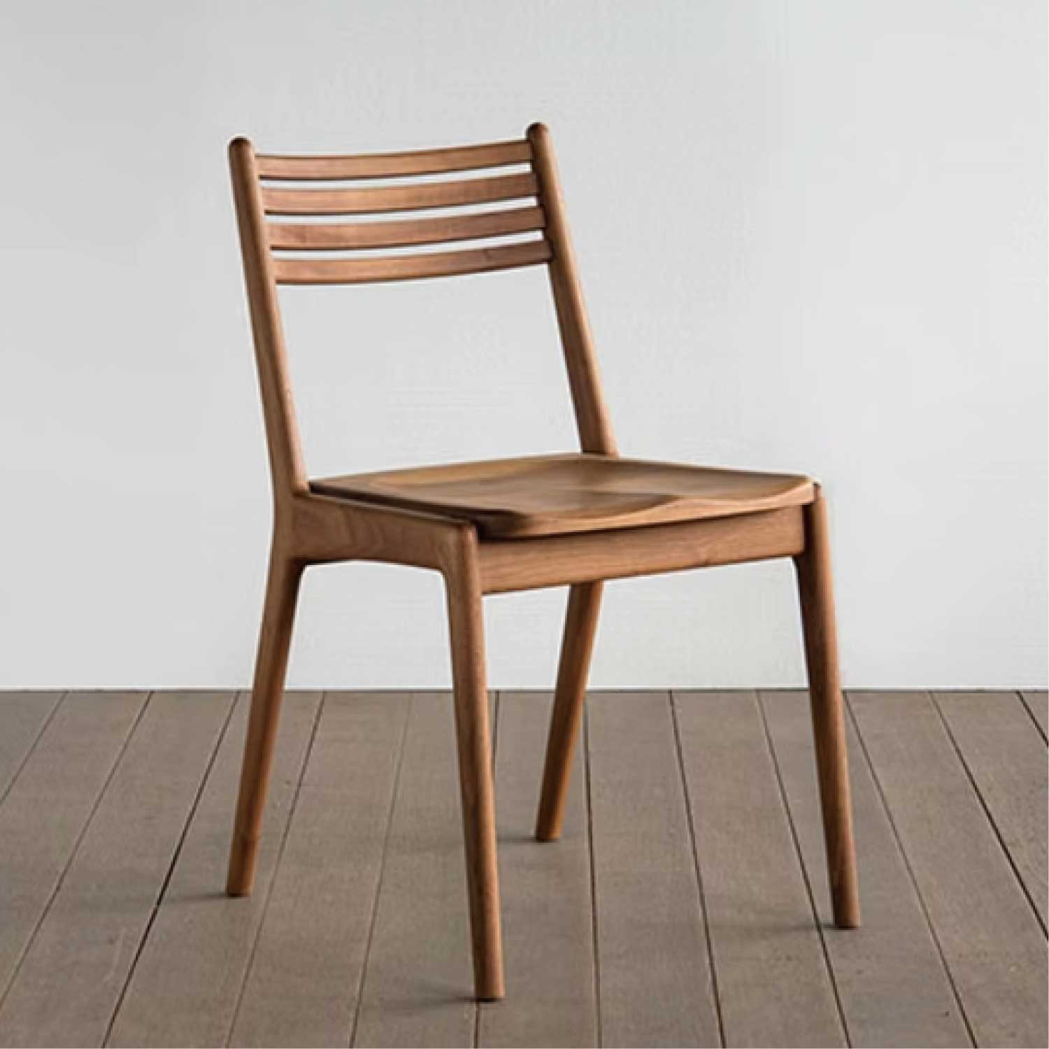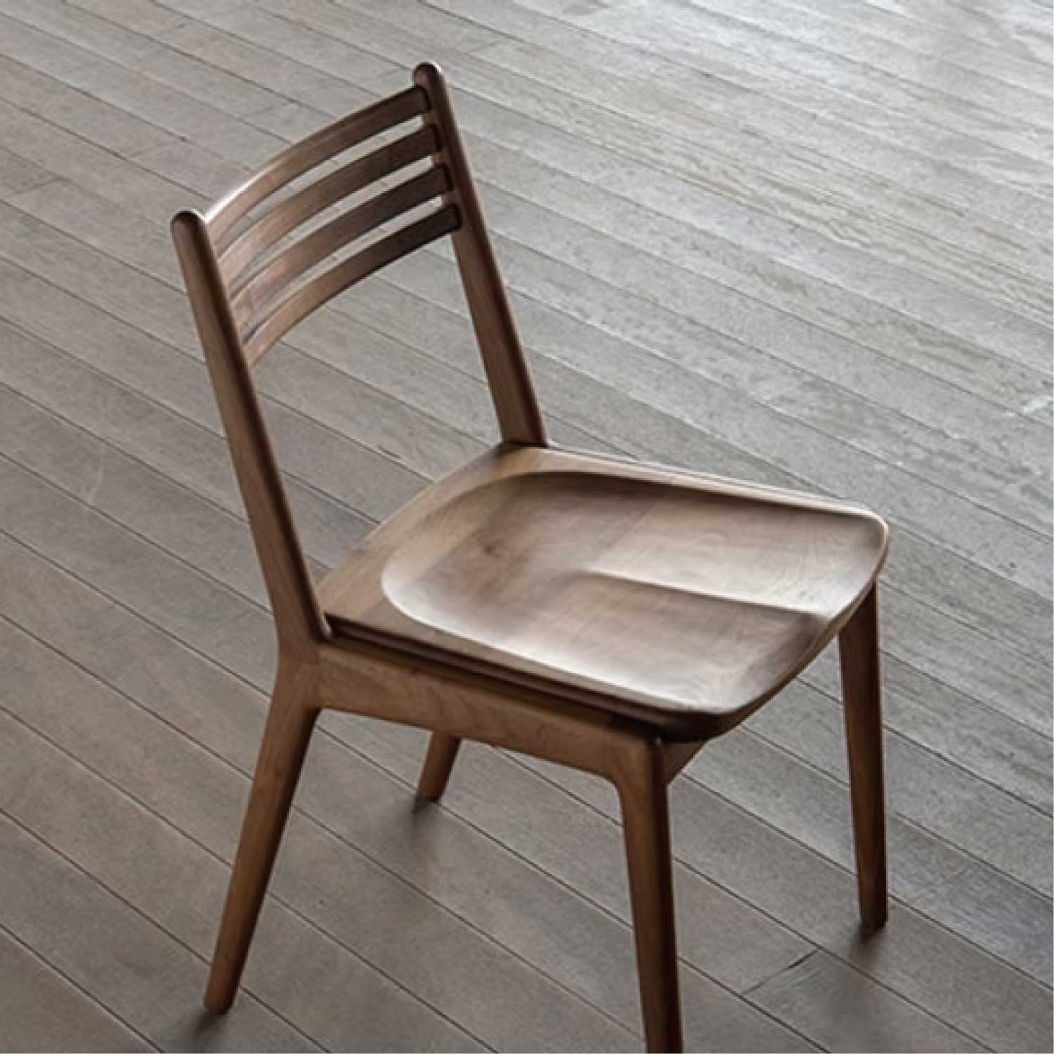 細身で軽快なフォルムのスリットチェアーの座板がウッドのアームレスタイプです。フレームはムク材を削り出し、手仕事で仕上げました。丸みを帯びた断面の優しい手触りを感じてください。座板や背のスポークもムク材の削り出し、スリットも軽快なイメージを醸し出しています。背の緩やかなカーブや、座板の掘り込みが、ゆったりと身体を受け止めてくれます。