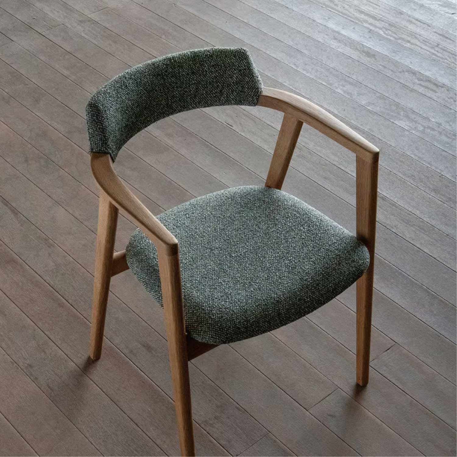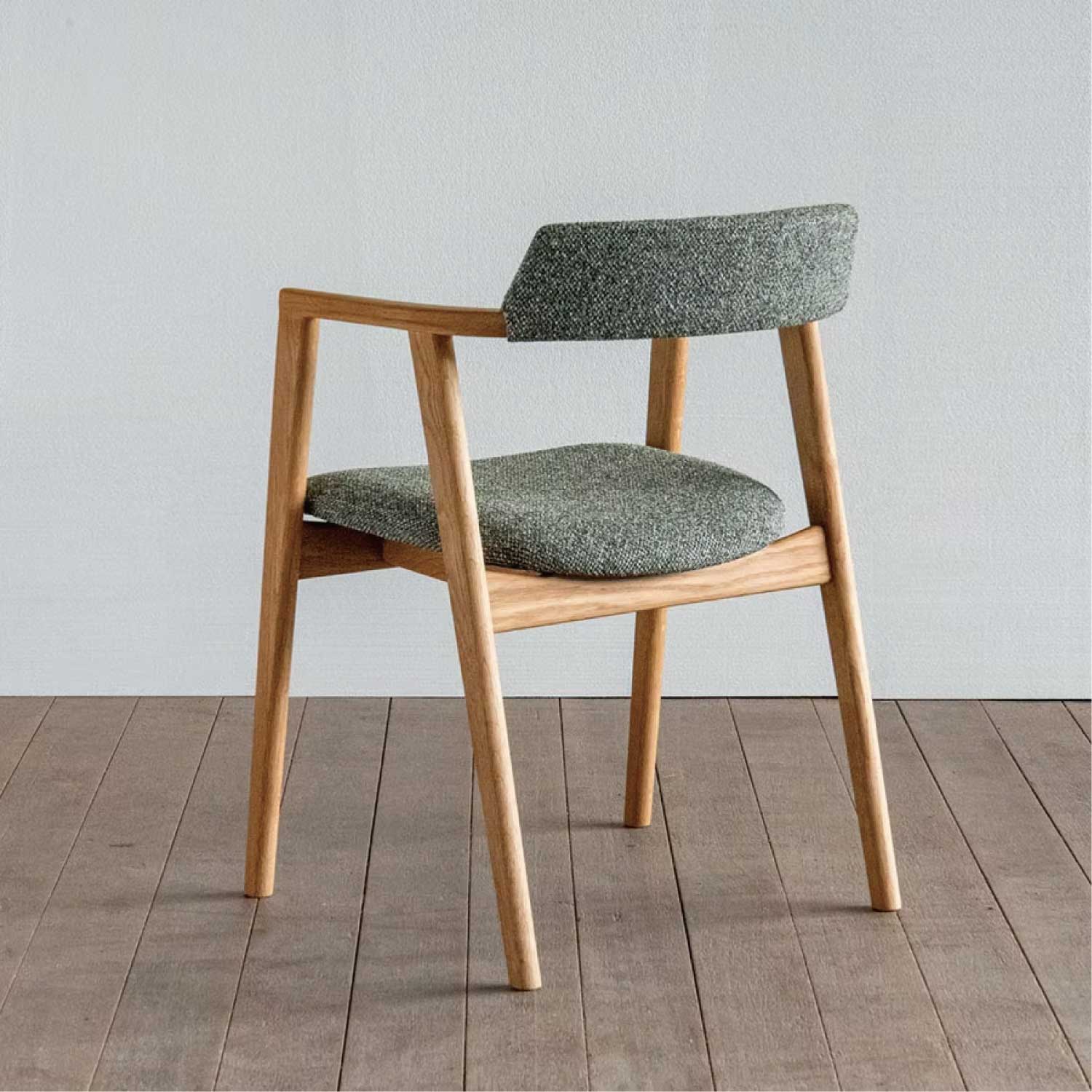 張り込みの背がラウンドしているアームチェア。湾曲した背が心地よく身体を受け止めてくれます。柔らかなカーブのアーム、脚部も大きな面取りがなされていて優しい手触りと軽やかなフォルムが特徴です。