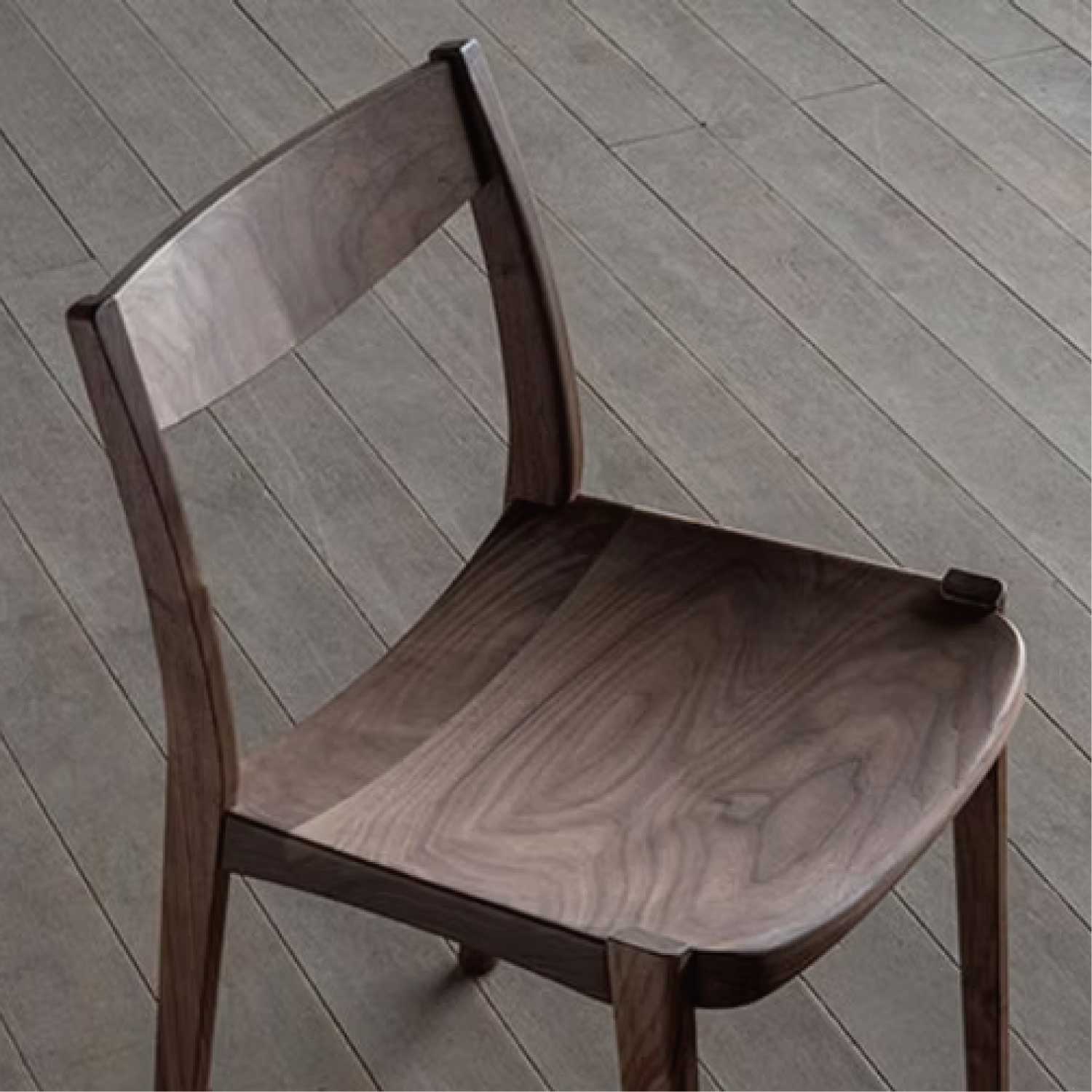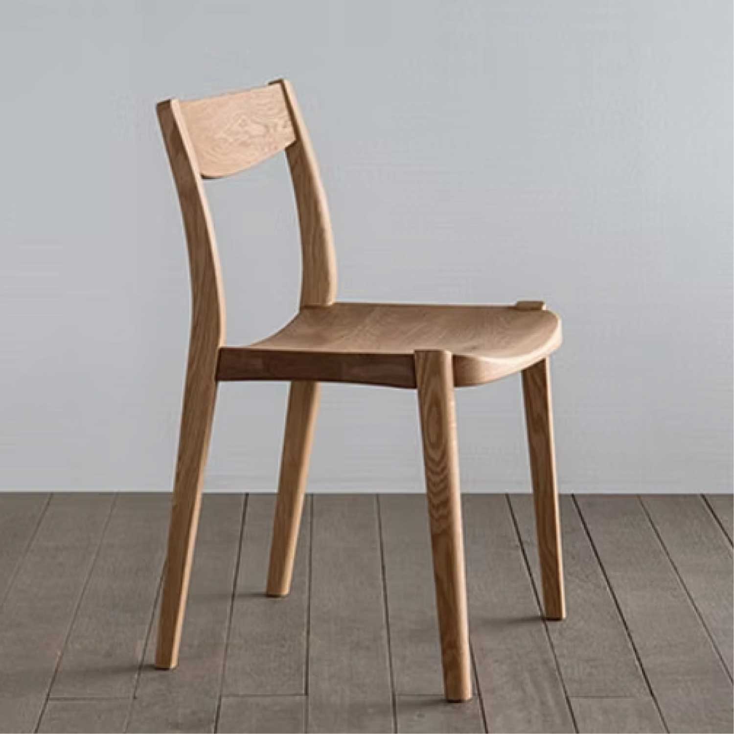 オール無垢材のシンプルなチェアです。座板に直接脚が付き、貫がないユニークな構造。座板は大きなカーブに削られて、無垢材のチェアでありながら、軽快なイメージを醸し出しています。背板も曲げ木で、座り心地もよいチェアです。