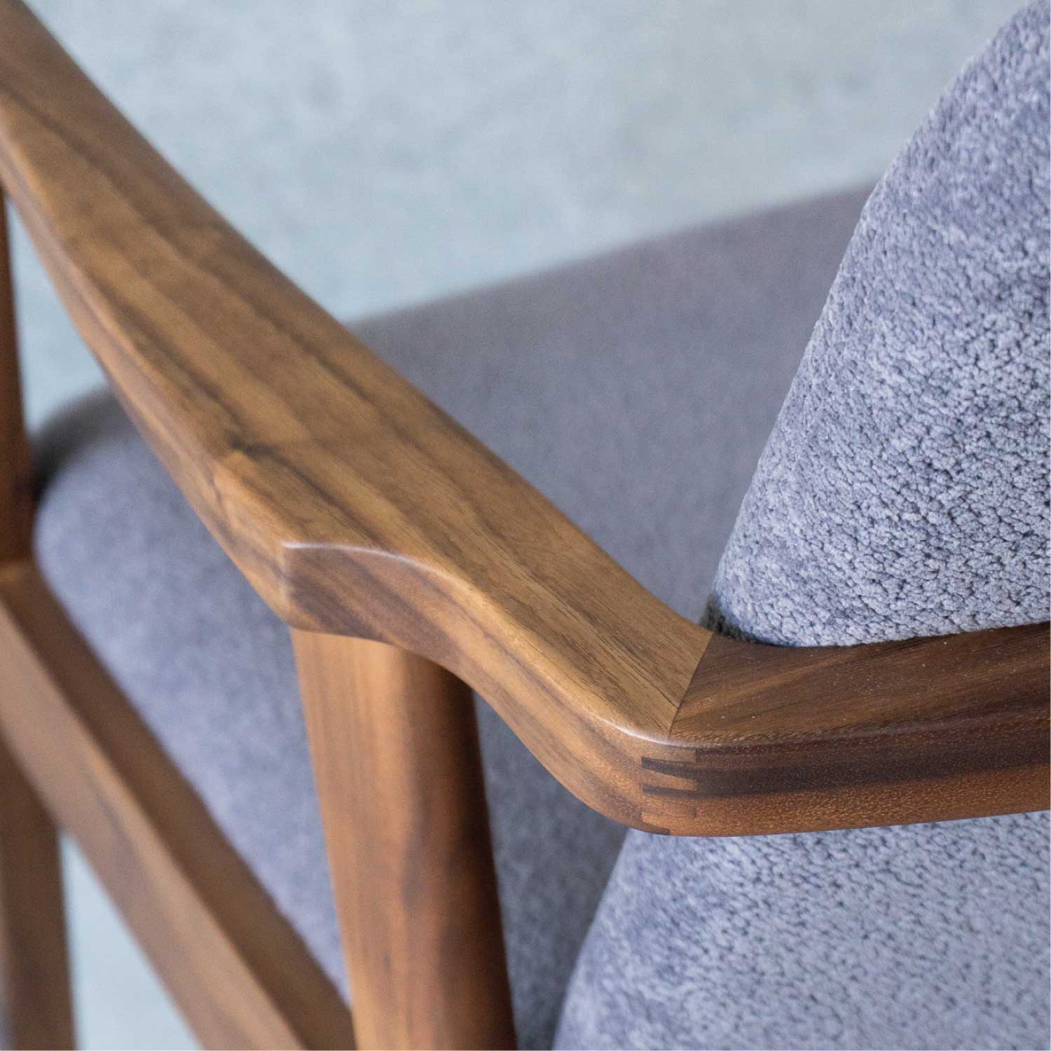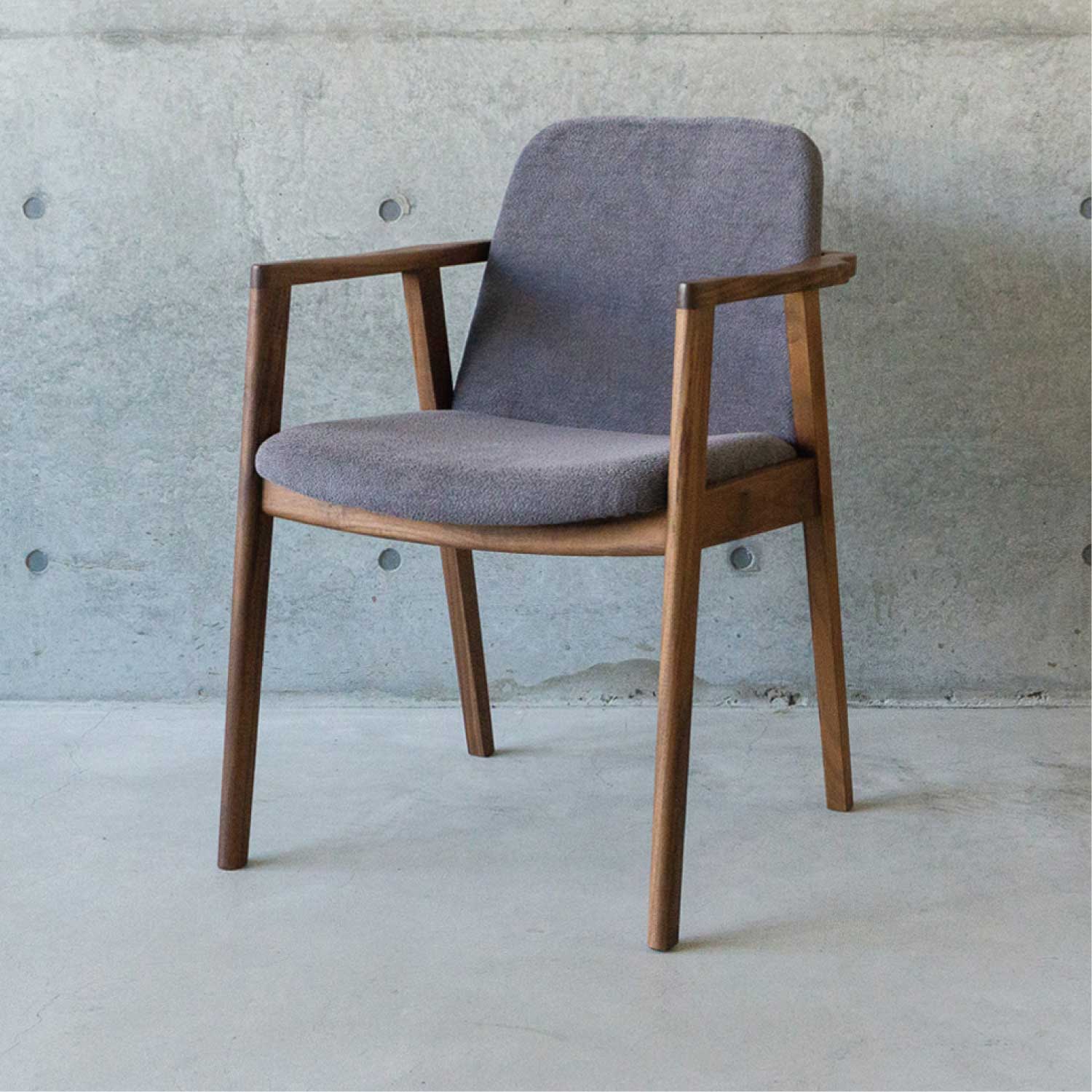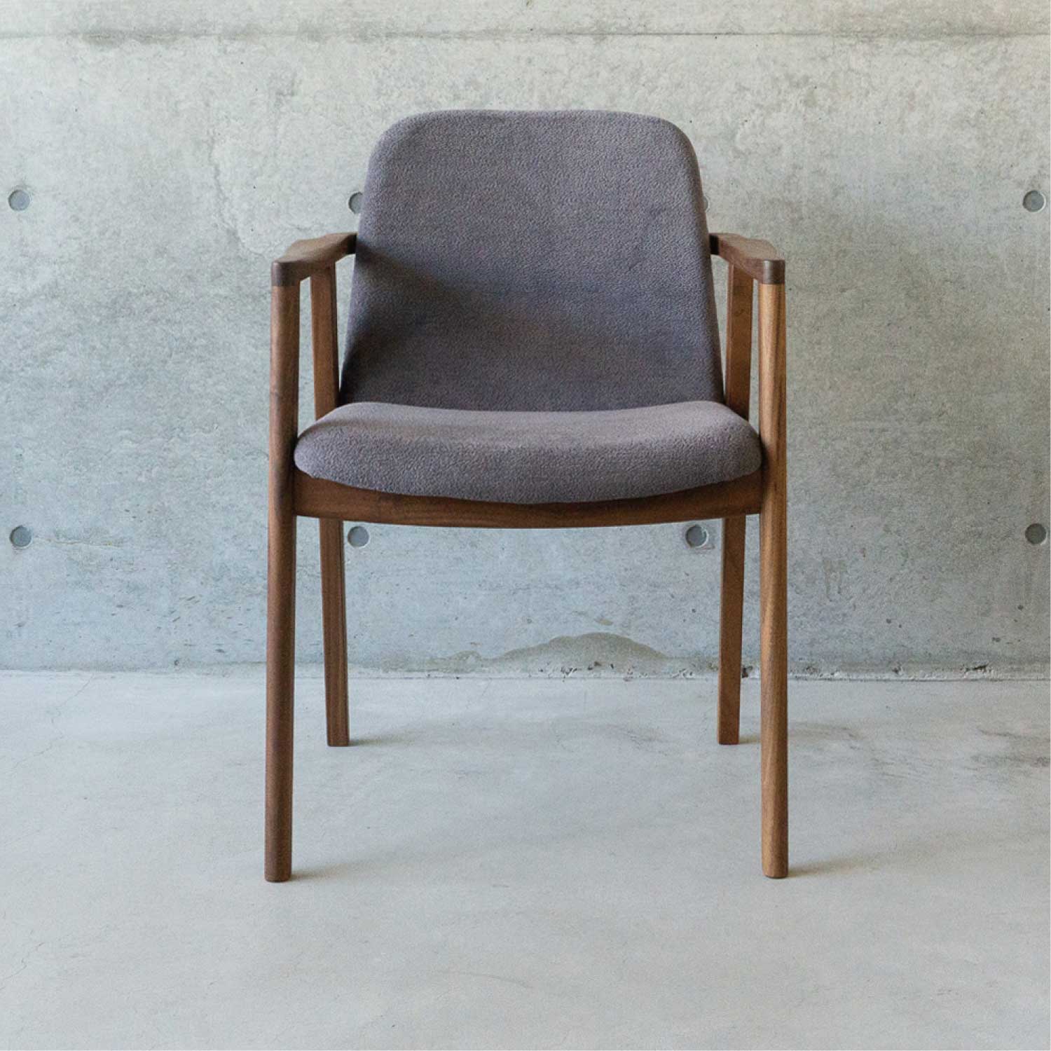 カーブのついた張りぐるみの背板で優しい座り心地の安楽なチェアです。無垢材を削り出したU型の肘や脚のメリハリのある面取りが特徴です。肘が短い、アームレスチェアもあります。