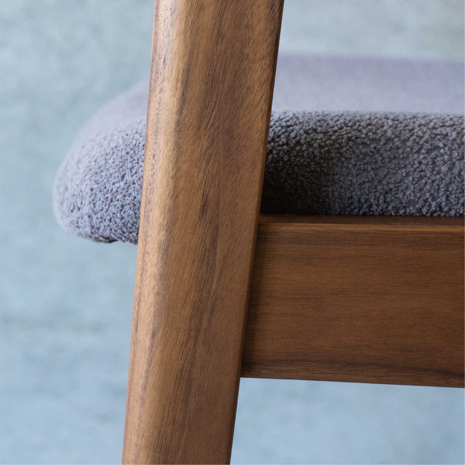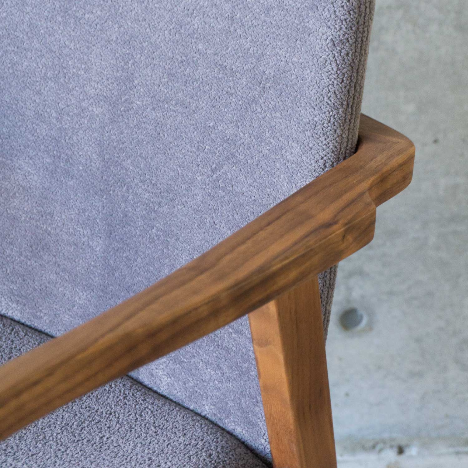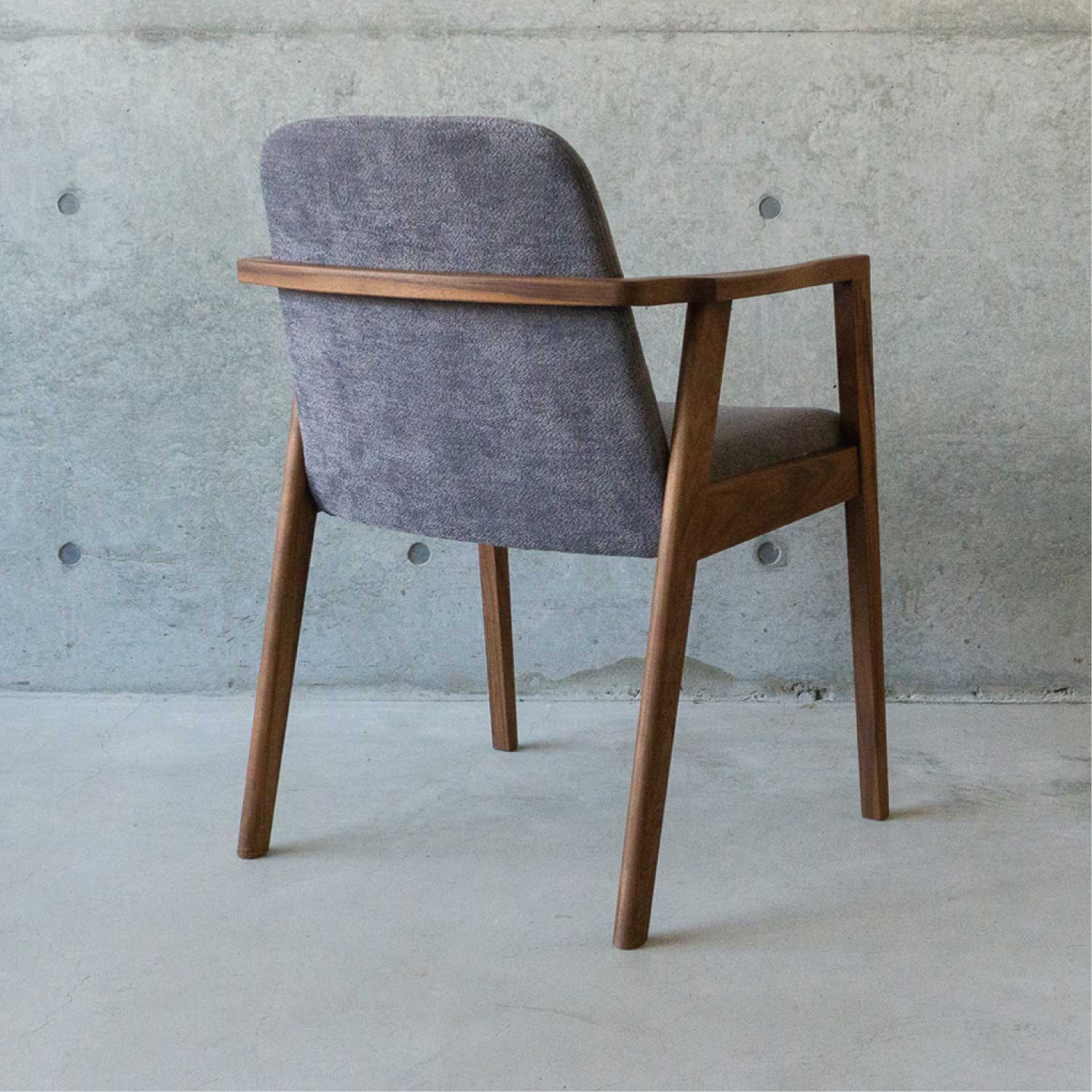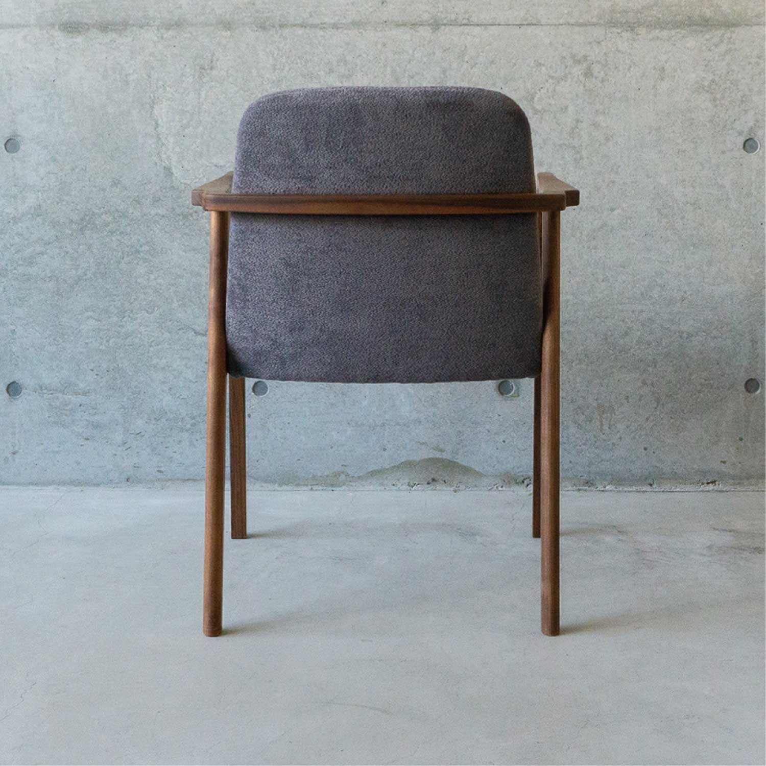 カーブのついた張りぐるみの背板で優しい座り心地の安楽なチェアです。無垢材を削り出したU型の肘や脚のメリハリのある面取りが特徴です。肘が短い、アームレスチェアもあります。