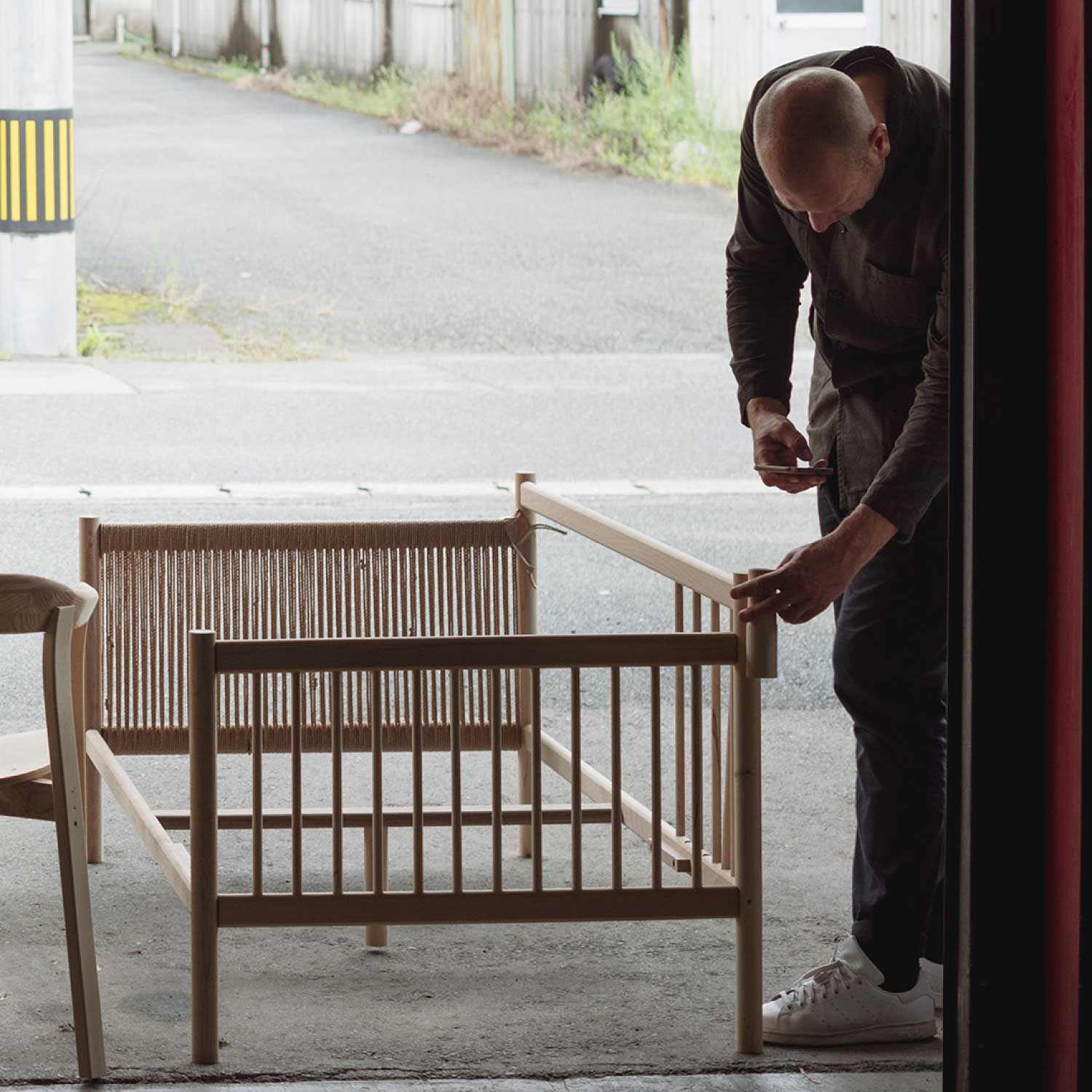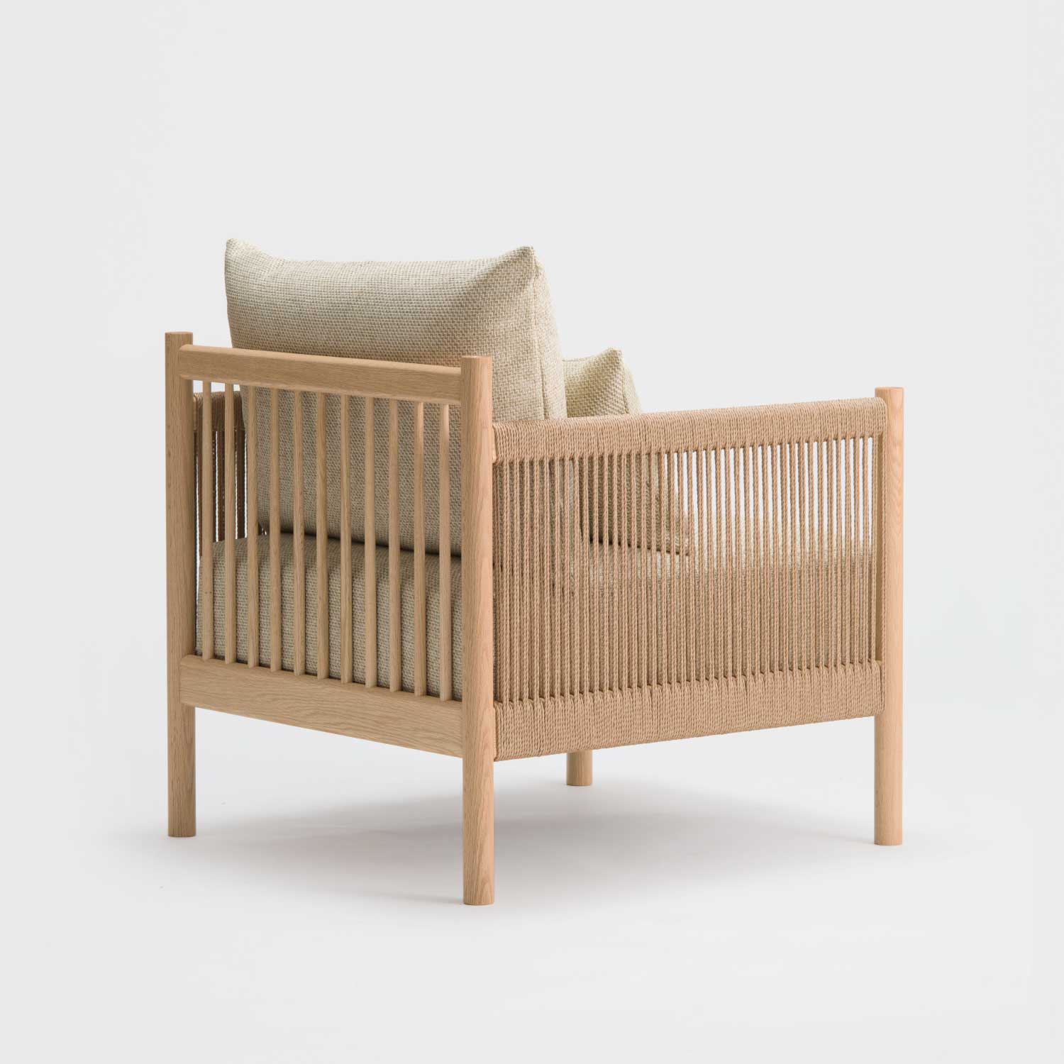 背面に並んだ細木とペーパーコードを編み込んだ肘掛けは、古典的な竹建築と畳の模様に影響を受けたものです。