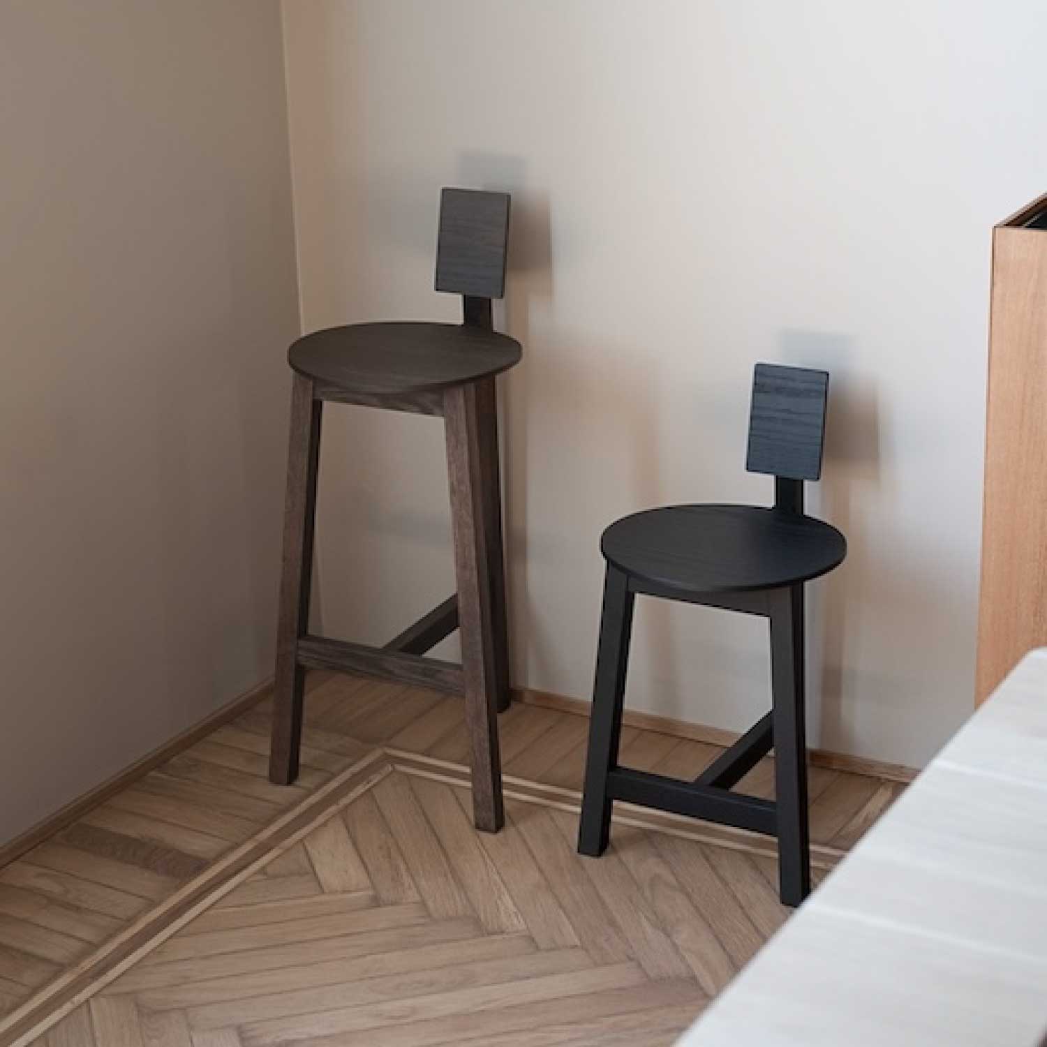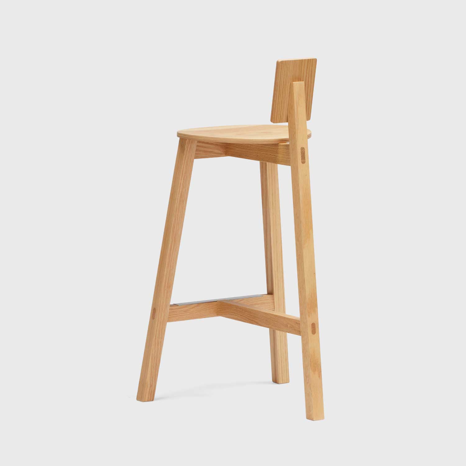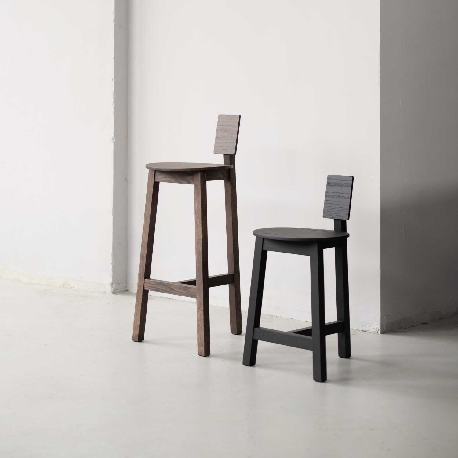 Ariakeのデザインワークショップで佐賀を訪れた際、机の下にほとんど隠れるように置かれていた小さなスツールを見つけました。そのシンプルさと、まさに作業用のスツールと感じられる雰囲気に惹かれたのです。私たちは、工場で使われているスツールのように自然体で自信に満ちたデザインを、別の場面で活かせるスツールとして形にしたいと考えました。オマージュスツールは、家庭のダイニングテーブルで使える追加の座席として、またカフェやレストランの空間全体の雰囲気を決定づけるアイテムとして提案します。繰り返される「T」字型の接合部が軽やかな座面と背もたれを支え、低く小さな背もたれがこのスツールの個性を際立たせ、特徴的なシルエットを生み出しています。軽量で扱いやすいオマージュは、2つの高さから選べる多用途なスツールであり、日常生活の頼れるパートナーでありながら、どこか象徴的な存在感を放ちます。