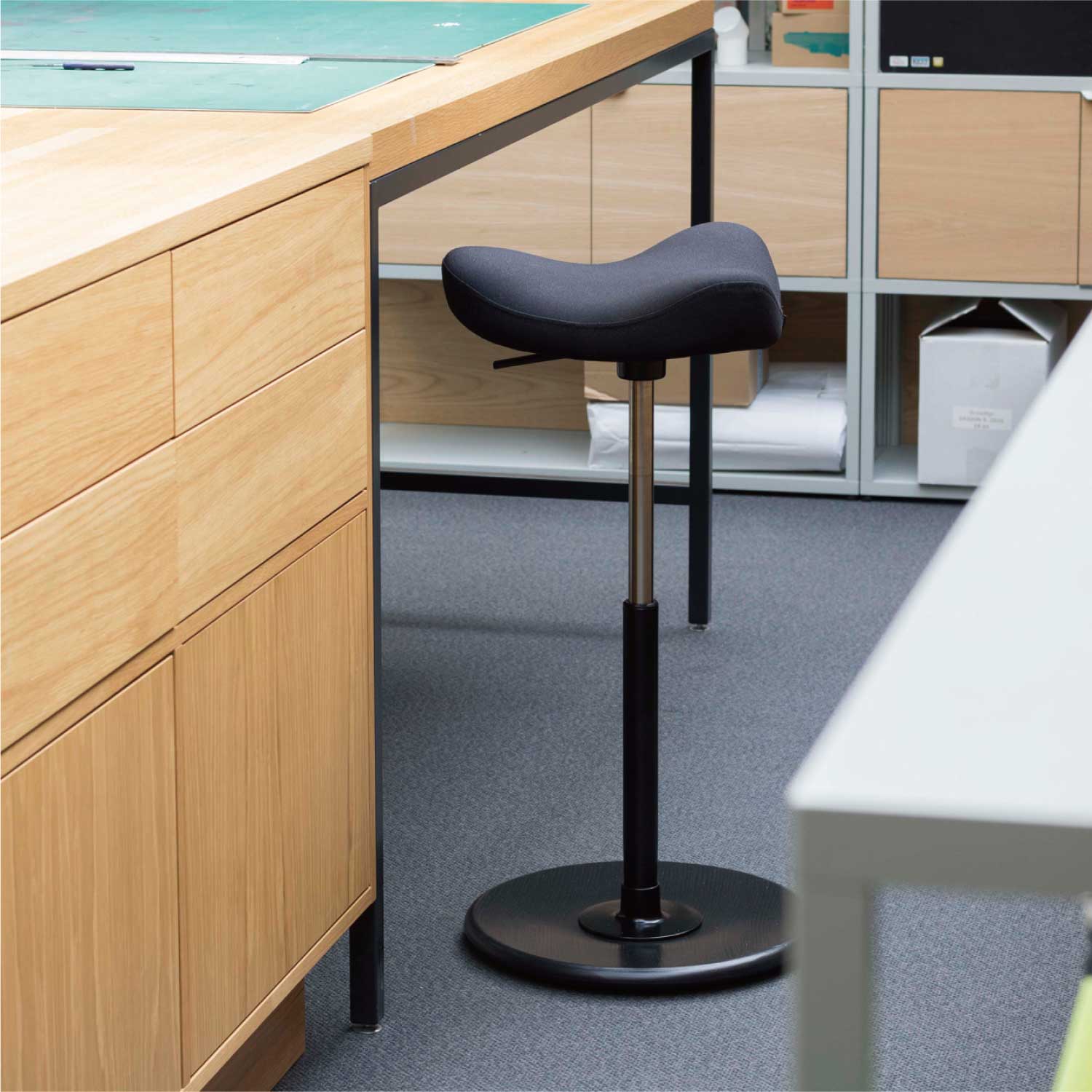 座るための道具、立ったときの姿勢をサポートする道具という2 つの側面を持つムーブの特徴として、緩やかな傾斜を持つベースがありますが、ベースに内蔵されたチルト機構により、身体がどの方向へ動いても追随するように工夫されています。馬の鞍を思わせる座面もムーブの重要な要素で、大腿部が垂直に近い状態に、つまりほとんど立っている姿勢になったとしても滑らないように工夫されています。
