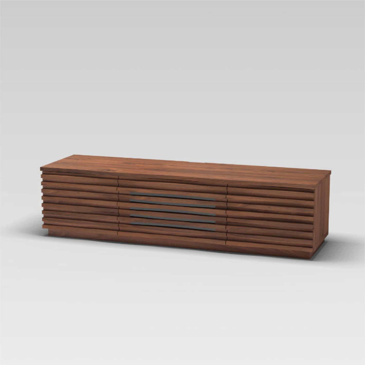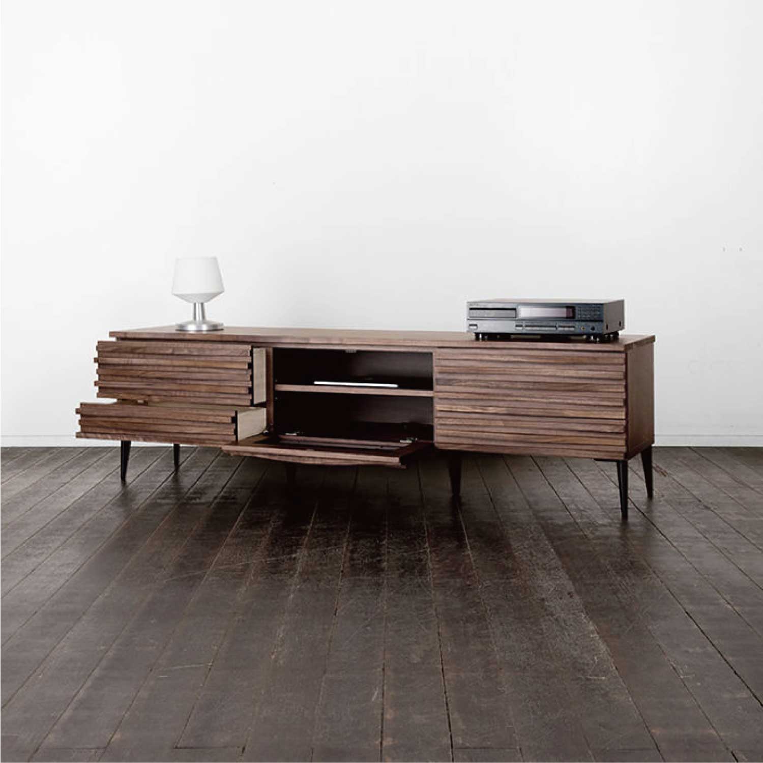 重厚感と軽やかさを併せ持つ、波打ったストライプパターンが印象的なTVスタンド。優美な曲線の連なりによって形成された表情は、大河の水面や大木の樹皮など雄大な自然を連想させてくれます。