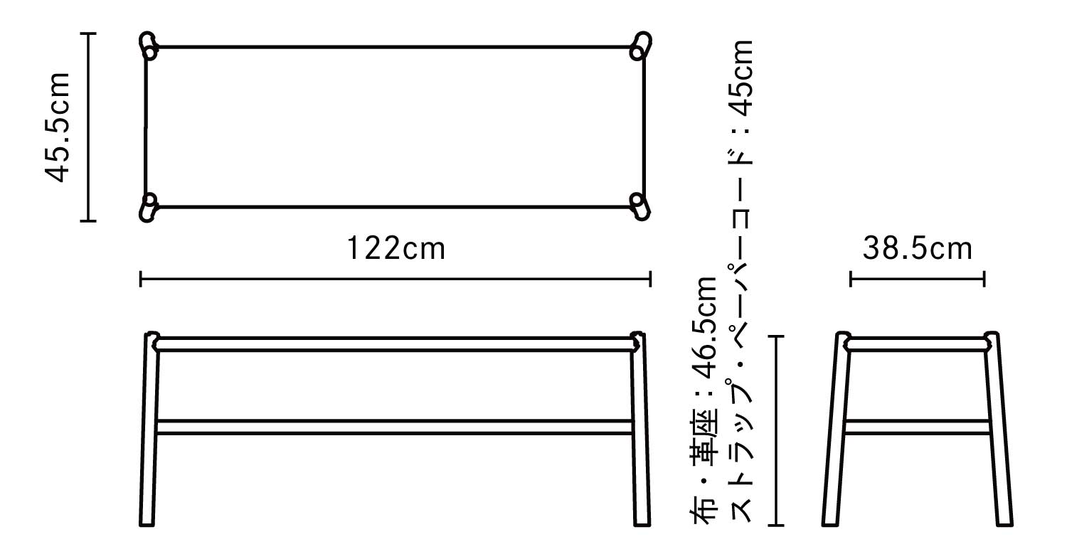 | サイズ | W122 × D45.5cm ● 高さ 布・革座:46.5cm ストラップ・ペーパーコード:46cm ● 座面高 布・革座:46.5cm ストラップ・ペーパーコード:45cm |