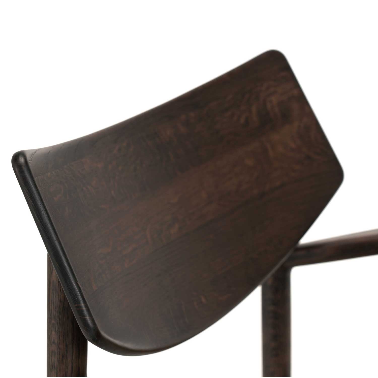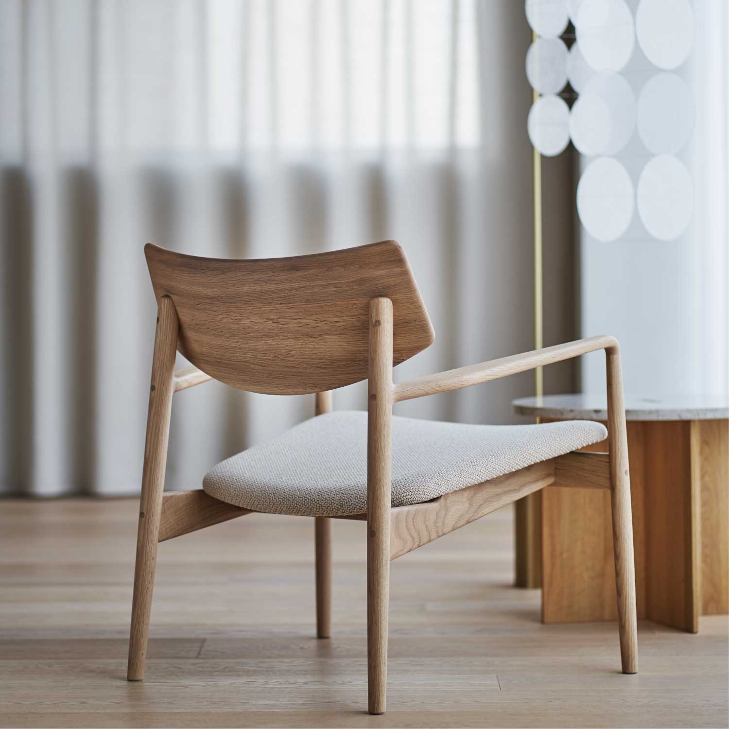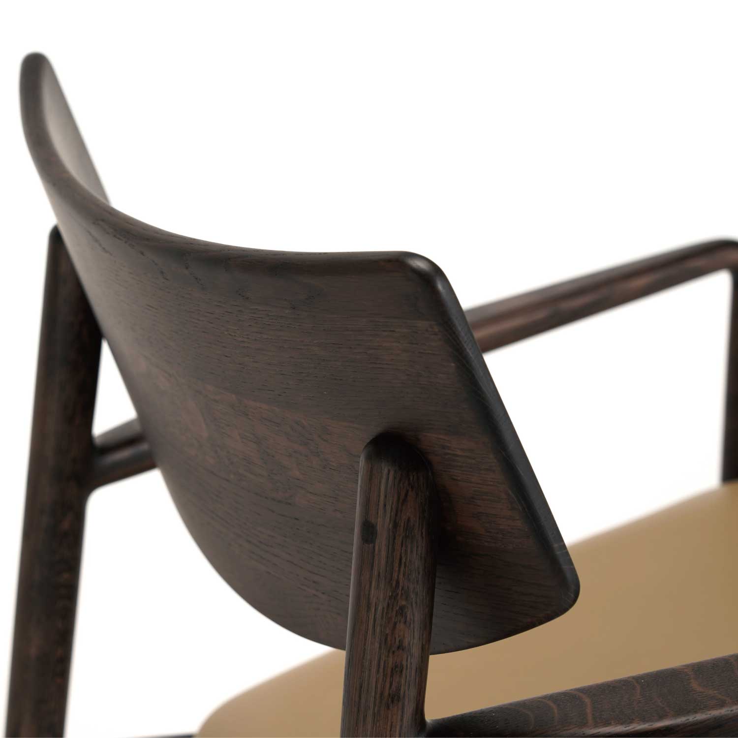 ダイニングチェアのような軽快さと、ラウンジチェアとしてのサイズ感や安定感を兼ね備えた1脚です。どの角度から見ても美しいプロポーション。傾斜したシート、大ぶりの背もたれ、やや幅を持たせたアームレストなど、座る人への配慮がすみずみまで行き届いています。