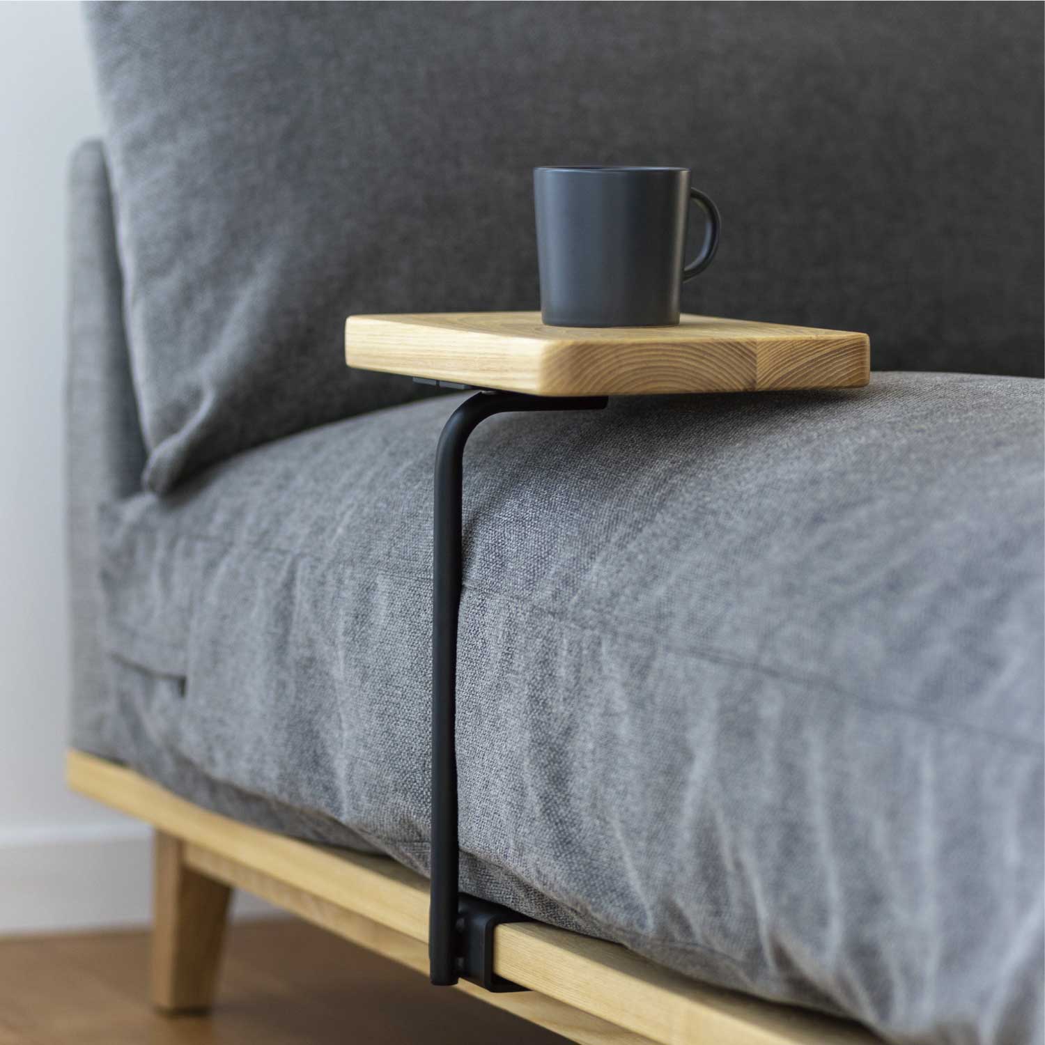 肘置きやサイドテーブルとしてお使い頂けるオプションをご用意しています。天板のサイズはスマホ、TVなどのリモコン、マグカップの3点を置くのに丁度良いサイズに設計しています。テーブルはソファの右側、左側どちらにもつけることができます。