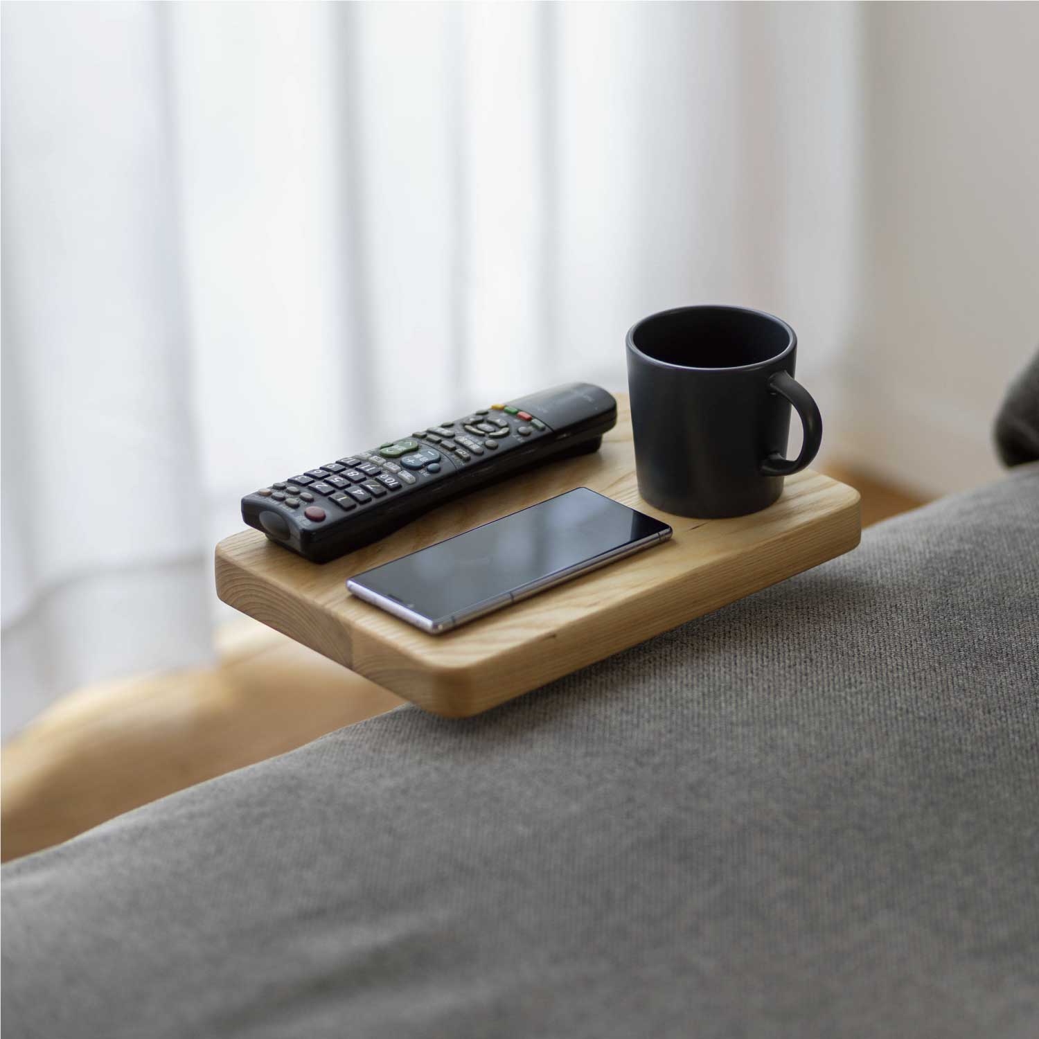 天板のサイズはスマホ、TVなどのリモコン、マグカップの3点を置くのに丁度よいサイズに設計しています。テーブルはソファの右側、左側どちらにも付けることができます。