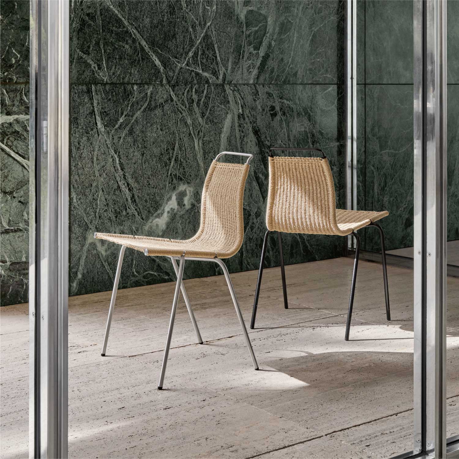 新しいPK1の座面と背もたれの素材は、FSC®認証を受けたナチュラルペーパーコード、フレームはブラックパウダーコーティングまたはステンレスブラッシュドスチールからお選びいただけます。耐久性の高いペーパーコードを密に編み込んでいるため、座面や背もたれを傷めることなく積み重ねることができます。新しいPK1 は最大4脚までスタッキング可能で、プライベートな空間からパブリックな空間まで幅広くお使いいただけます。