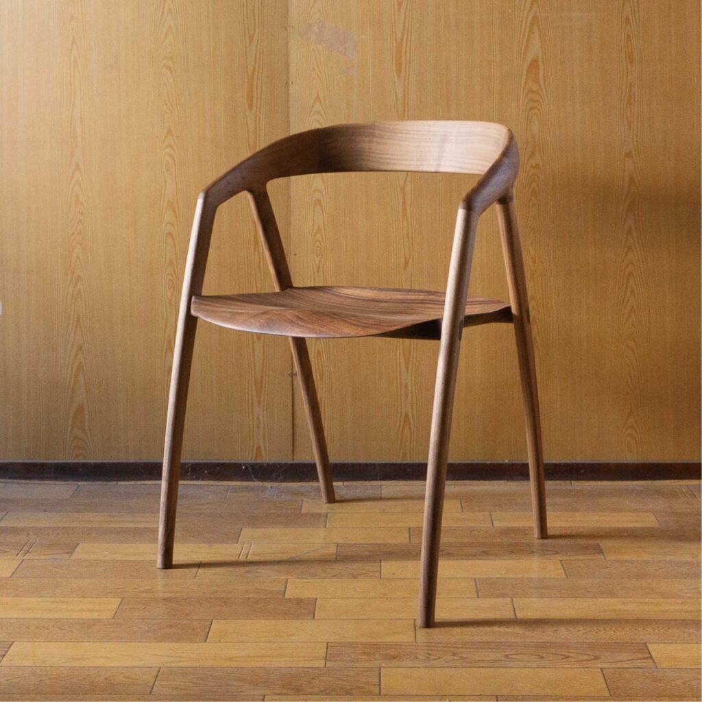 いちばんの特徴は、アームから背へと描かれる流れるようなライン。傾斜したゆるやかなアームのおかげで、椅子を大きく引かなくても出入りがしやすく、日常の動作が自然とスムーズに。机の下にもおさまりやすく、ダイニングでもデスクでも軽やかになじみます。