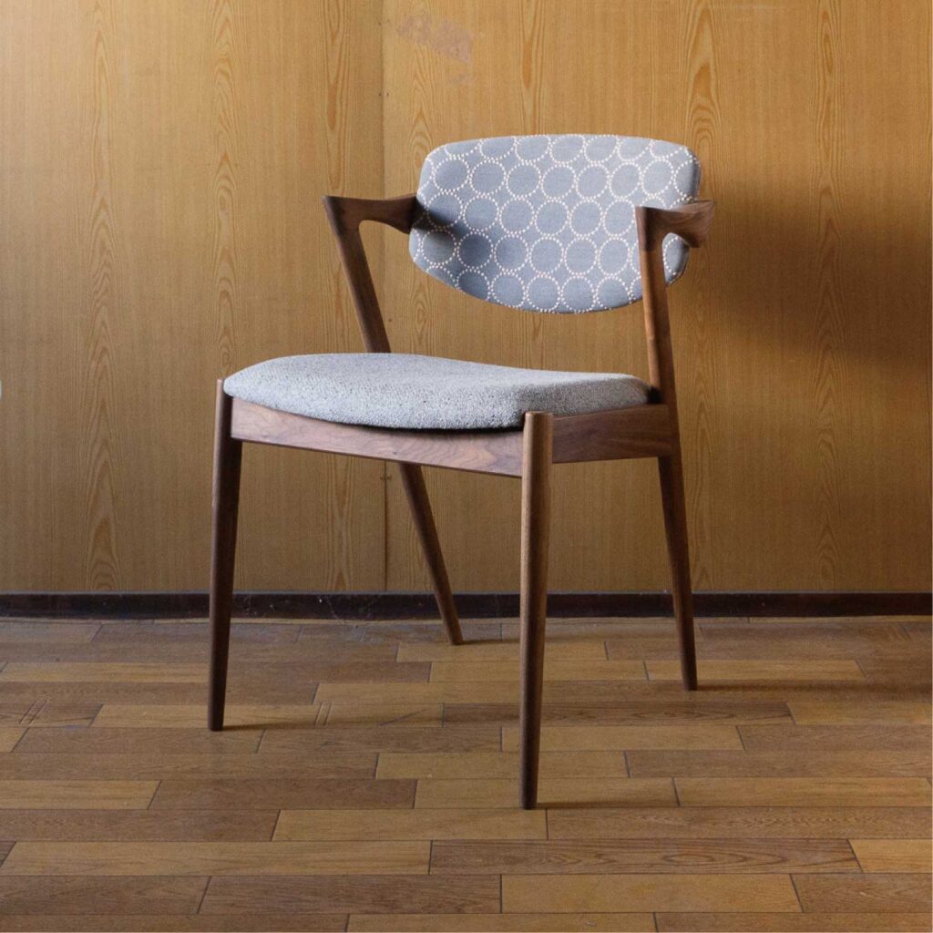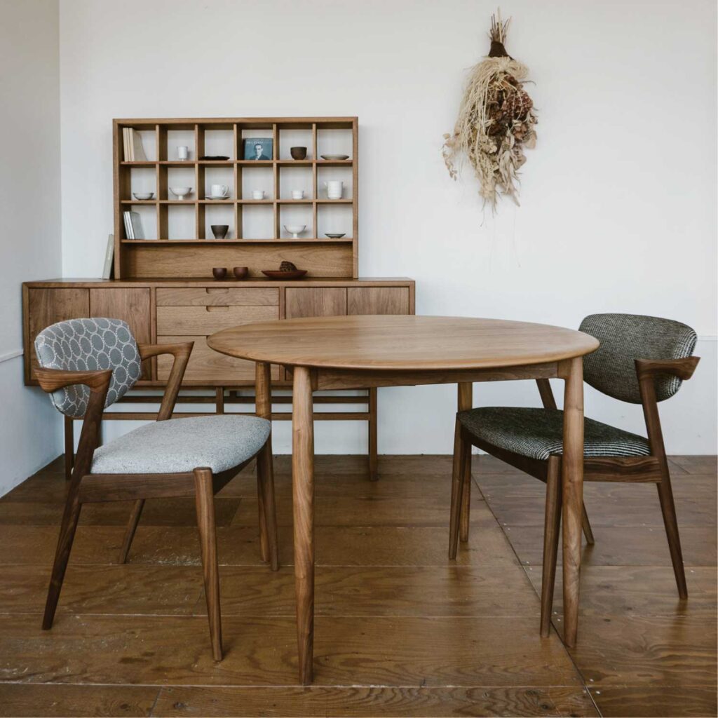 ウォールナットの落ち着いた木肌に合わせたのは、深みのあるカラーの張地。木の表情を引き立てる色合いが食卓やデスクに上質さを添えます。