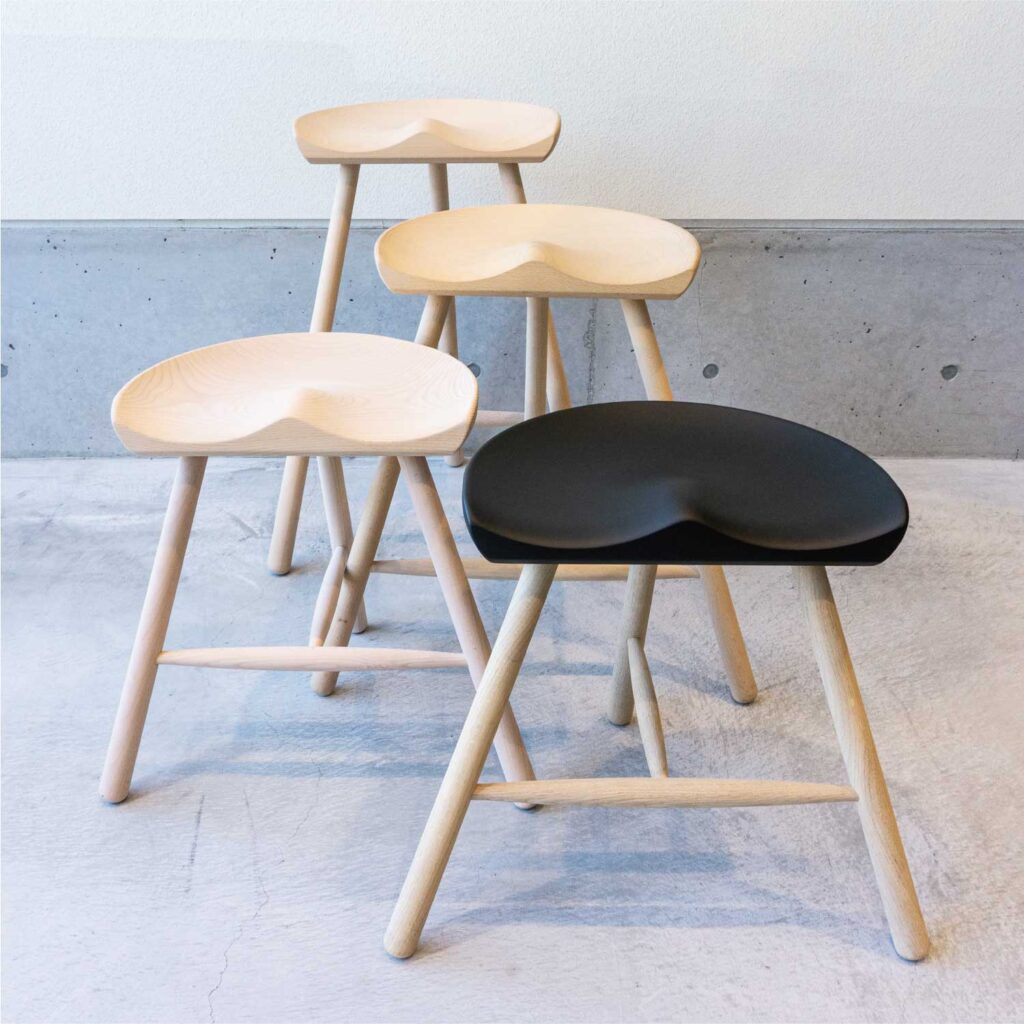 シューメーカーチェアは、15世紀に乳搾り用として作られたデザインをベースに、靴職人が座面をお尻の形状に合わせて削ったことで、現在の座り心地に。座った瞬間に自然と背筋が伸び、長く座っても疲れにくい設計です。