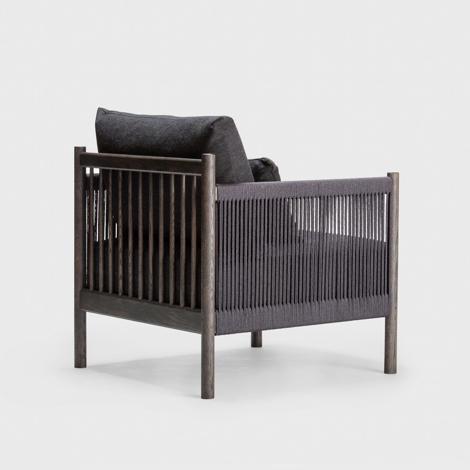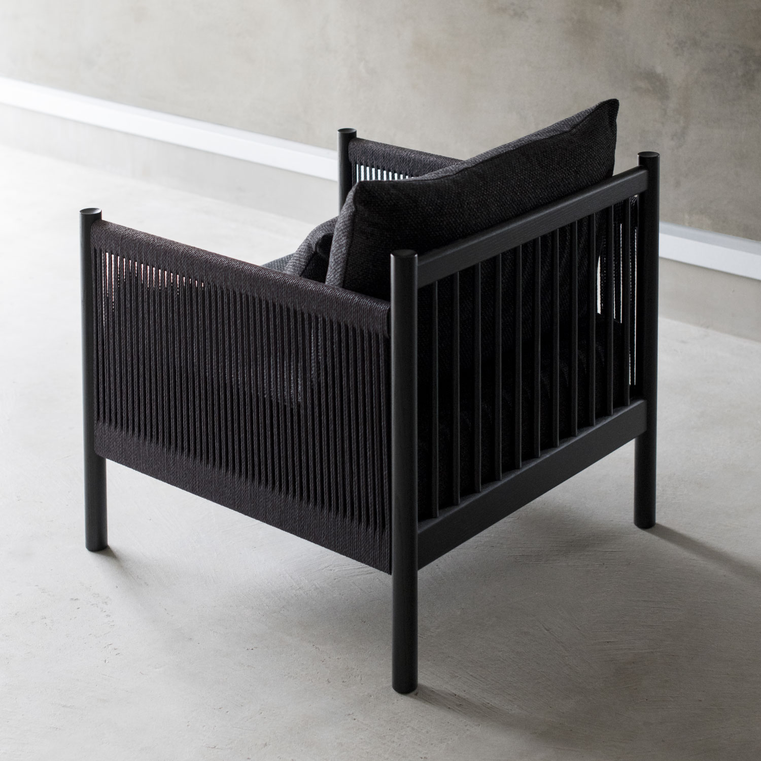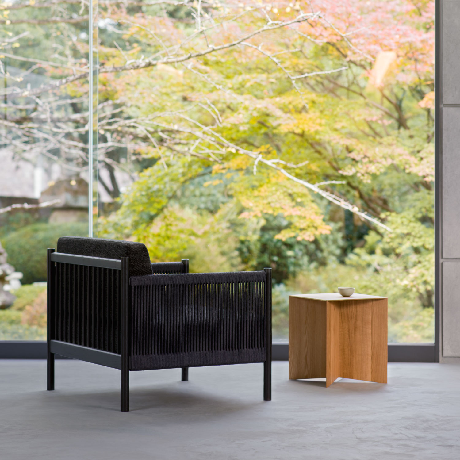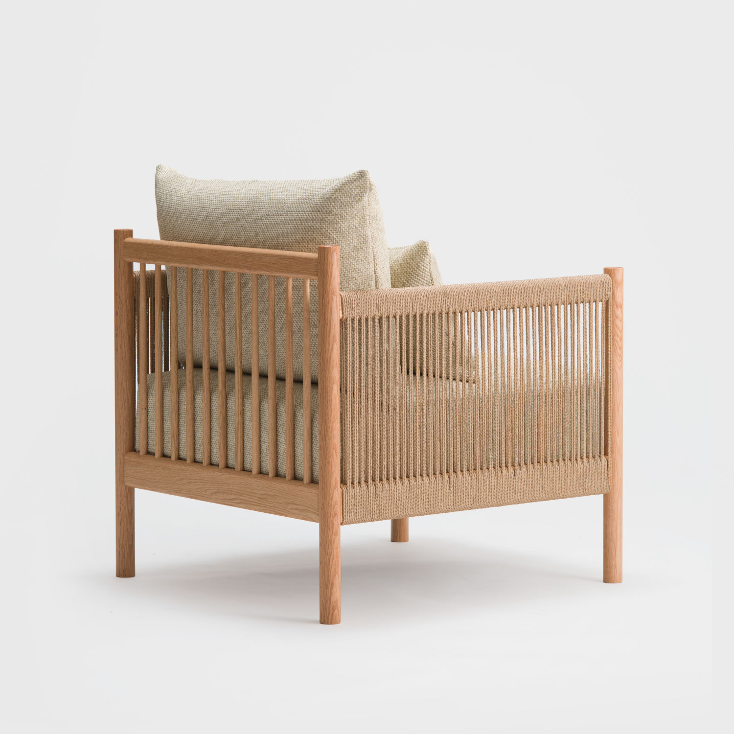 背面に並んだ細木とペーパーコードを編み込んだ肘掛けは、古典的な竹建築と畳の模様に影響を受けたものです。