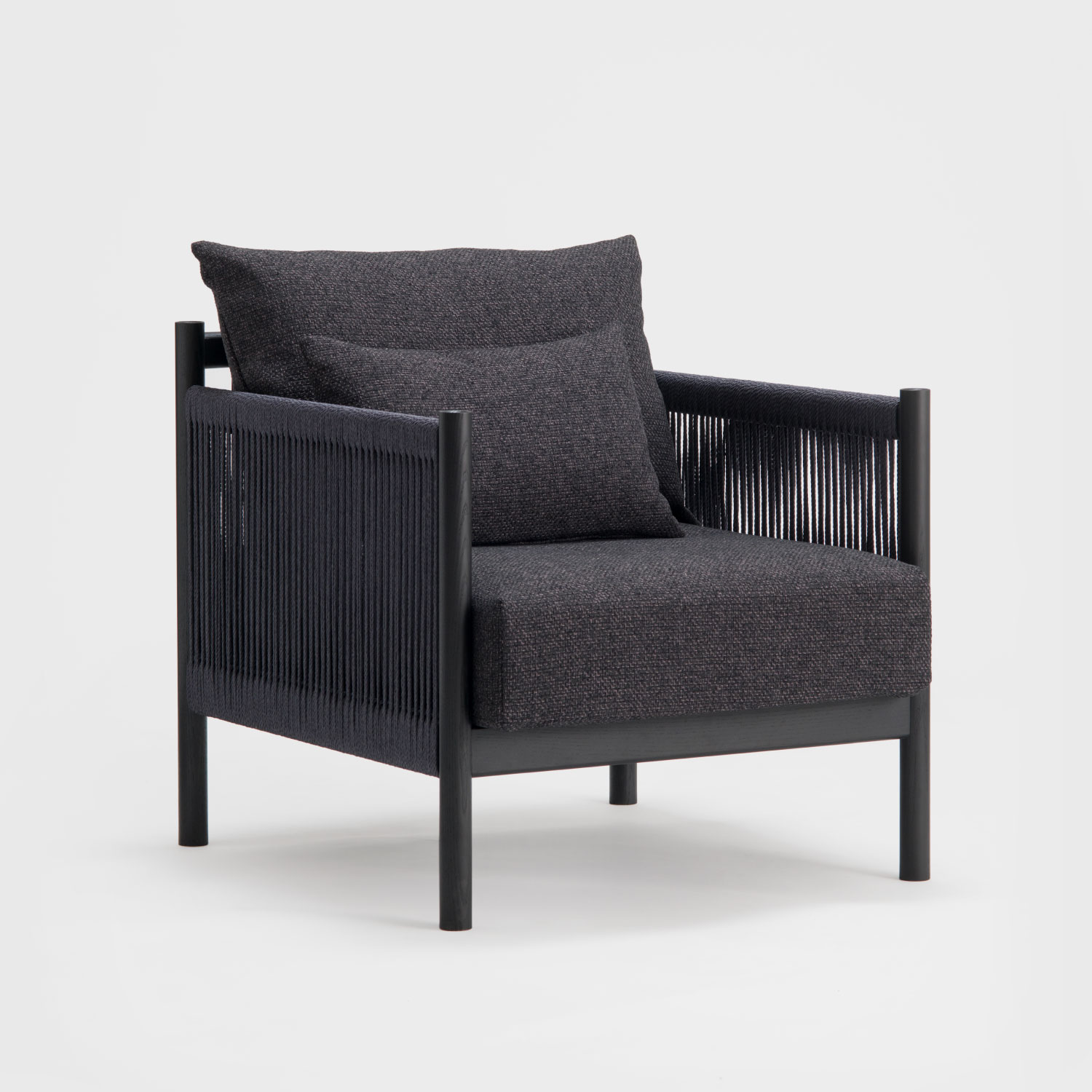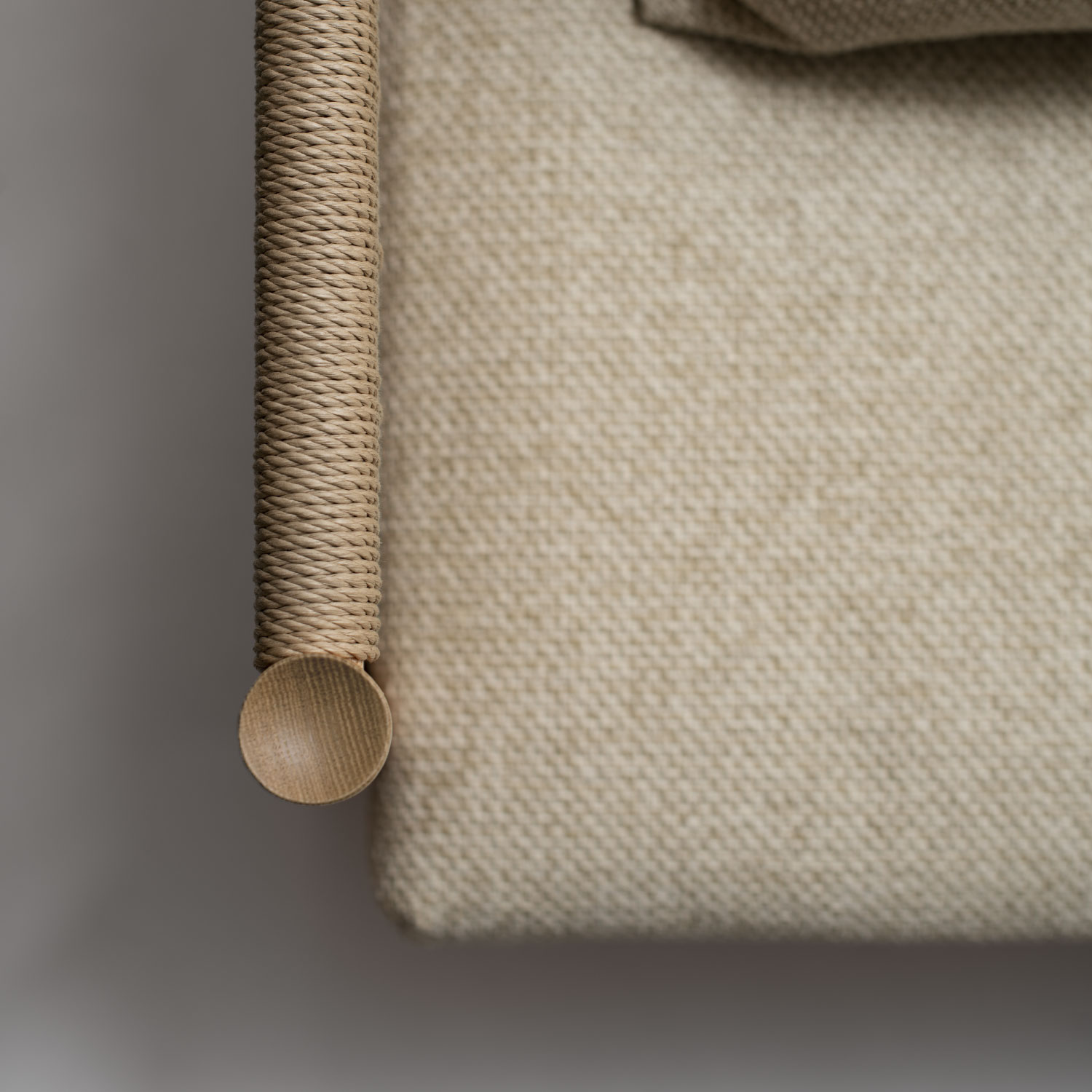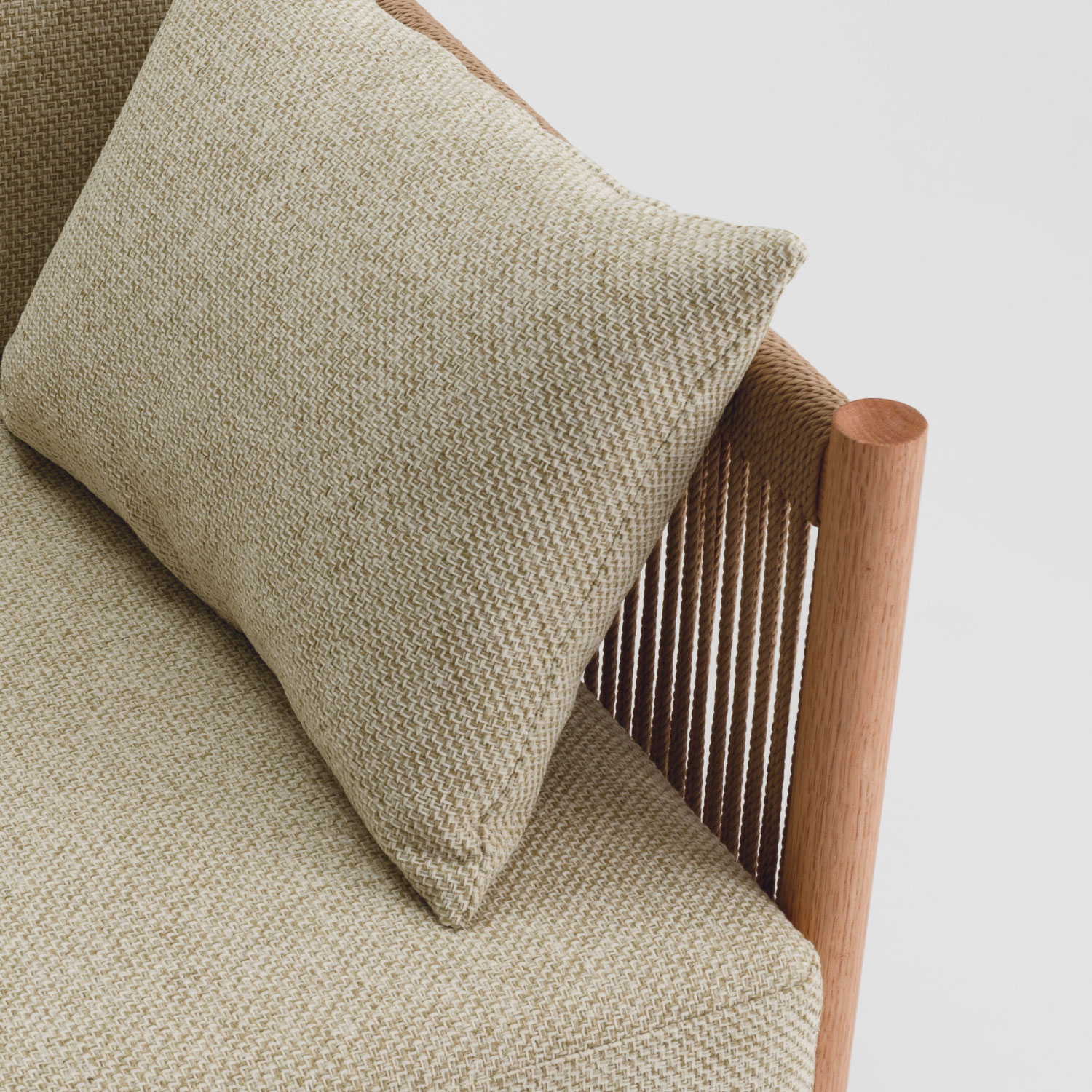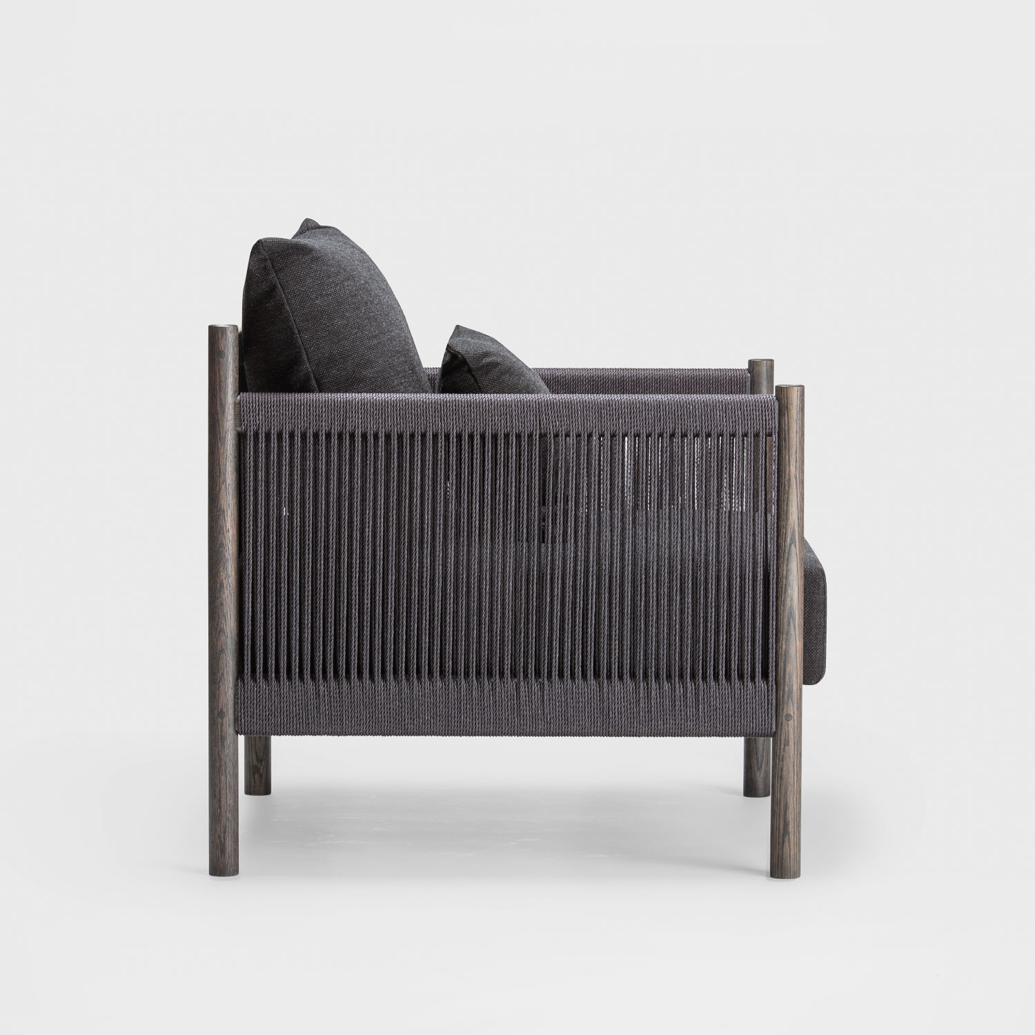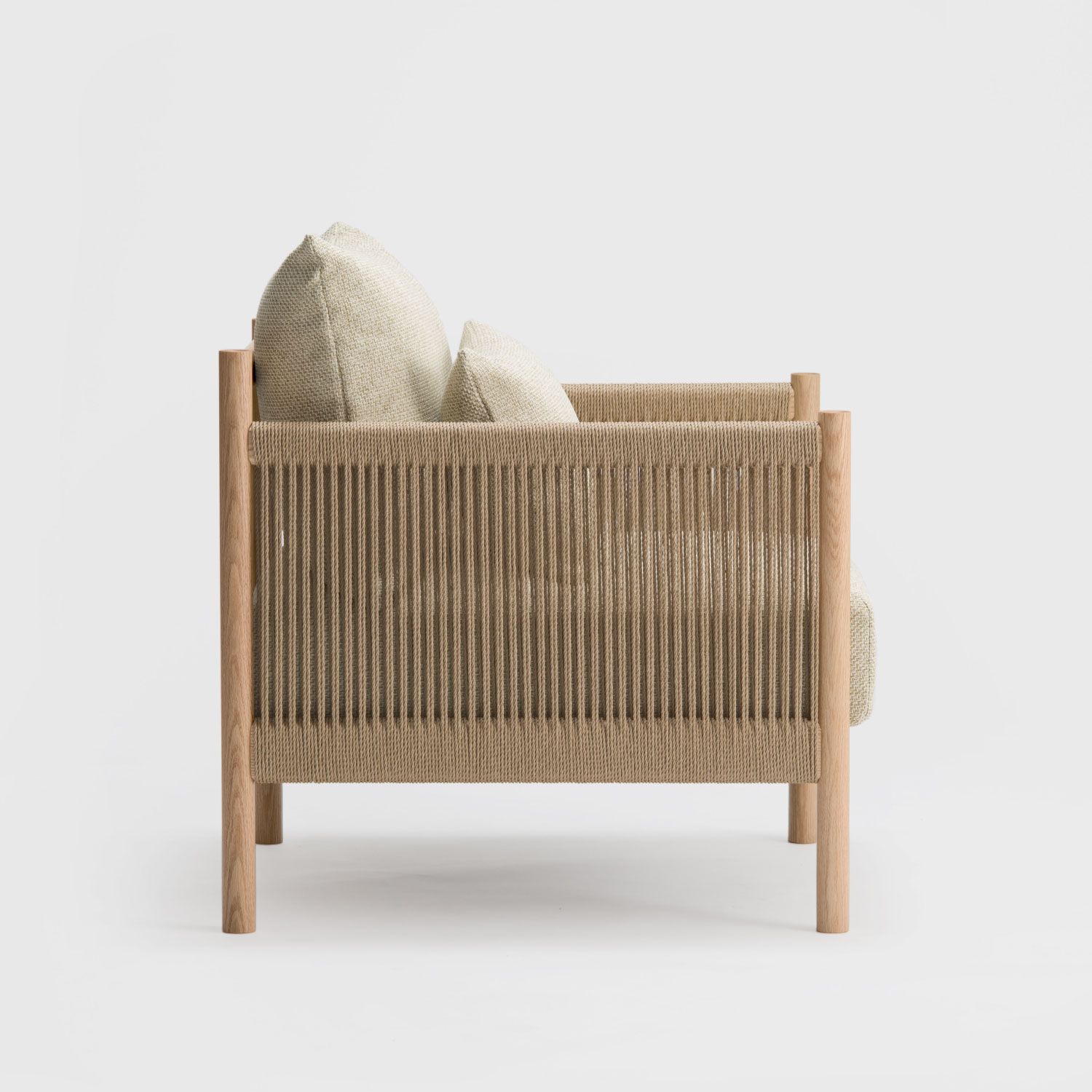 背面に並んだ細木とペーパーコードを編み込んだ肘掛けは、古典的な竹建築と畳の模様に影響を受けたものです。