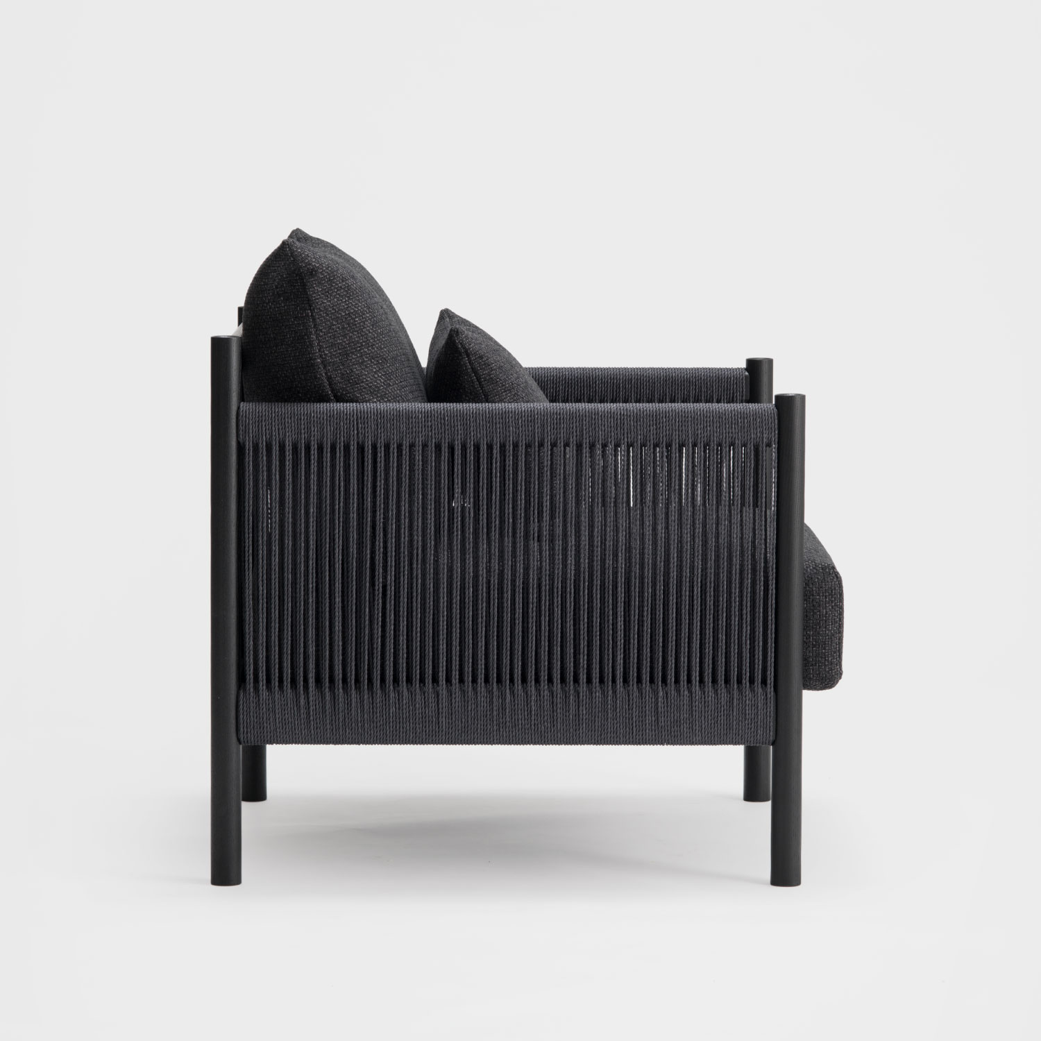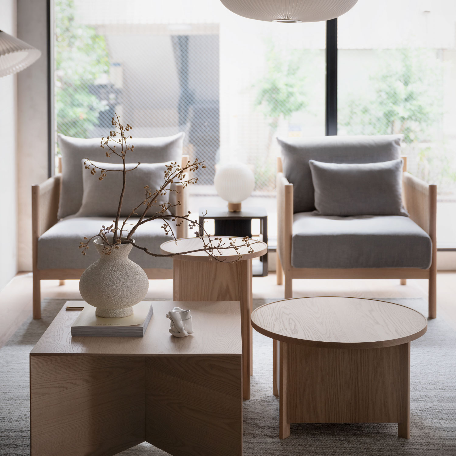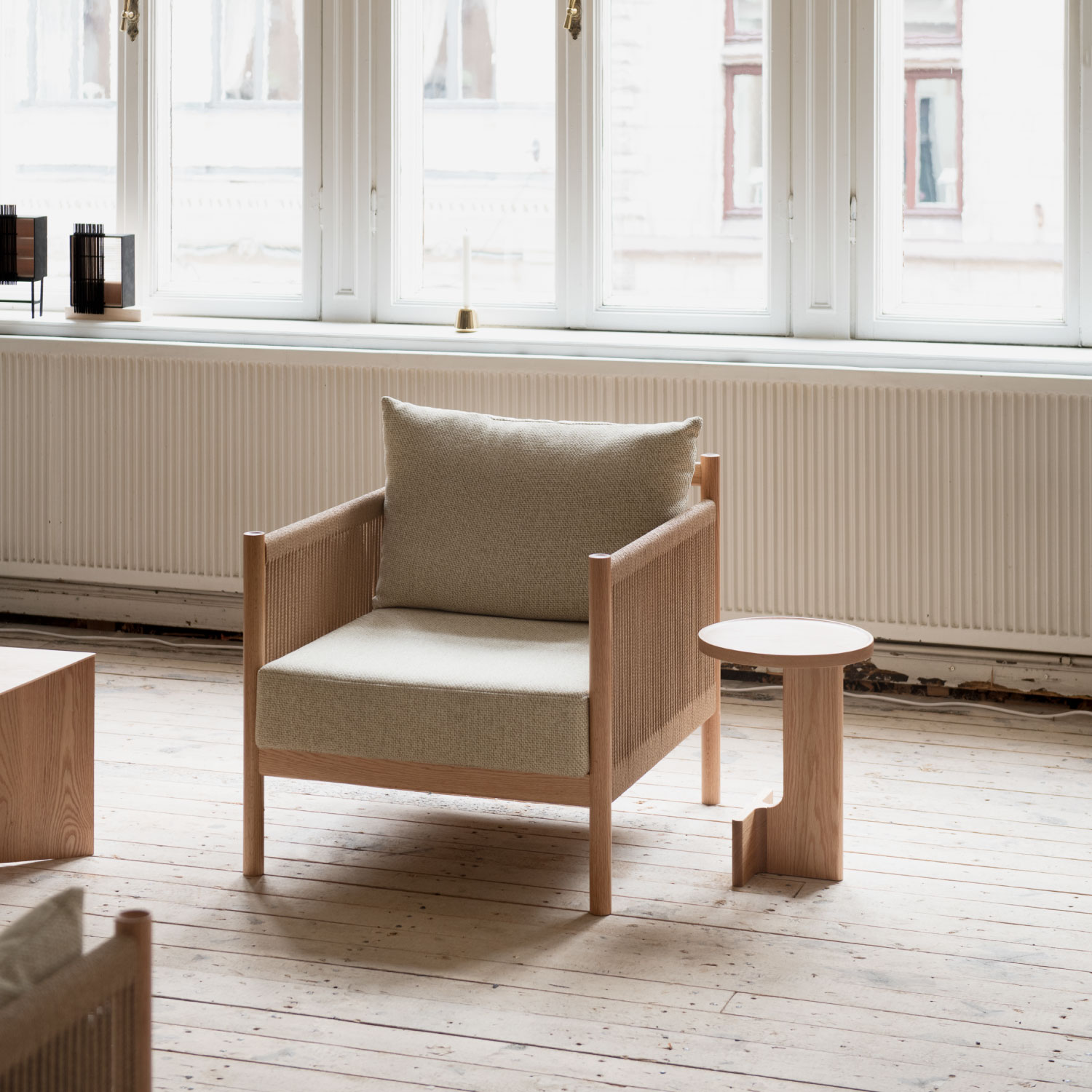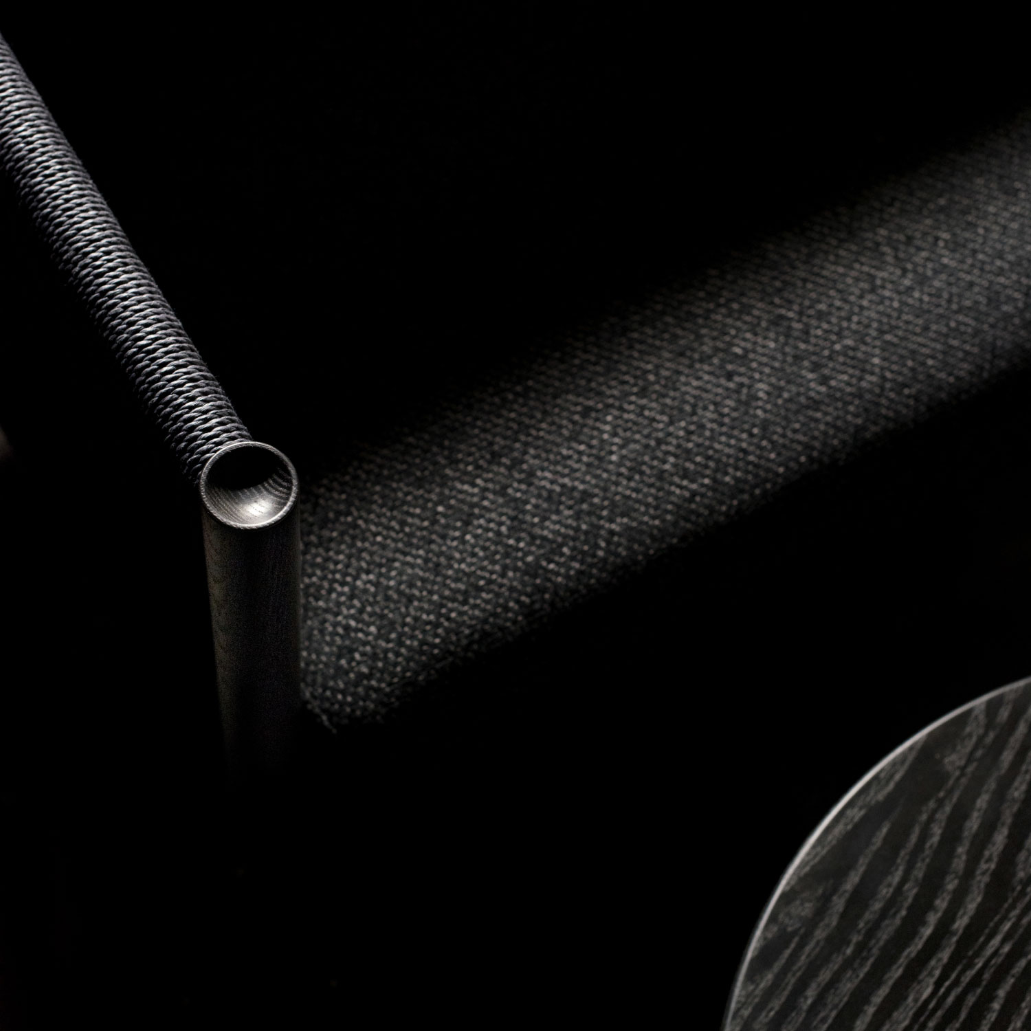 背面に並んだ細木とペーパーコードを編み込んだ肘掛けは、古典的な竹建築と畳の模様に影響を受けたものです。