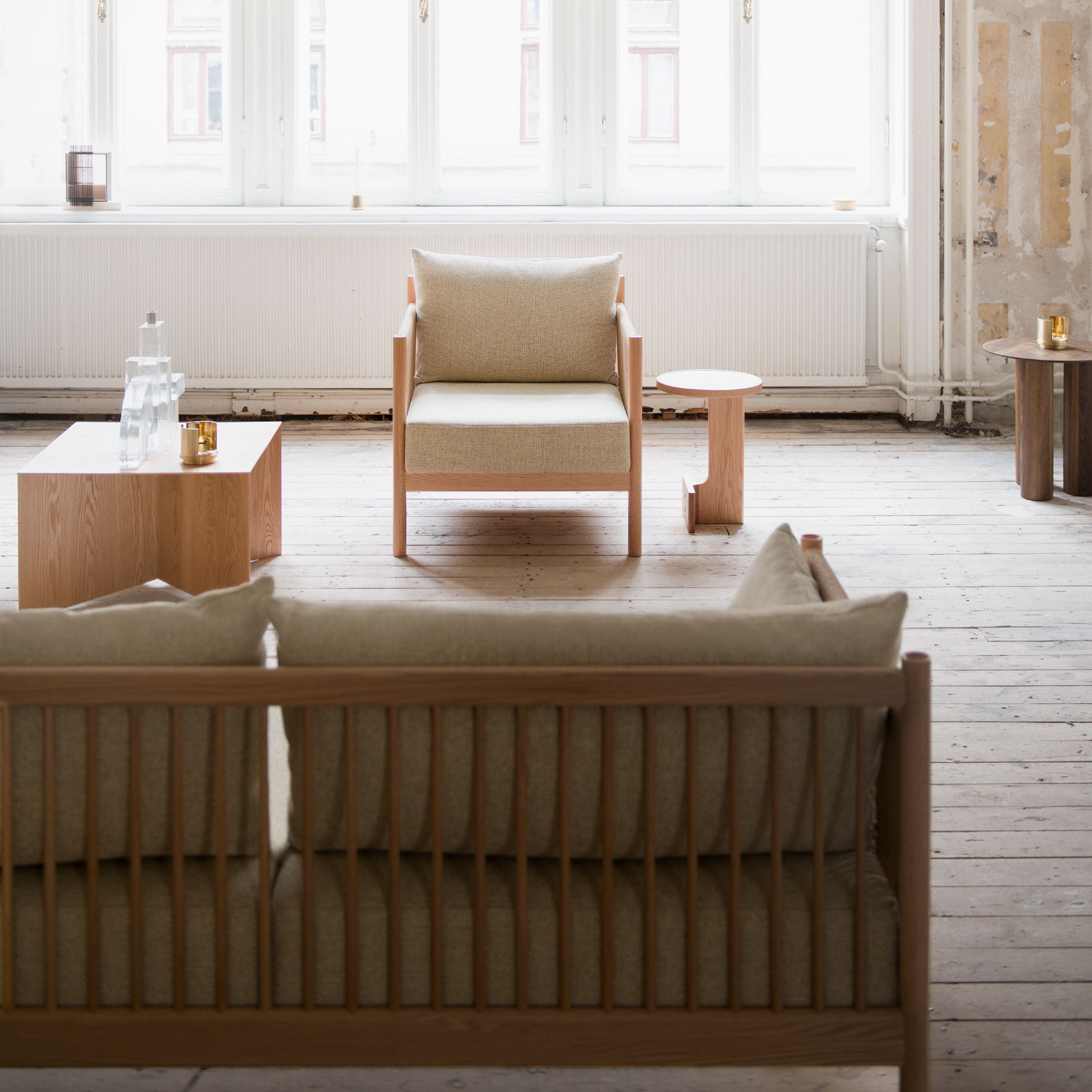 それにボルグ・モーゲンセン、ハンス・ボーリング、フィン・ユールの傑作を少しイメージしながら、伝統的なデンマークの職人が作る家具の要素を組み合わせました。深く低いソファは広くゆったりとした雰囲気のために創作されており、背面の美しい構造は壁面に沿って置いても、空間の中央に置いても完璧です。