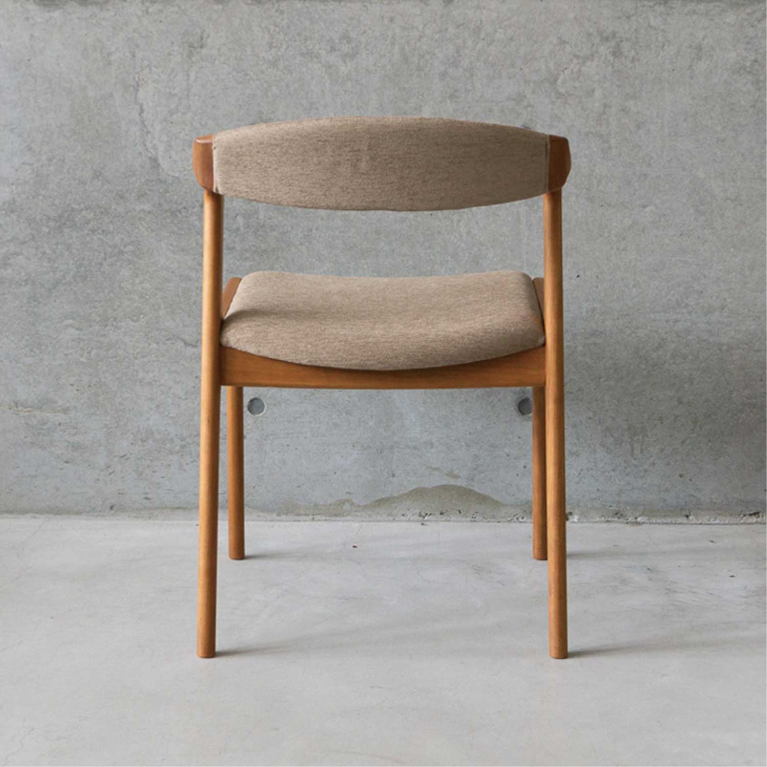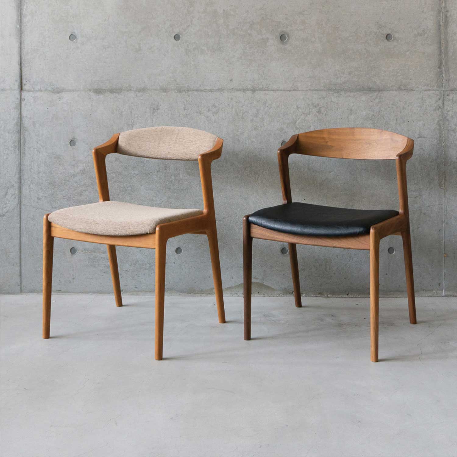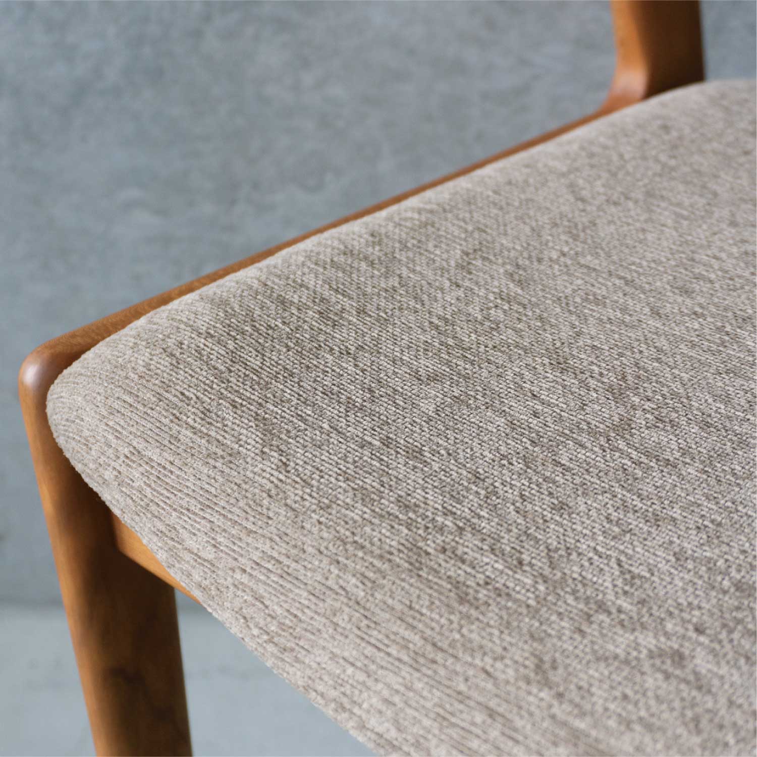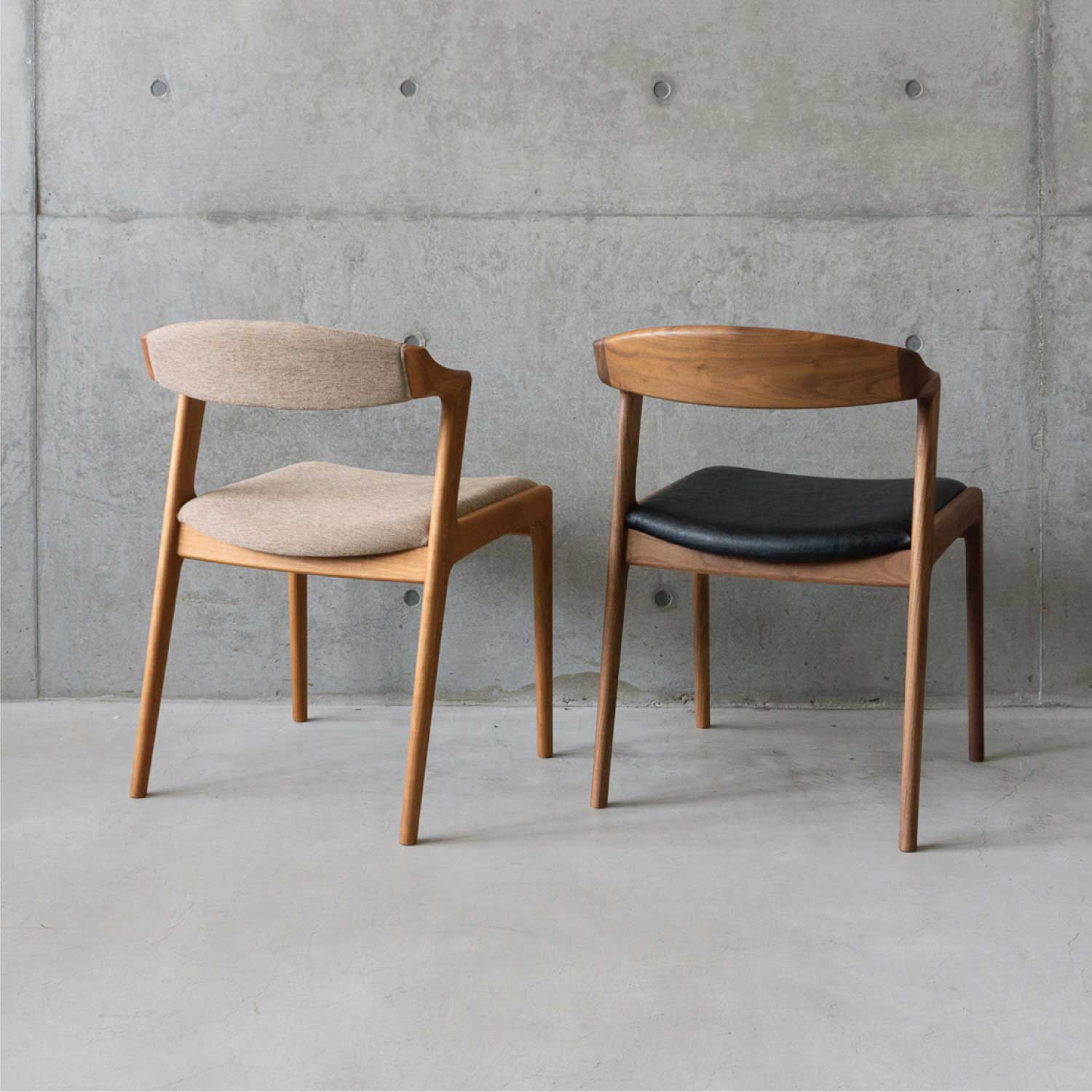 背が無垢材のユナ セミアームチェアに背張りタイプが加わりました。柔らかな背のパッドで座り心地も増しています。小さな肘掛けは出入りし易く便利。コンパクトながらも、ゆったりとした座り心地です。材は4種類が用意され、張り地もいろいろと揃えられています。