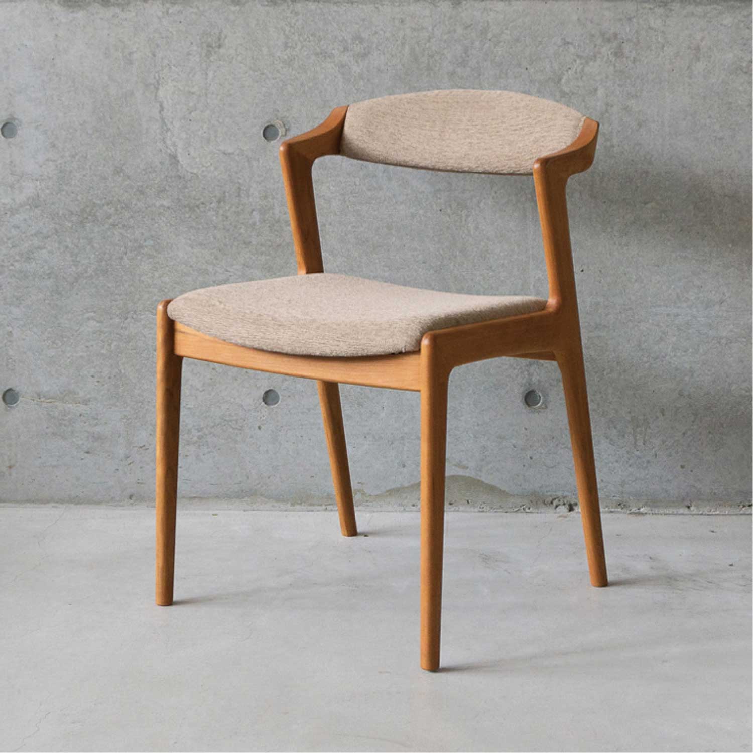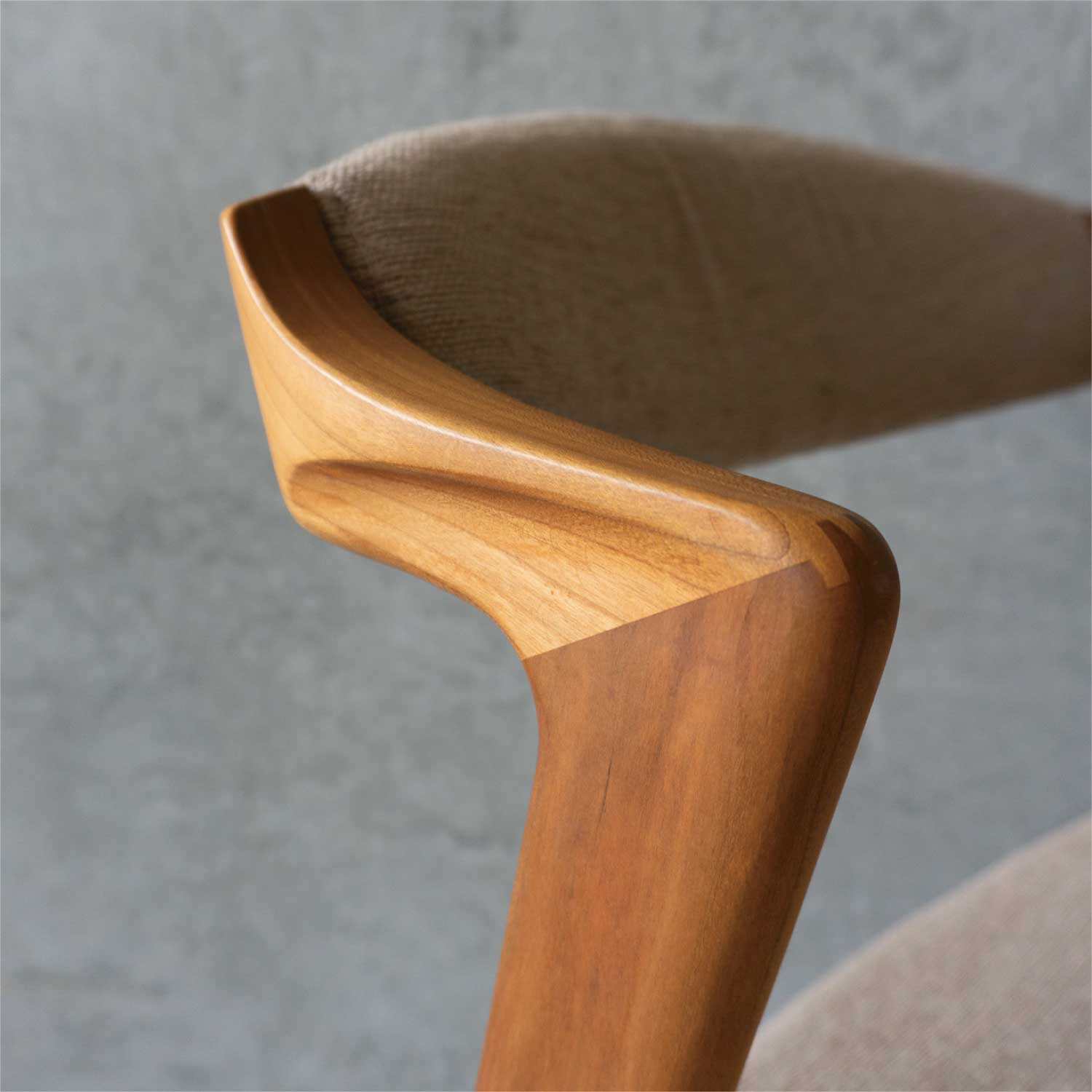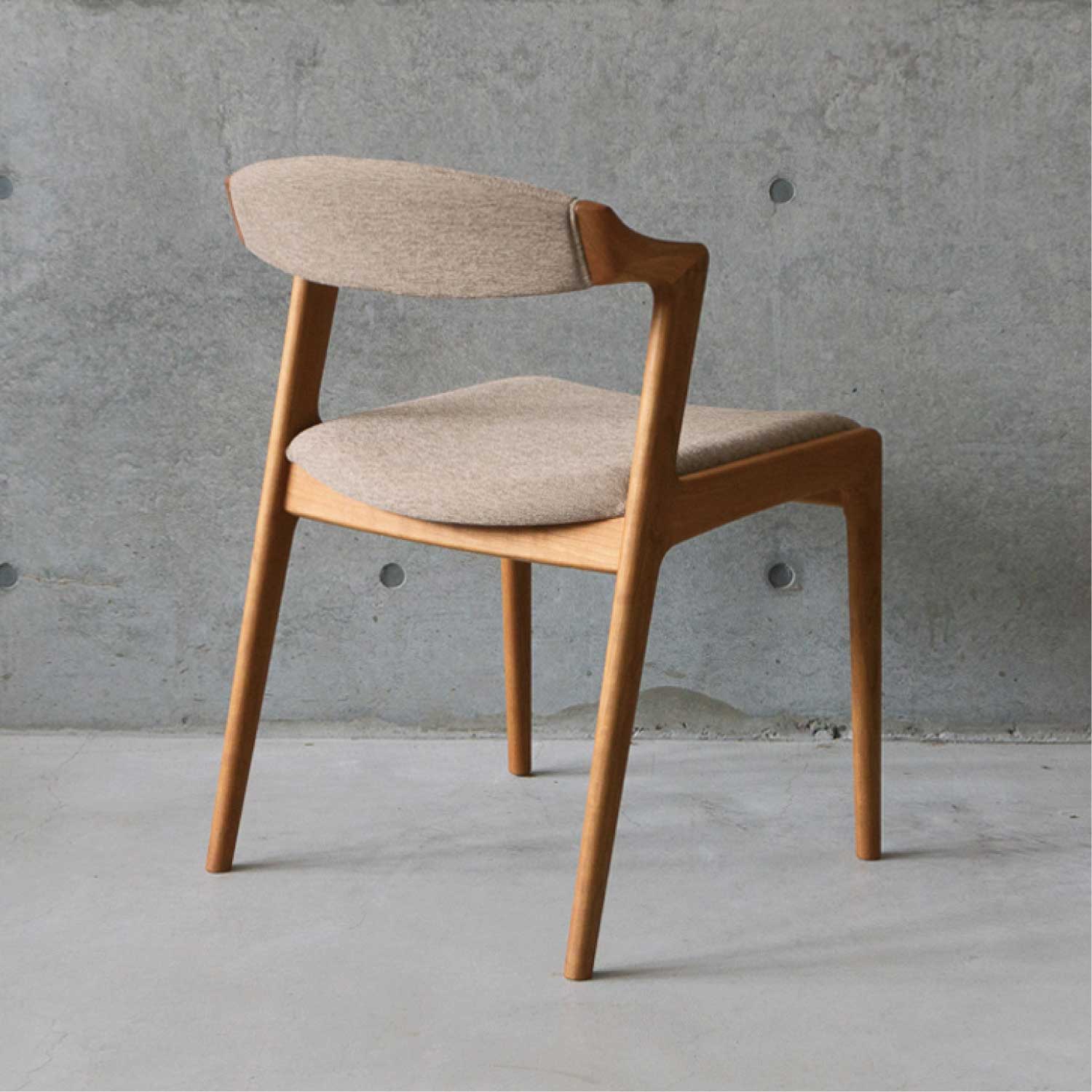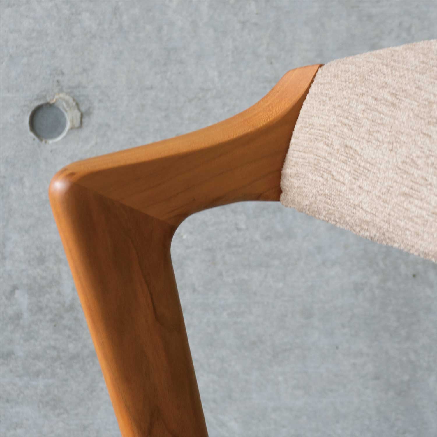 背が無垢材のユナ セミアームチェアに背張りタイプが加わりました。柔らかな背のパッドで座り心地も増しています。小さな肘掛けは出入りし易く便利。コンパクトながらも、ゆったりとした座り心地です。材は4種類が用意され、張り地もいろいろと揃えられています。