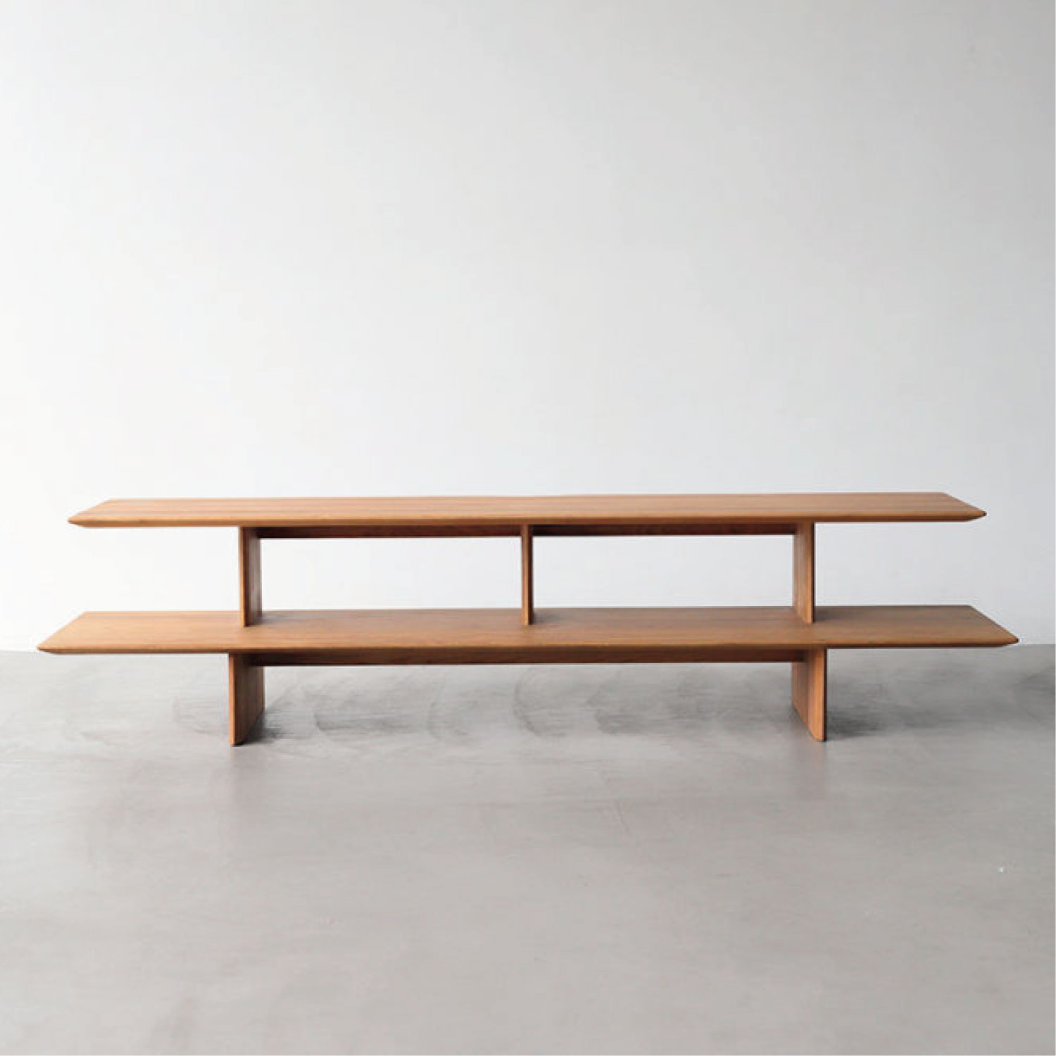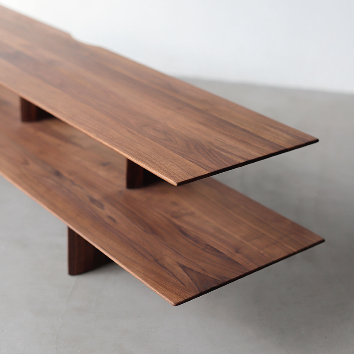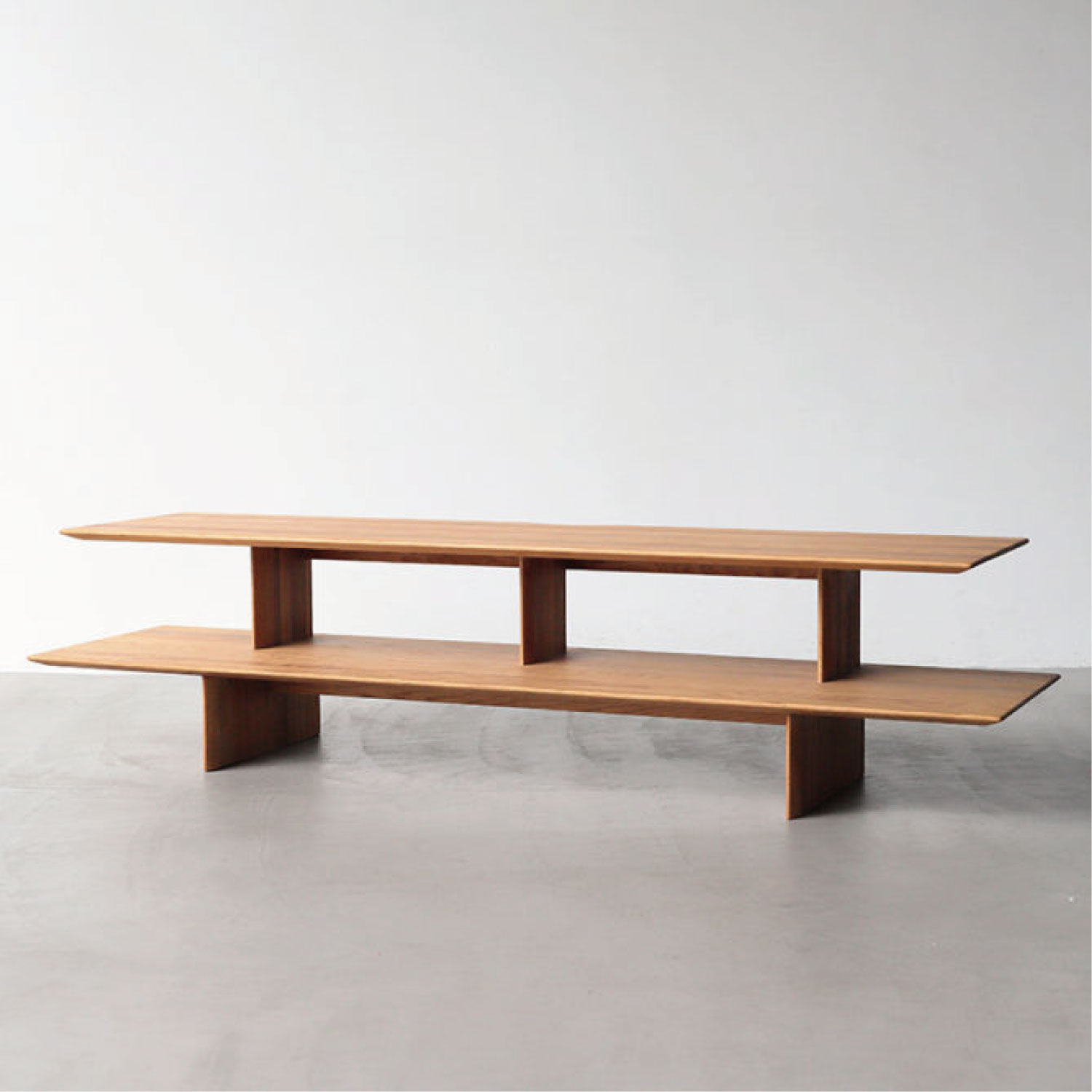 板で構成されたシェルフタイプのローボード。贅沢に使用した無垢板を、繊細なラインに仕上げています。モダンスタイルにも、和モダンスタイルにも馴染むシンプルなデザインです。