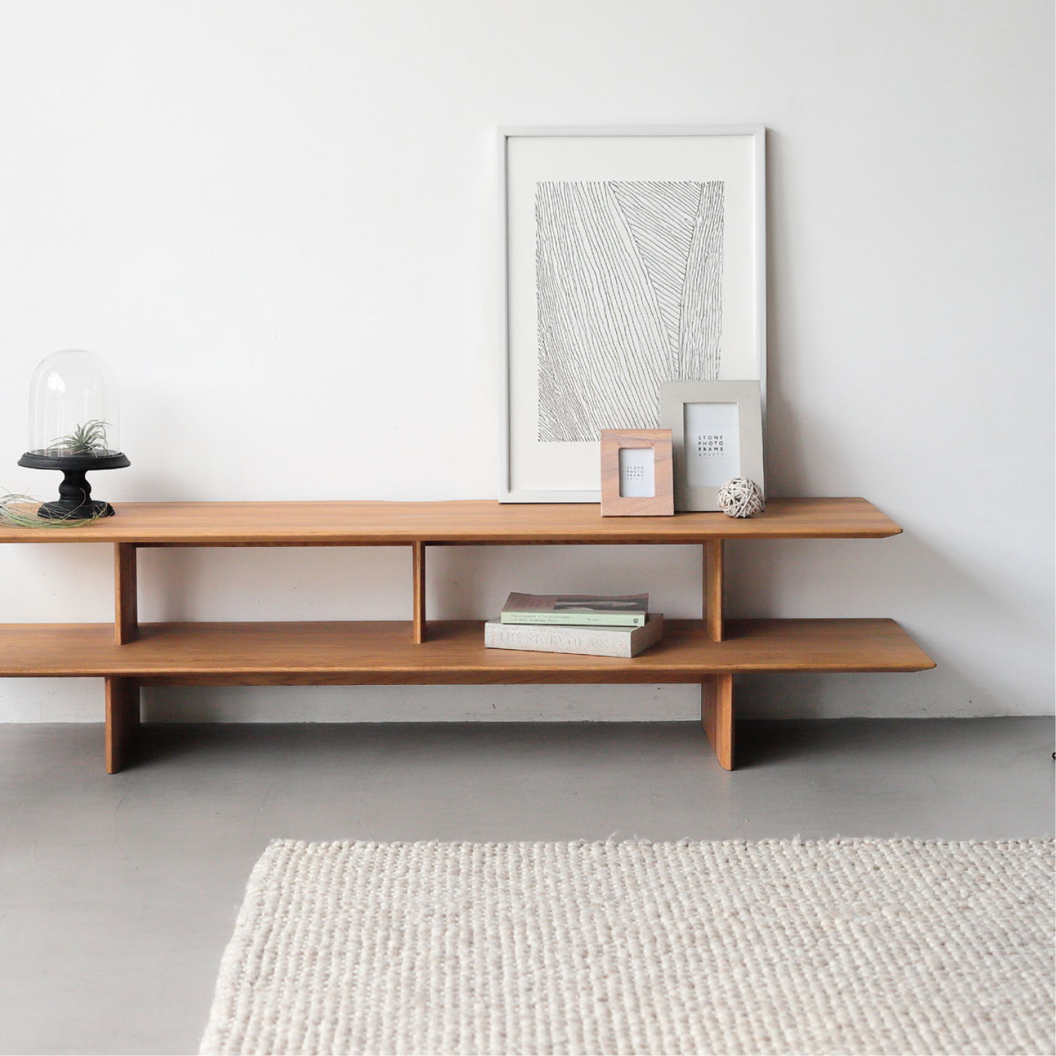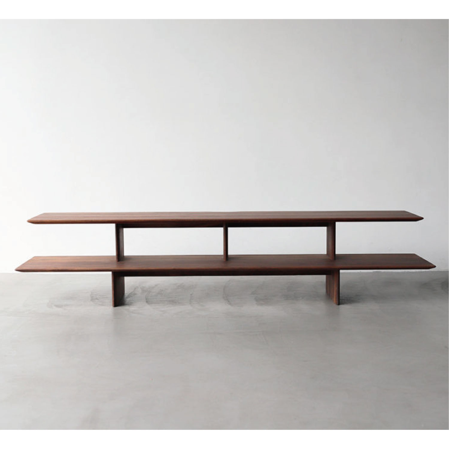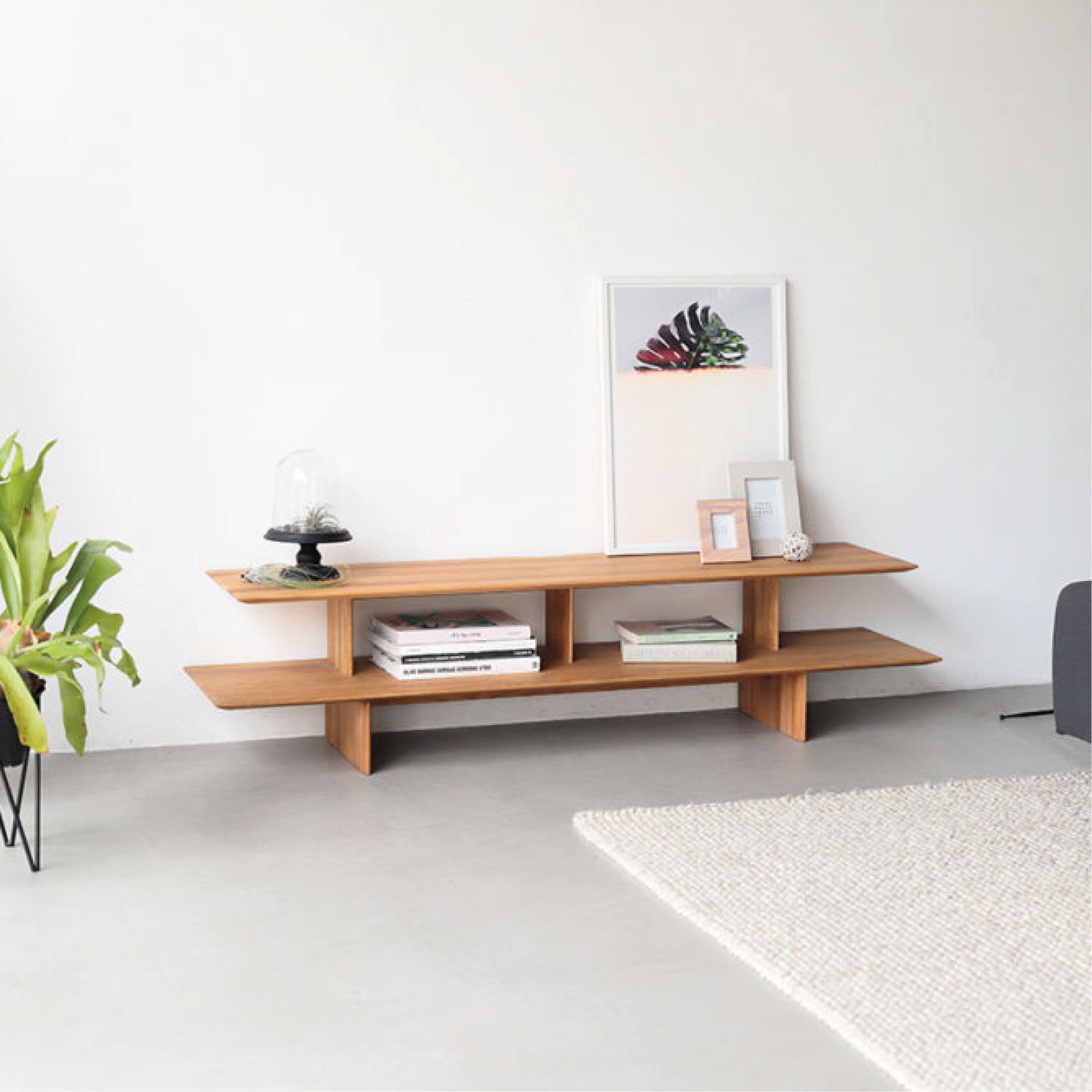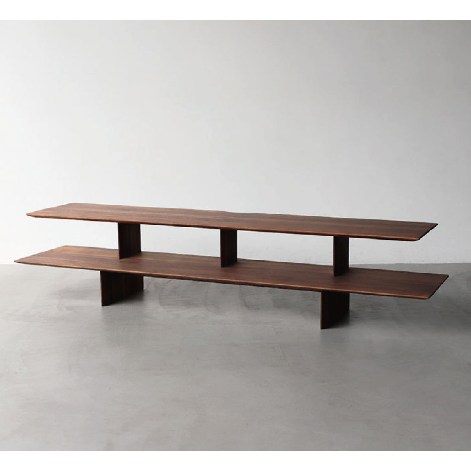 板で構成されたシェルフタイプのローボード。贅沢に使用した無垢板を、繊細なラインに仕上げています。モダンスタイルにも、和モダンスタイルにも馴染むシンプルなデザインです。