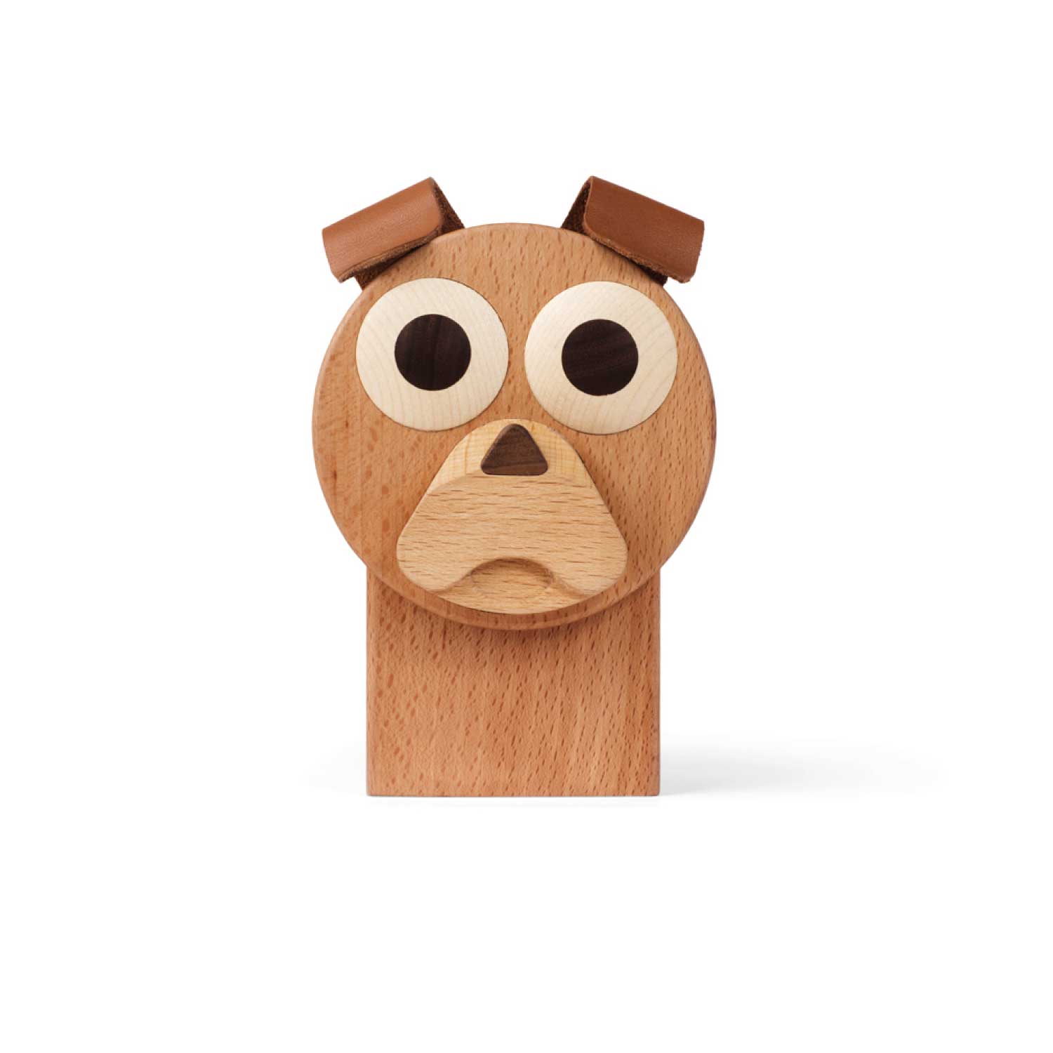 ユニークな木製の貯金箱です。頭の上からコインを投入します。後ろのしっぽ部分を引っ張ると頭が外れ、コインを取り出すことが出来ます。