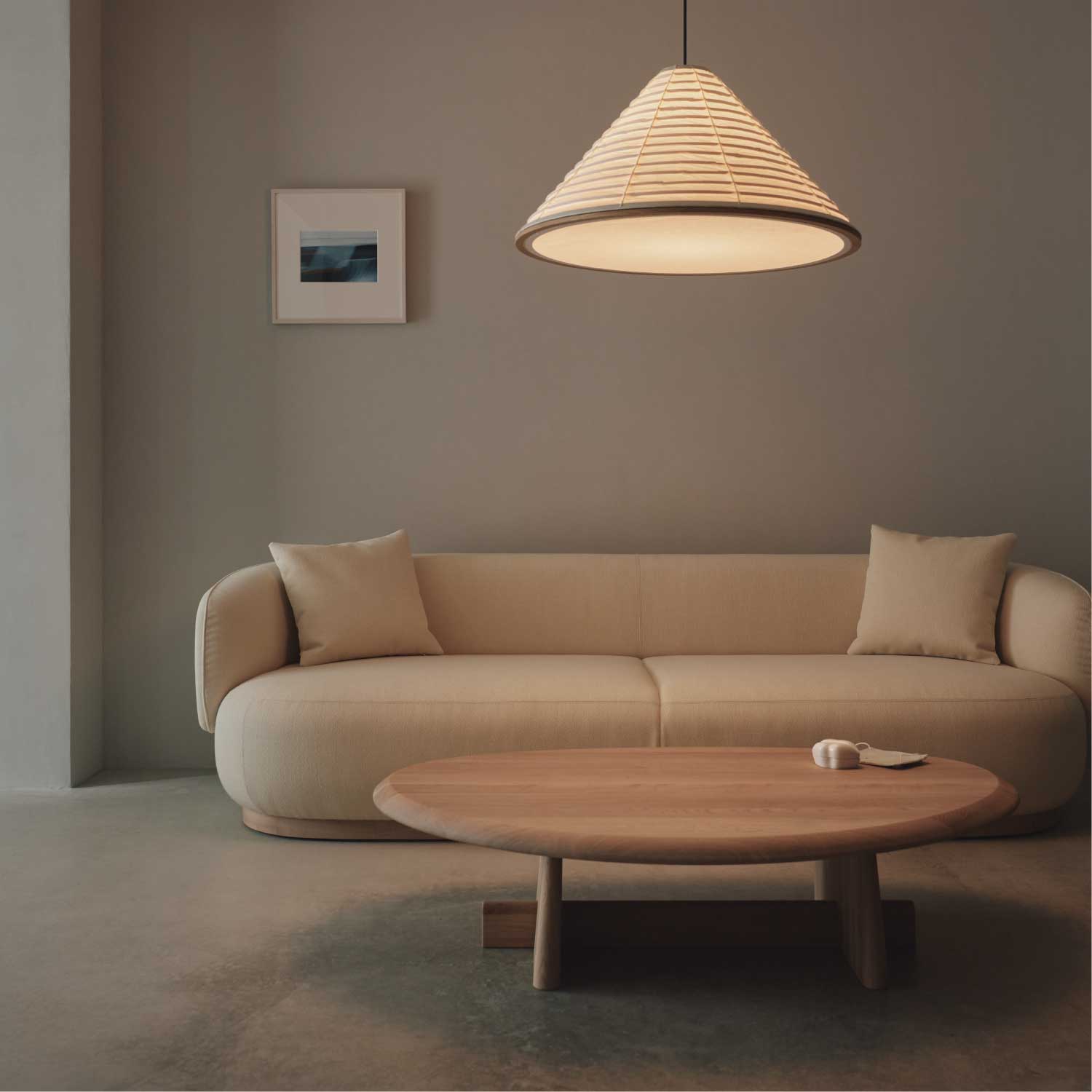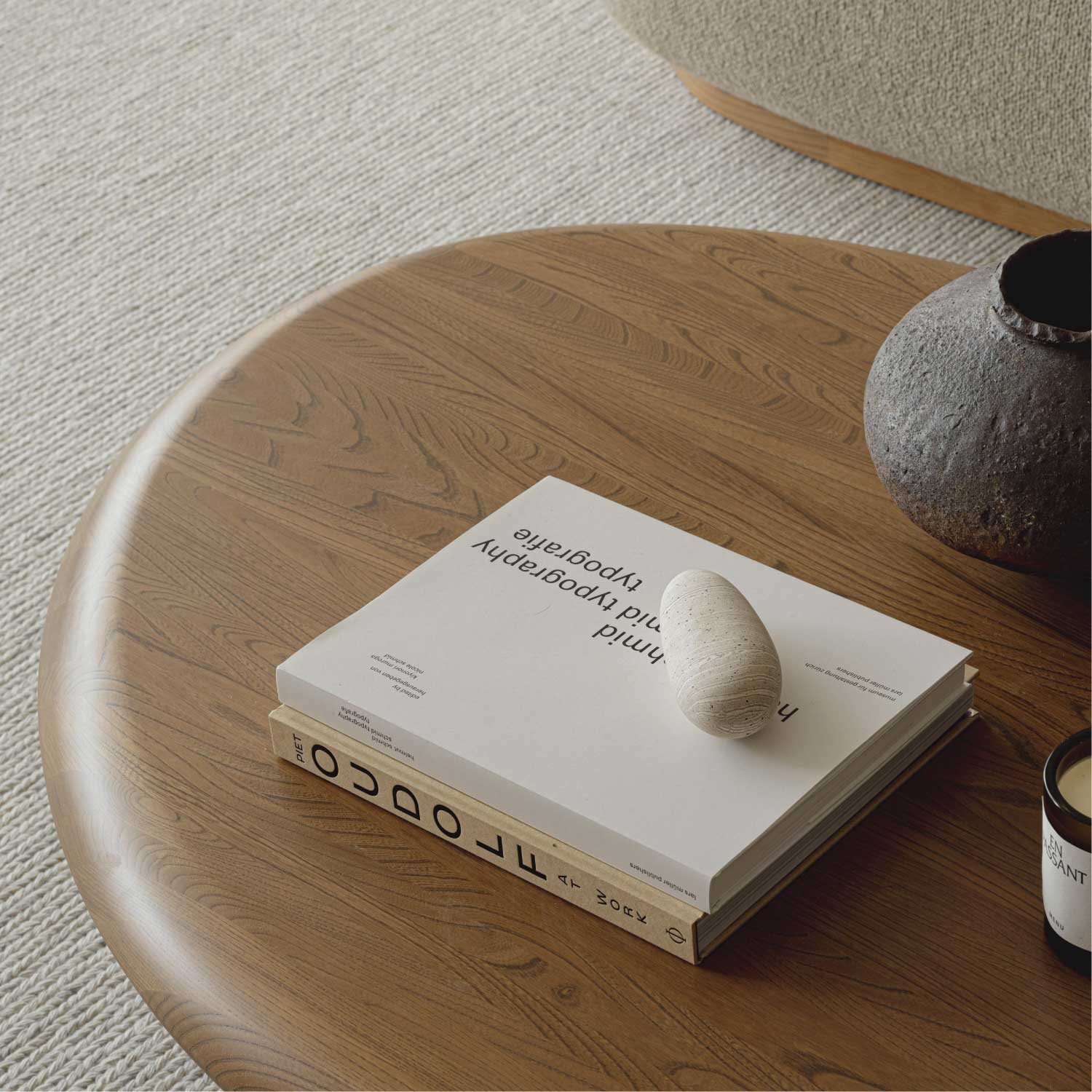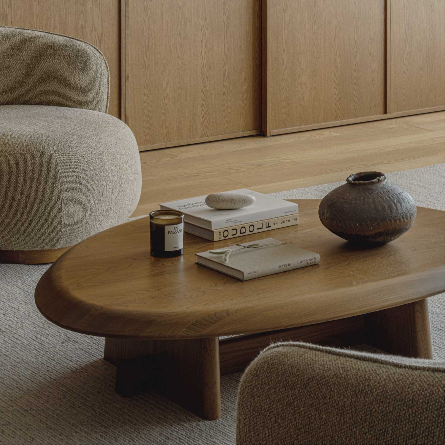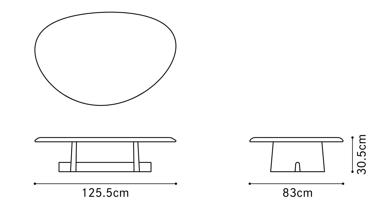 センターピースとしての存在感を際立たせたアシンメトリーなコーヒーテーブル。安定感のある脚部が支える天板の有機的なフォルムは、表情豊かな天然木の素材感と相まって、彫刻を思わせるような美しさがあります。四角いテーブルに比べて、レイアウトの自由度が高いのも特徴です。