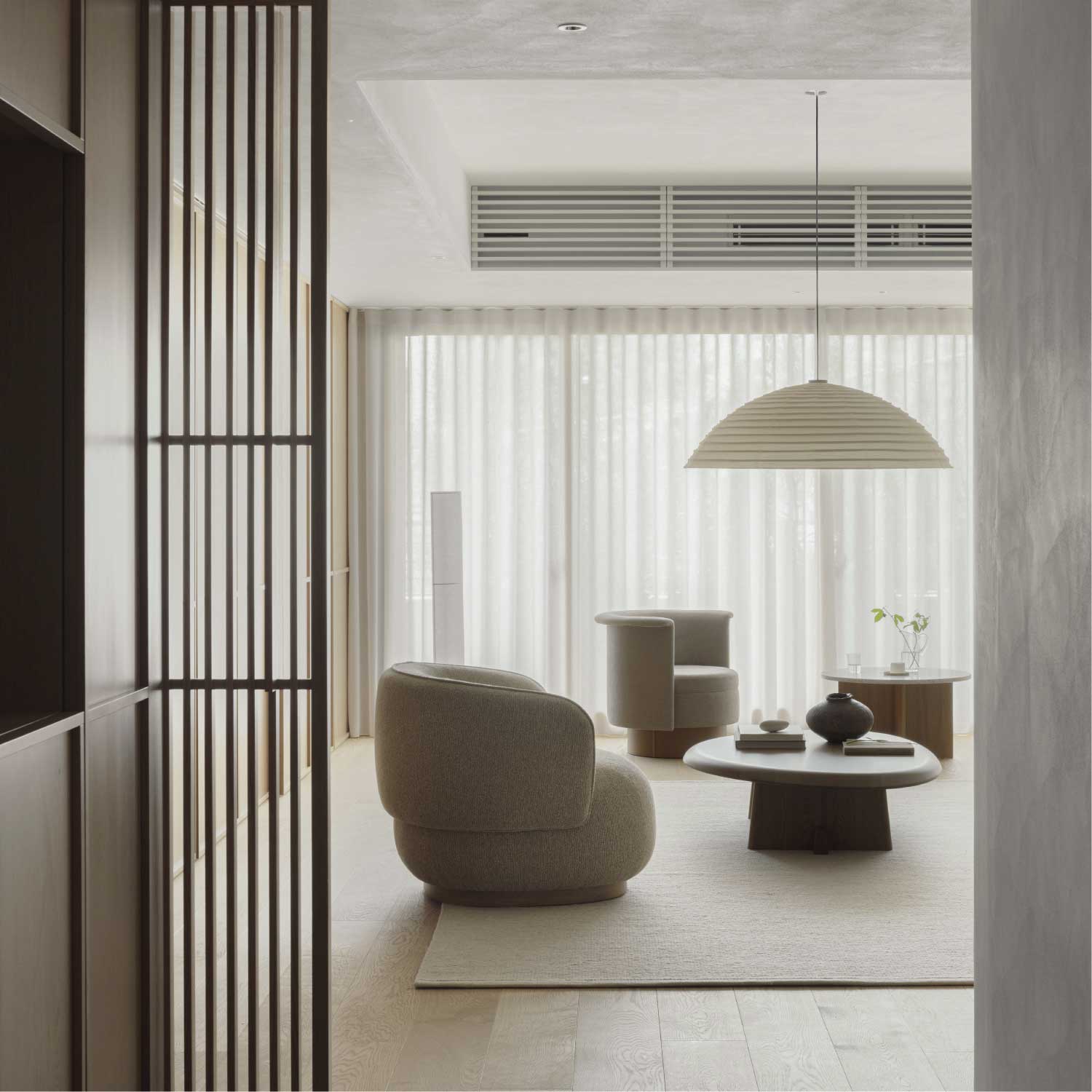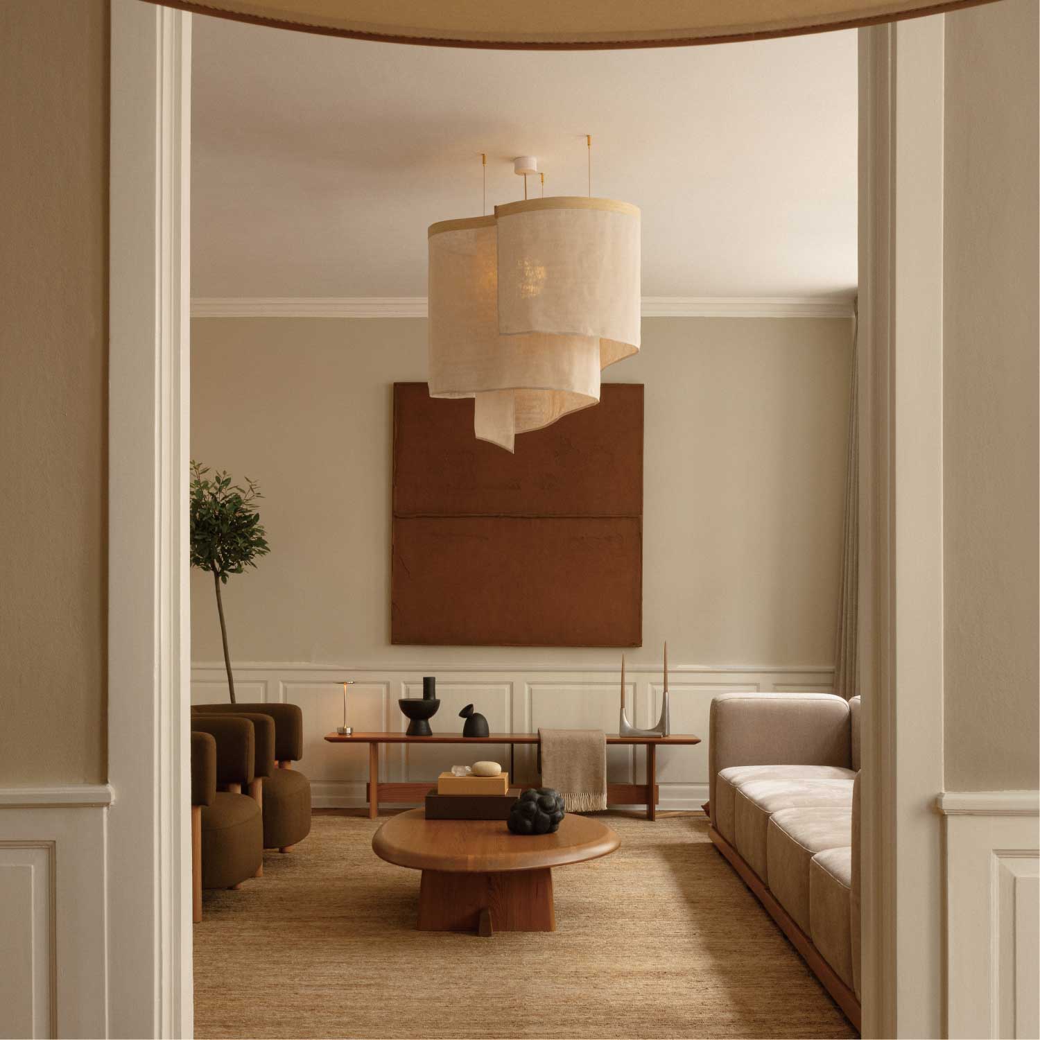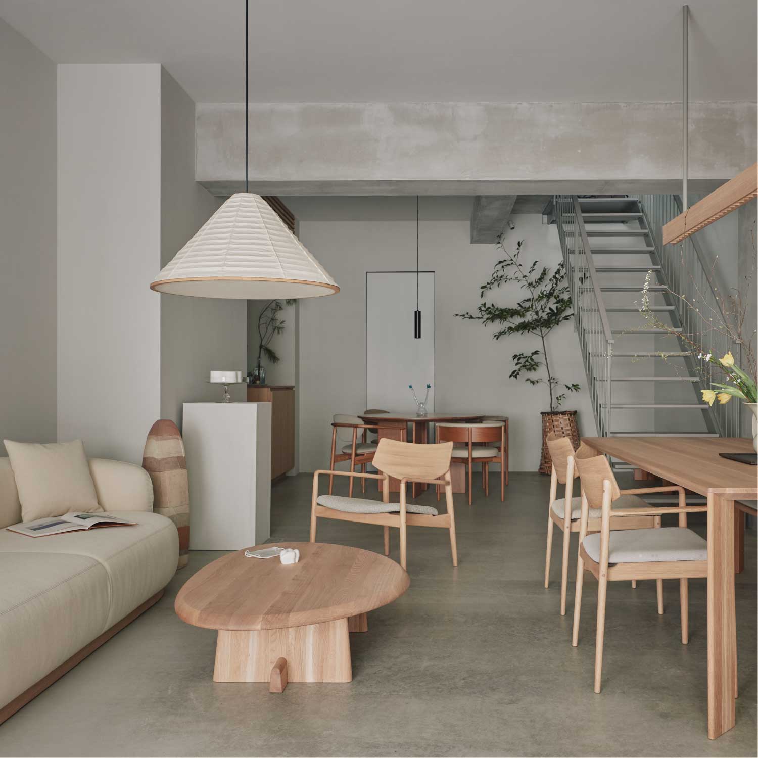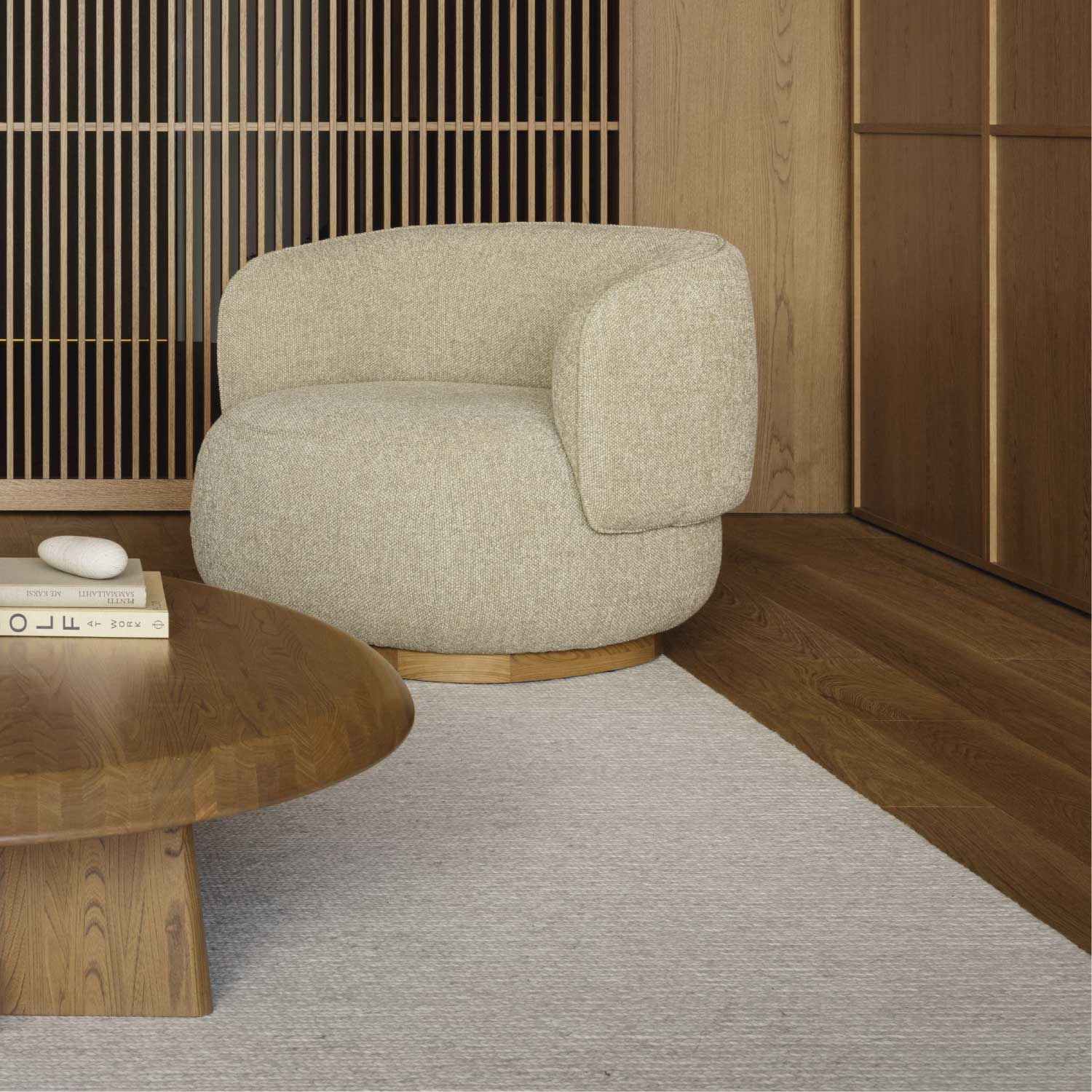センターピースとしての存在感を際立たせたアシンメトリーなコーヒーテーブル。安定感のある脚部が支える天板の有機的なフォルムは、表情豊かな天然木の素材感と相まって、彫刻を思わせるような美しさがあります。四角いテーブルに比べて、レイアウトの自由度が高いのも特徴です。