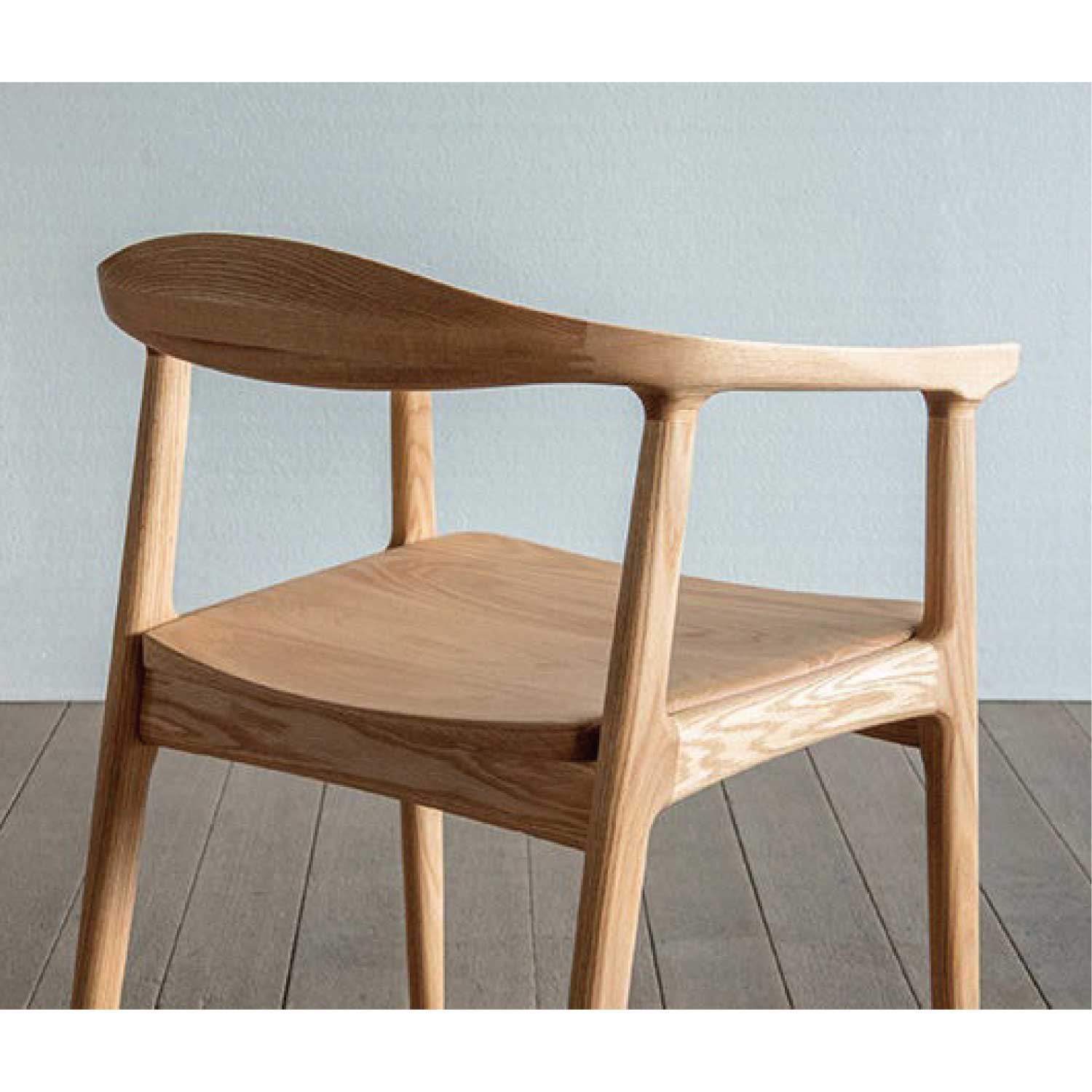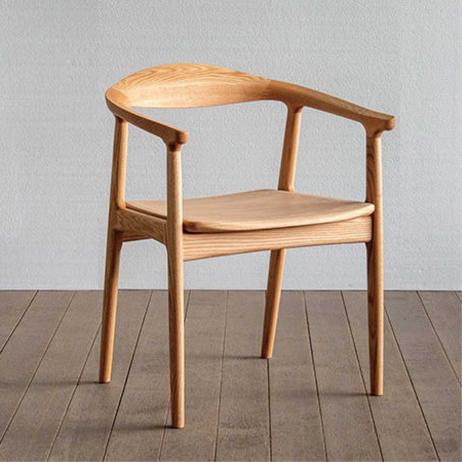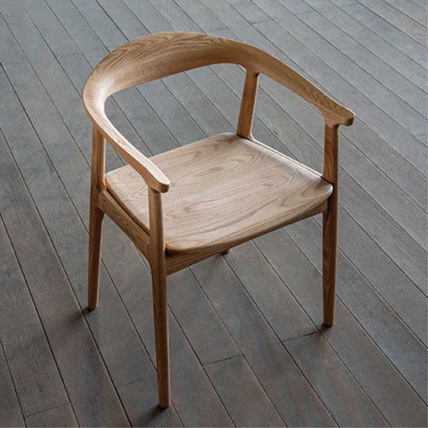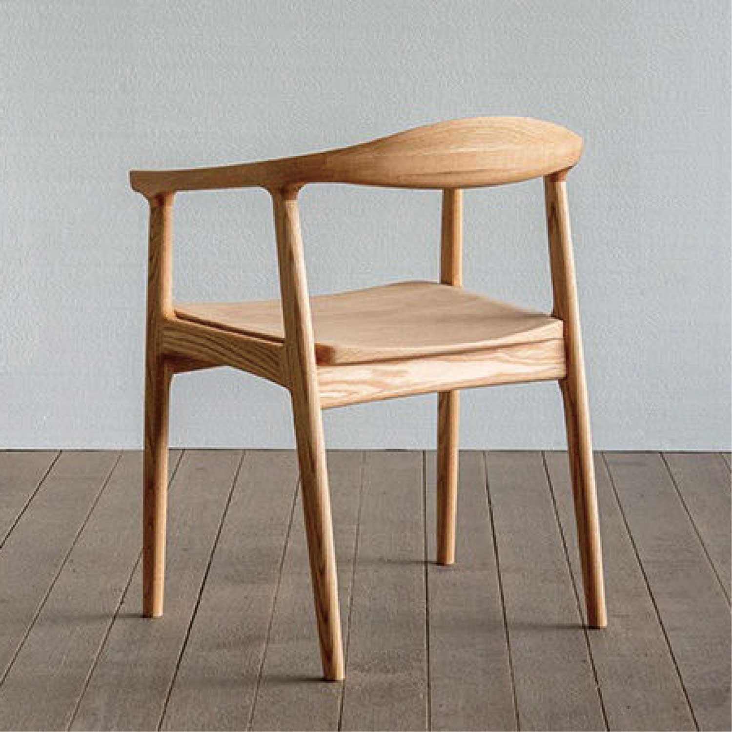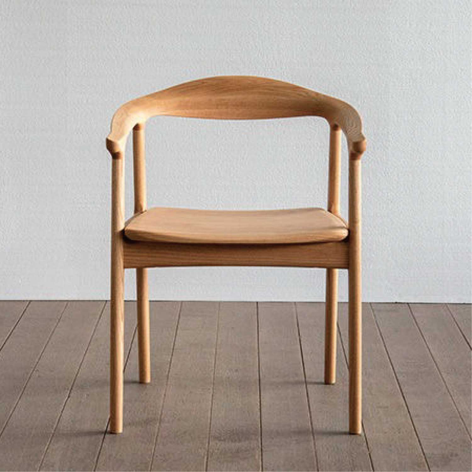 無垢材を馬蹄形に削り出したオメガチェアの板座タイプです。接合部はフィンガージョイントで組まれています。脚との接合部も面取りで一体にしていますので、手触りも滑らか。座面も無垢材を大きなカーブに削り込んで作っています。材は4種類から選べます。張地もいろいろと揃えられています。