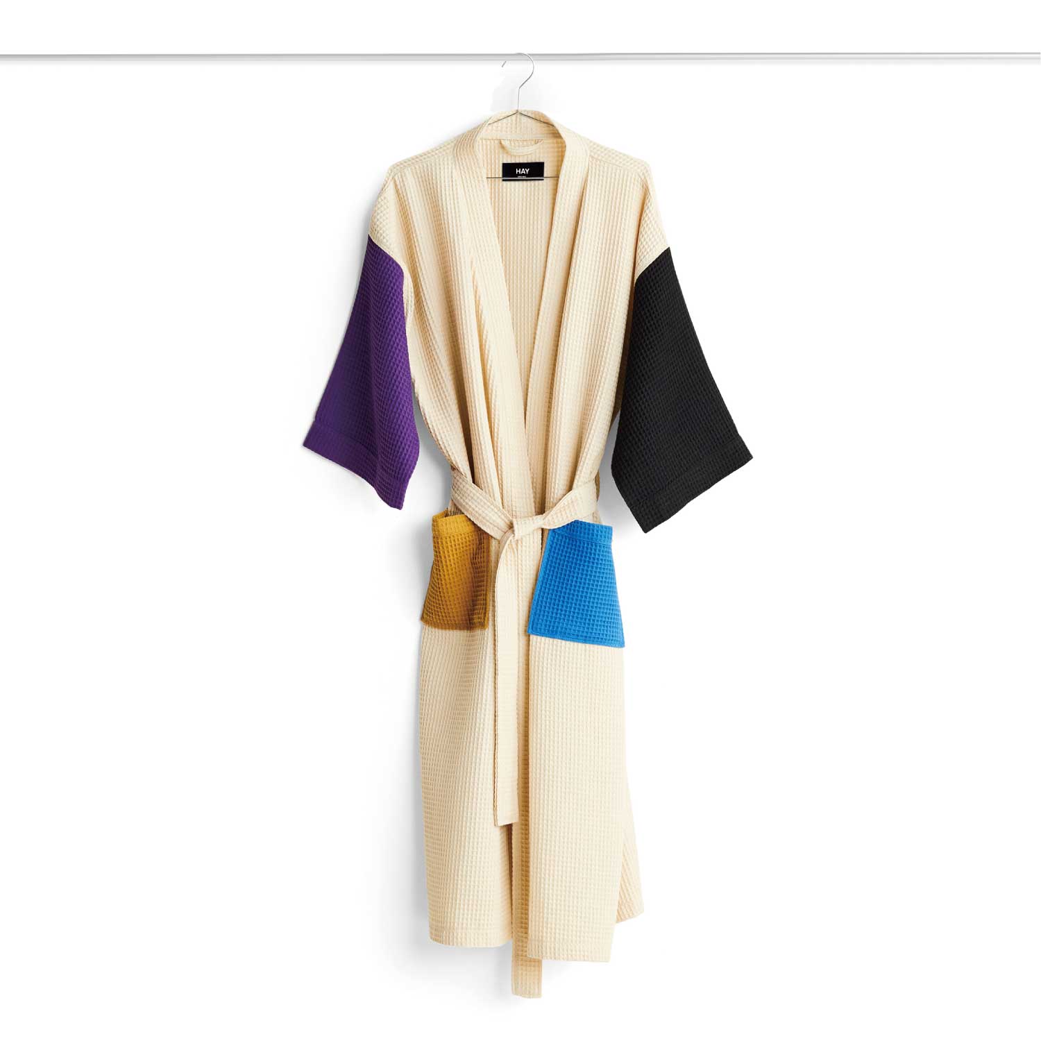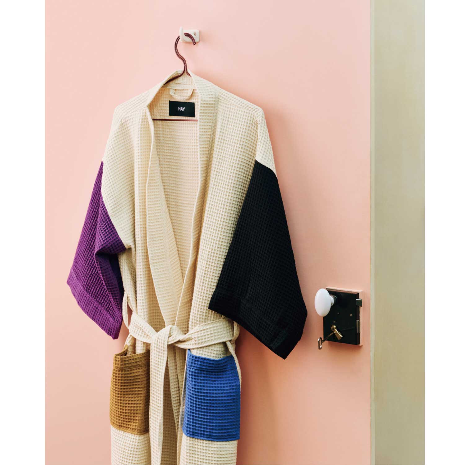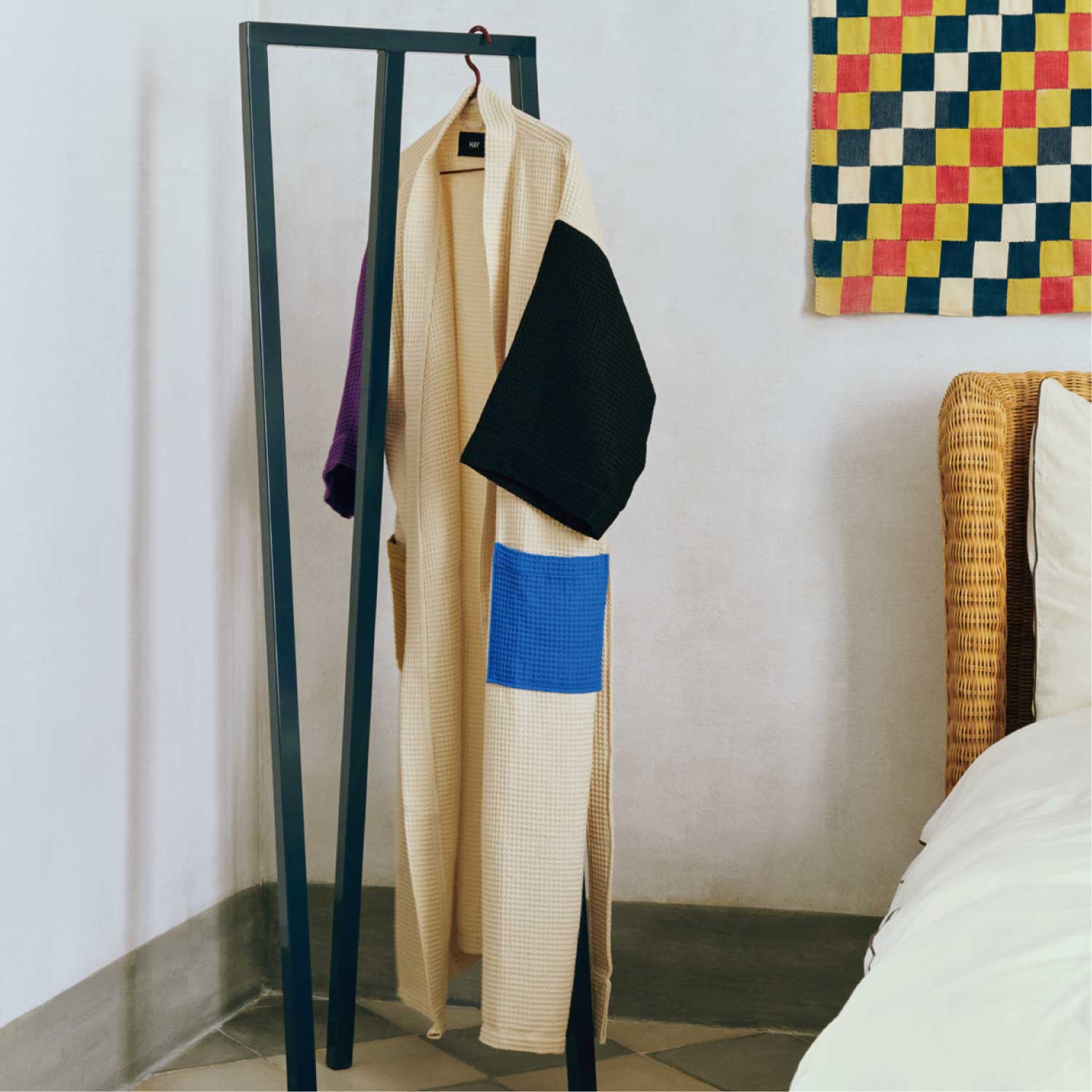 立体的なワッフル織りが特徴的な、ユニセックスでお使いいただけるバスローブです。ゆったりとした形とポケット、バスローブと同色のベルトが目を引くこのバスローブは、家の中でもビーチでもプールサイドでも使える、スタイリッシュで機能的なデザインに仕上げています。
