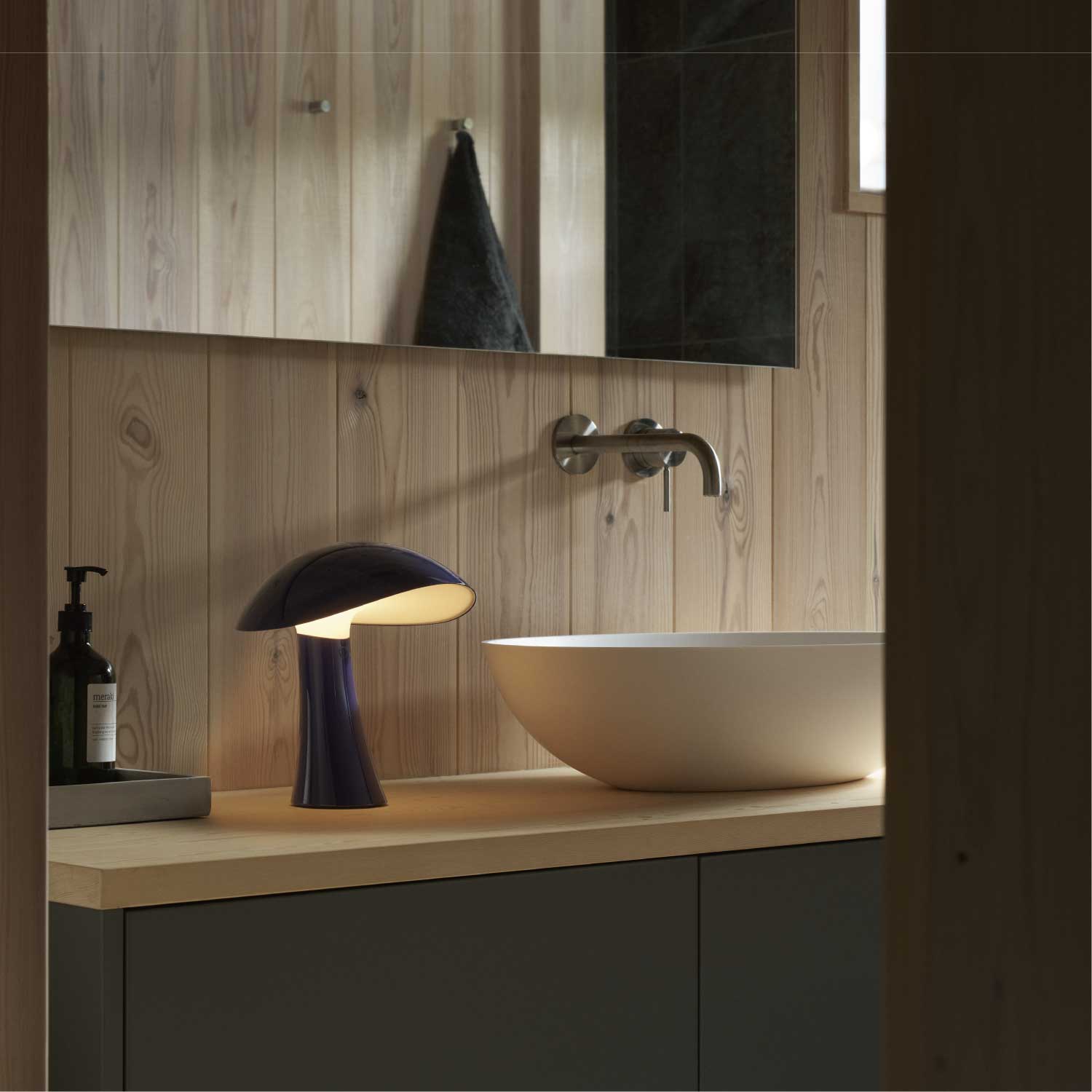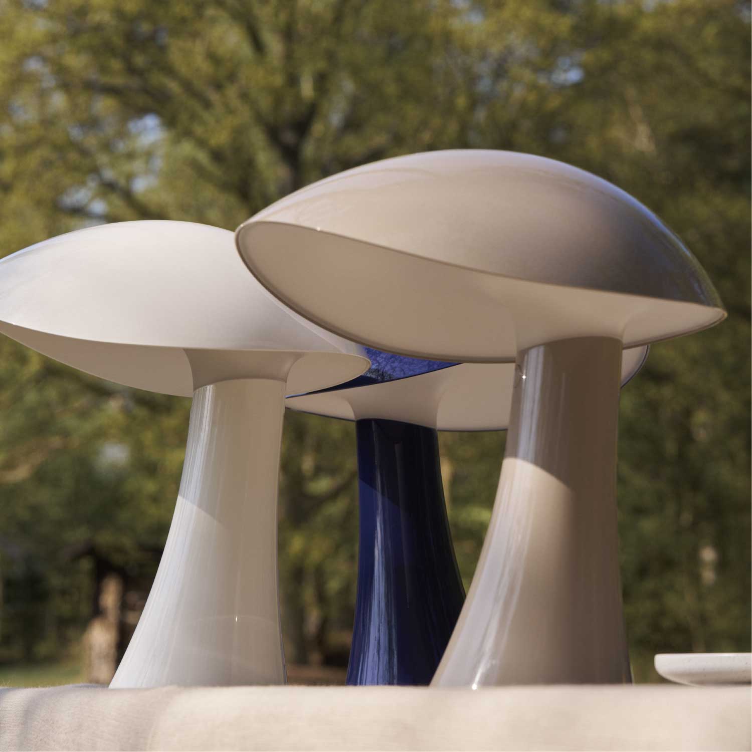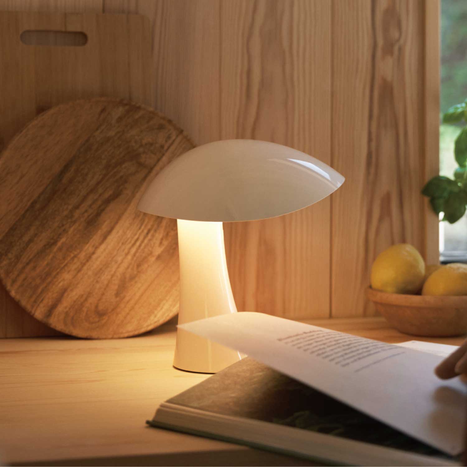 ガブリエル・タンは、大きな帽子のうねるような曲線からRumee ポータブルランプを着想しました。そのデザインは自然界の要素を想起させ、彫刻的です。近い位置から卓上を照らしますが、卓上面での反射光が間接照明となって周囲を柔らかく照らします。下面にはディフューザ―が装着され、グレアがなく、調光も可能です。Rumee ポータブルランプは見た目に美しいだけでなく、持ちやすく、場所から場所に手軽に持ち運ぶことができます。