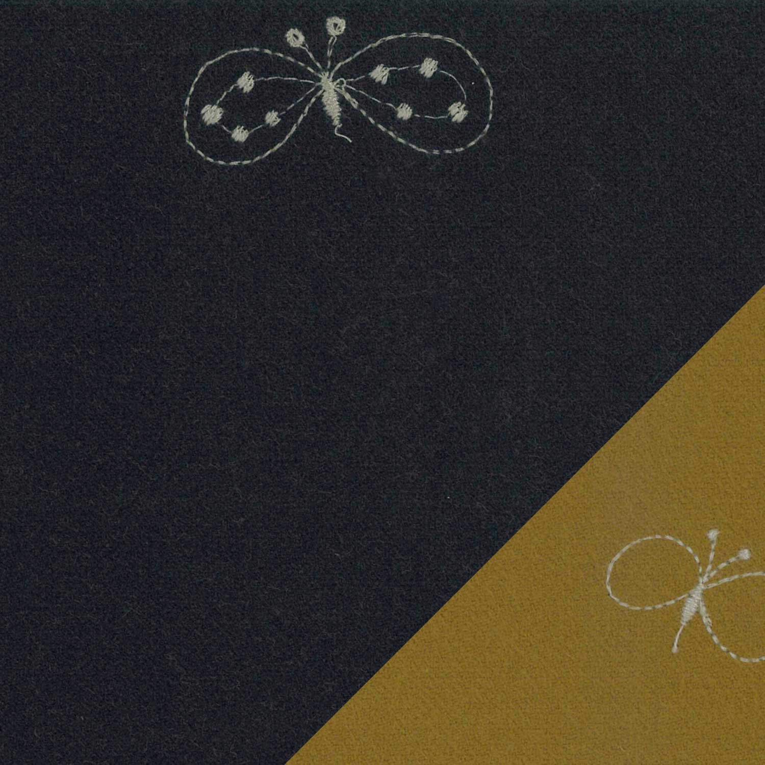 当店でお取り扱いするミナペルホネンの生地(タンバリン、チョウチョ、ライトベリー)は、すべて ダブルフェイス(両面使える構造) のテキスタイルです。これは、表と裏でカラーが異なる2面を持つ仕様となっており、どちらの面を「表(前面)」として使うかをお選びいただけます。左上に表面、右下に裏面の生地を表示しております。