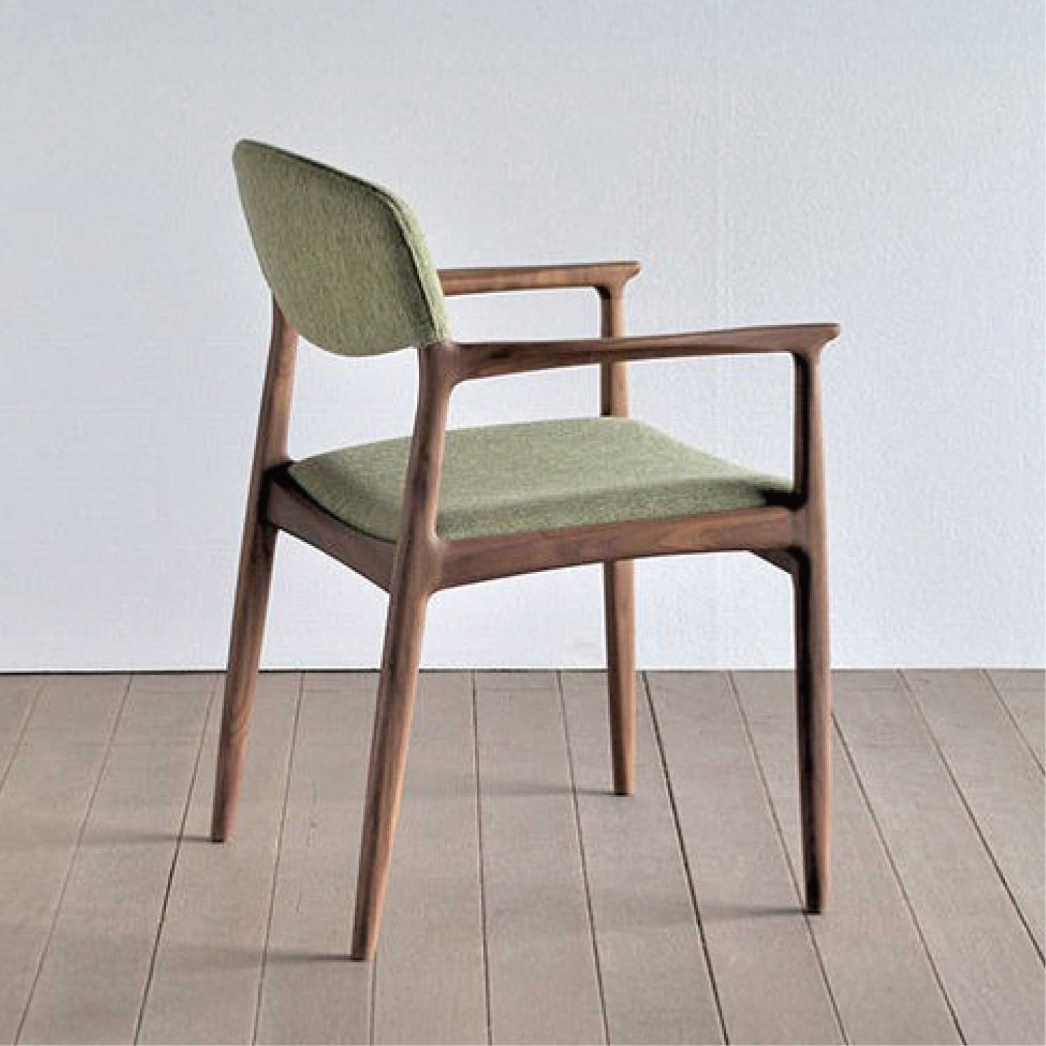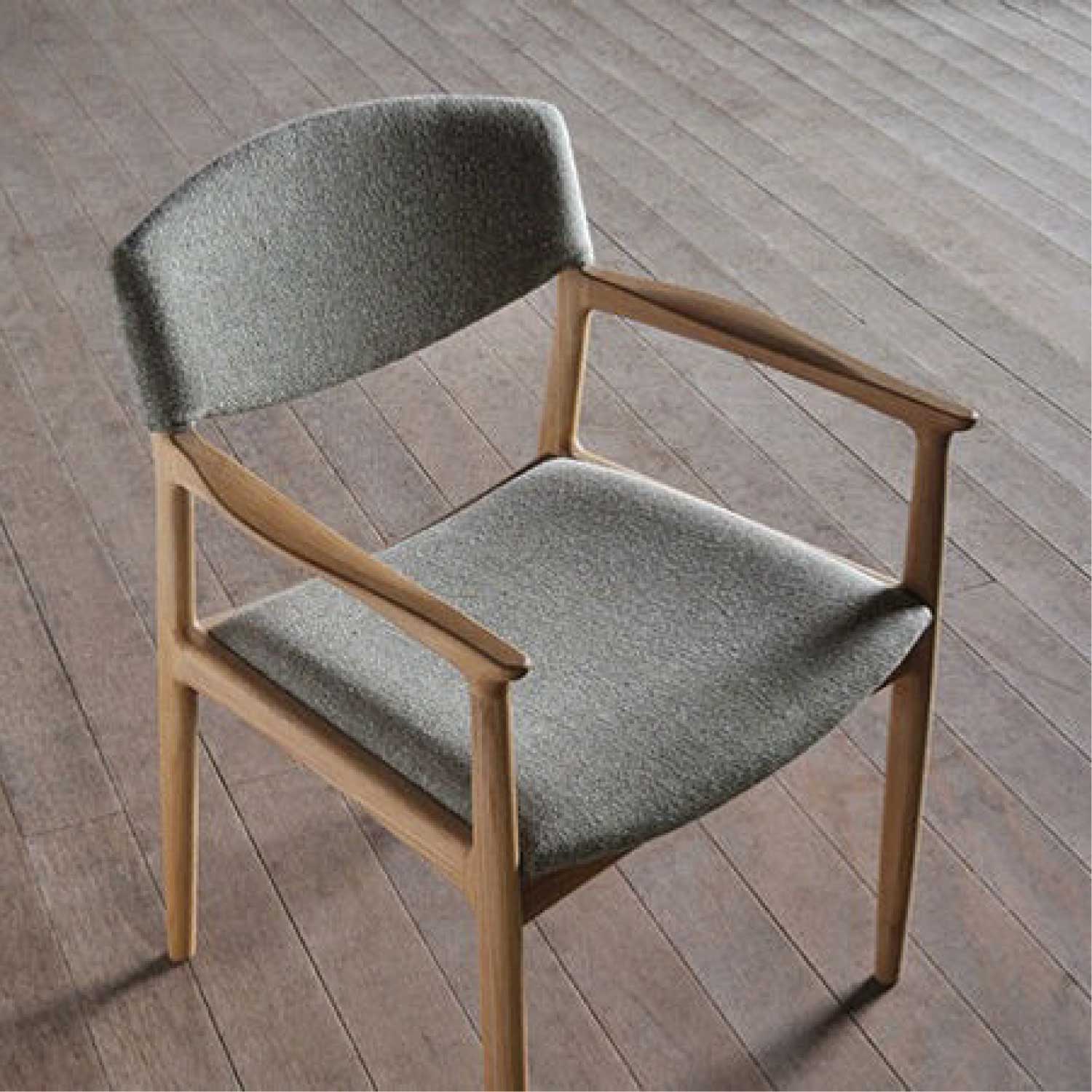 ムク材を削り出し、手仕事で仕上げた軽快なイメージのアームチェアです。柔らかな手触りと、ギリギリまで細身に仕上げたフォルムが特徴。貼り込まれた大きなカーブの背と座もゆったりと身体を受け止めてくれます。材は4種類より。張り地もいろいろと揃えられています。