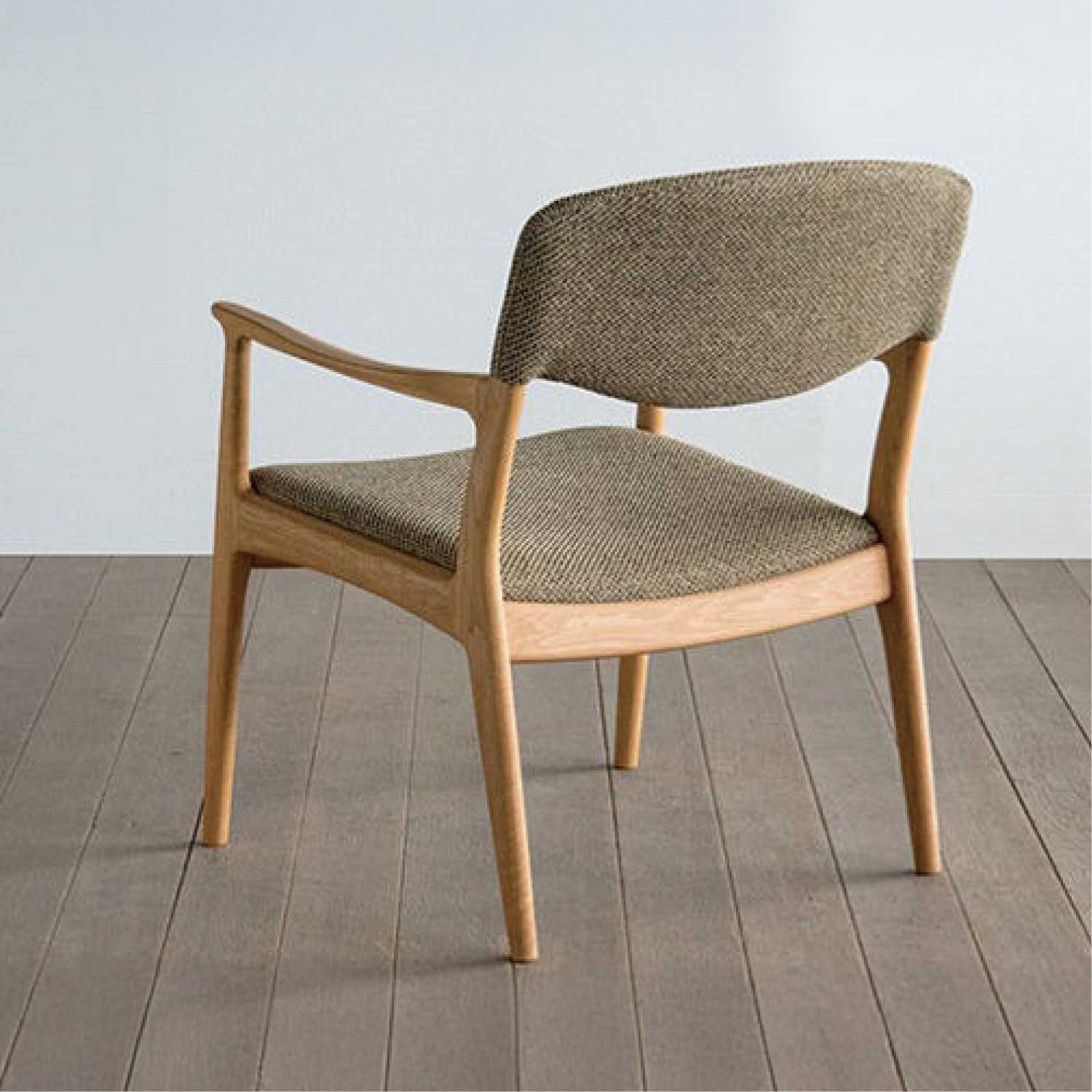 ノースダイニングチェアのラウンジタイプです。ムク材を削り込み細身に仕上げたフレームが軽快です。貼り込まれた大きなカーブの背と座もゆったりと身体を受け止めてくれます。オットマンや、小脇にモノがおけるサイドテーブルも用意されています。材は4種類から選べます。