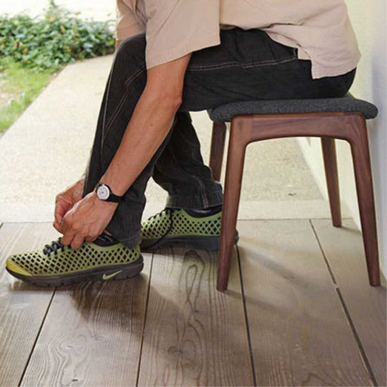 ノースラウンジチェアのオットマンですが、単独でスツールとしても使えます。玄関先でのシューズスツールとしても最適です。奥行きはコンパクト、間口はワイドで、大きなカーブの座板がもゆったりと身体を受け止めてくれます。材は4種類から選べます。
